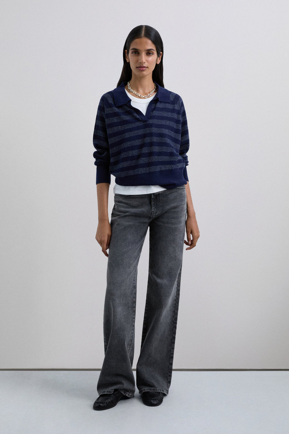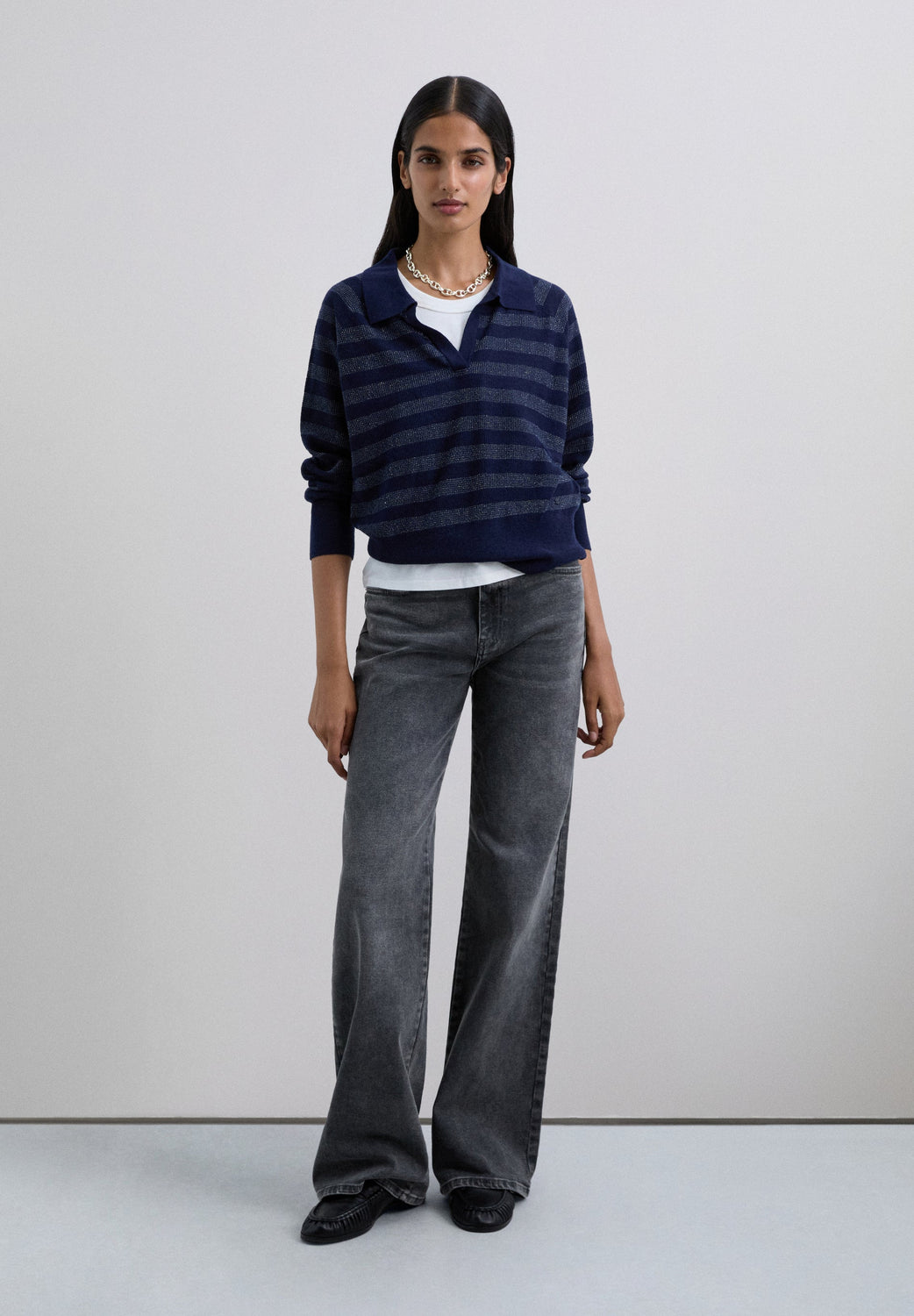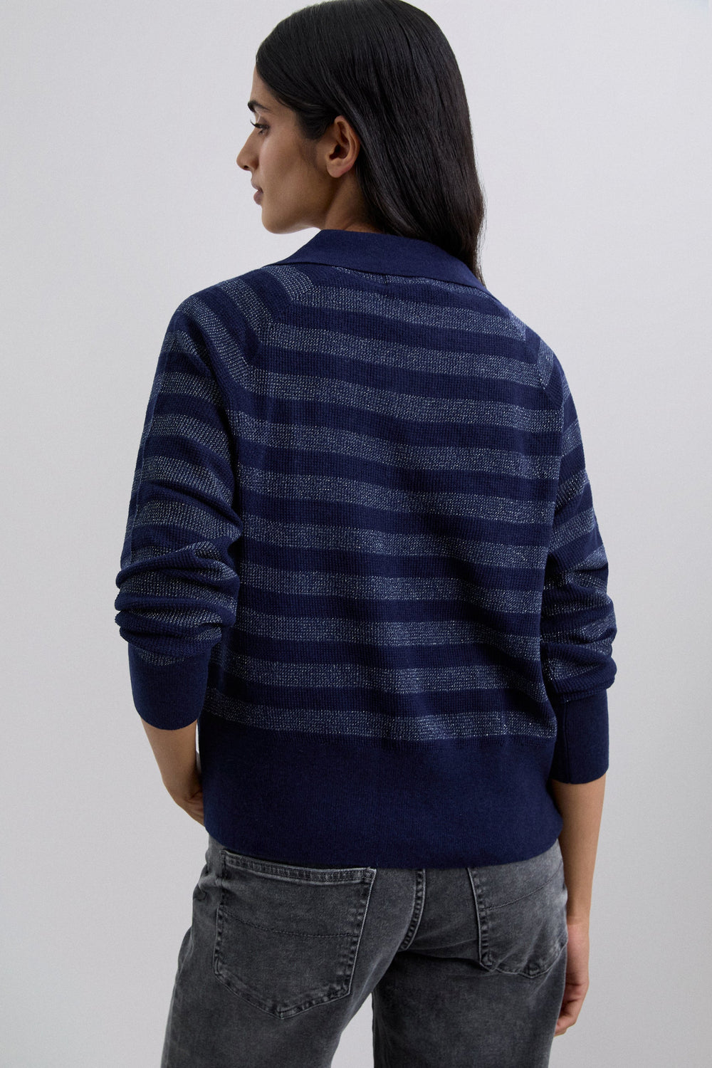 Polo shirt-style sweater made of a wool blend. Regular fit. Striped print with metallic thread. Polo shirt collar. Long sleeves with ribbed cuffs.