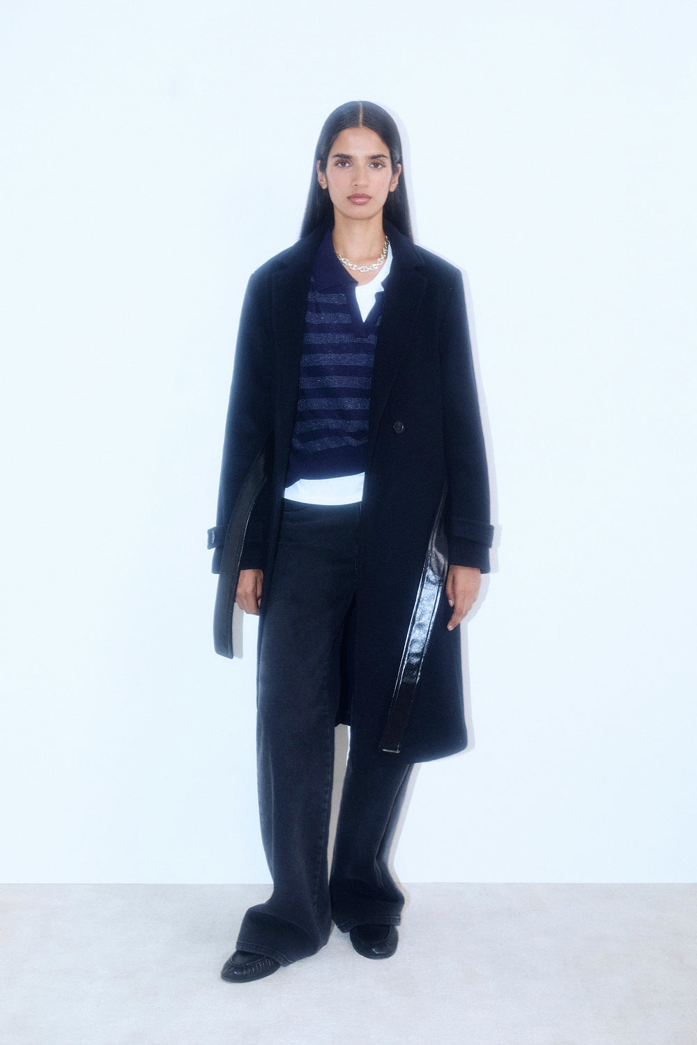 Black mid-rise trousers with belt loops. Full length, front zip and button fastening. Back and front pockets.