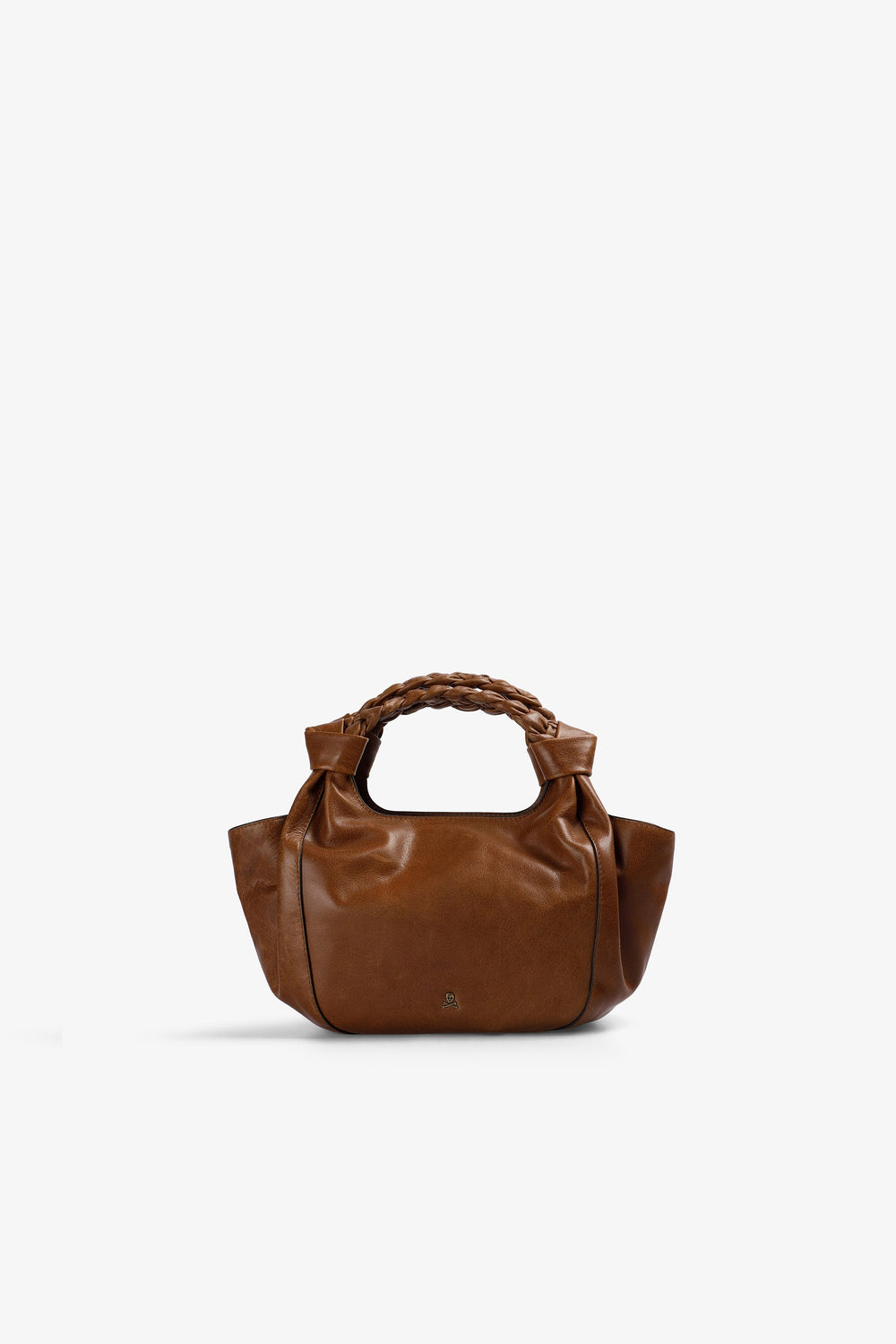 Handbag made of 100% leather with knotted braided handle detail. Lined with inner pocket, zip closure. Metal logo on the front Double handle option.