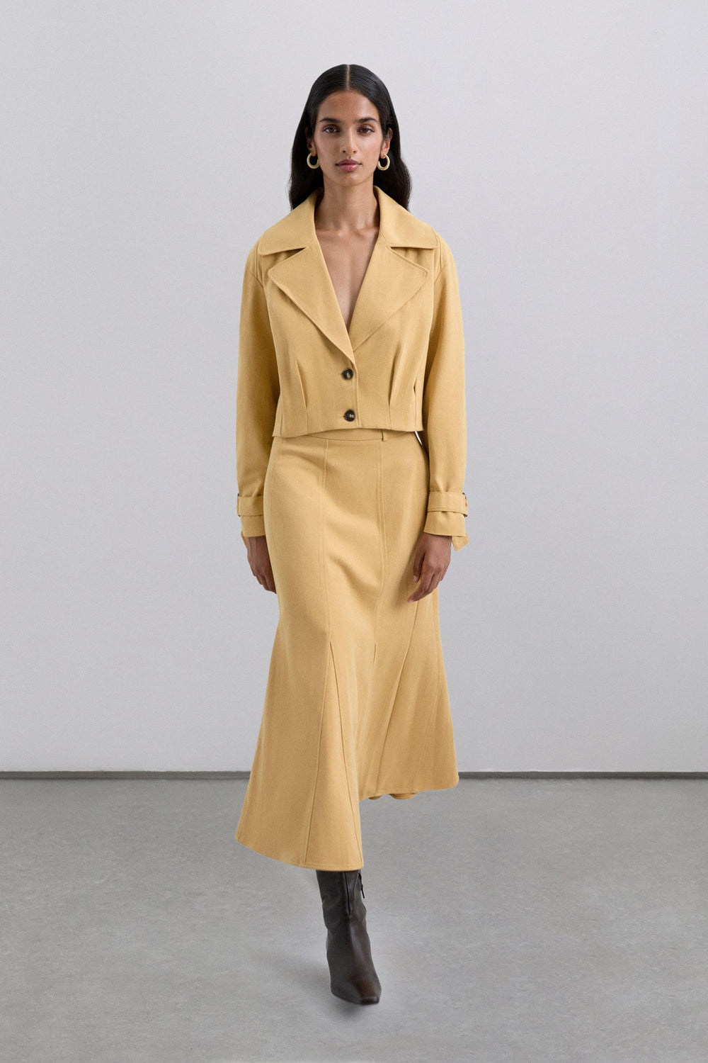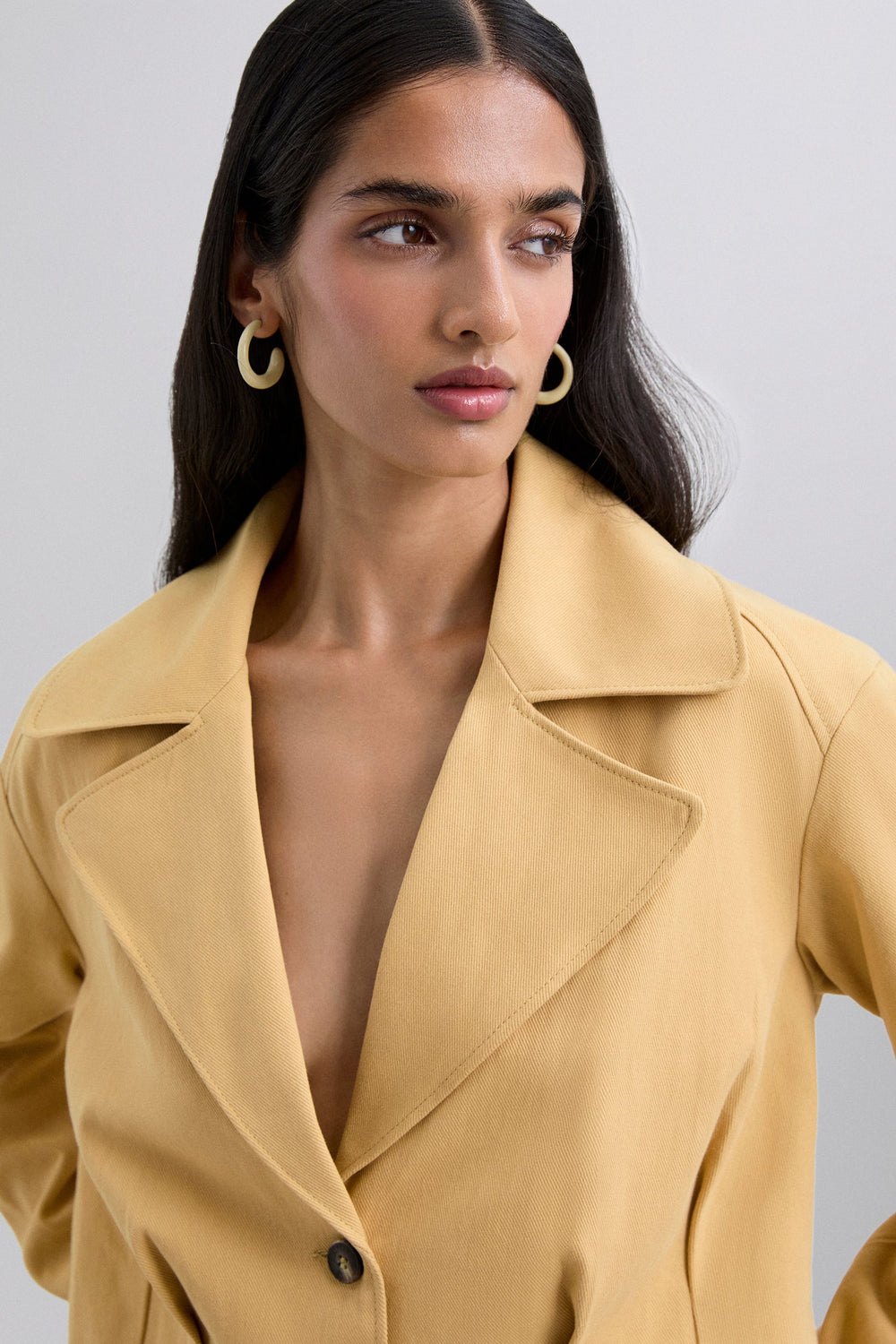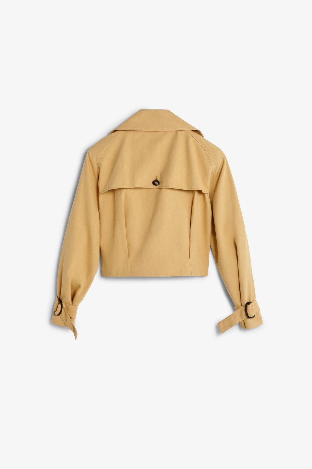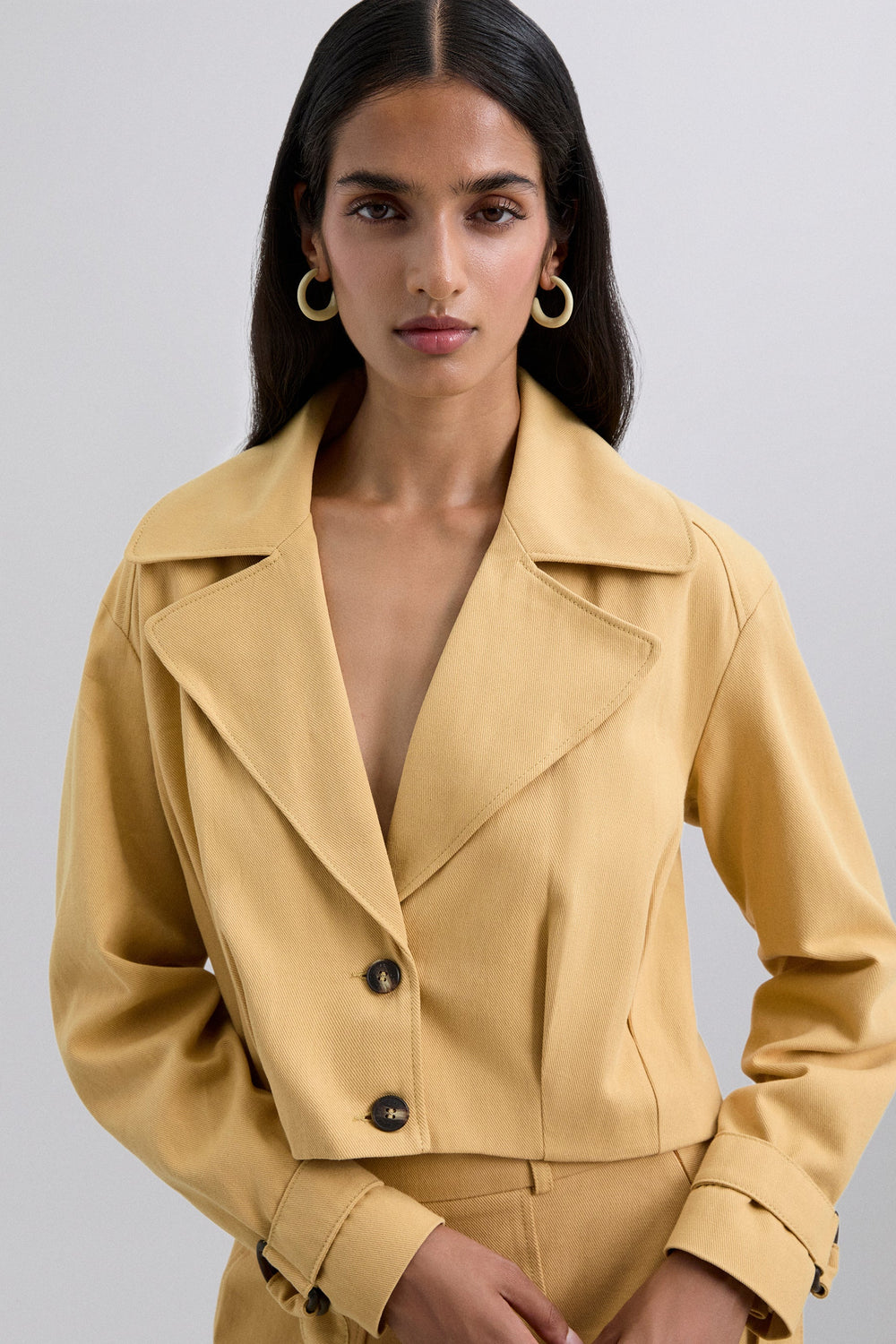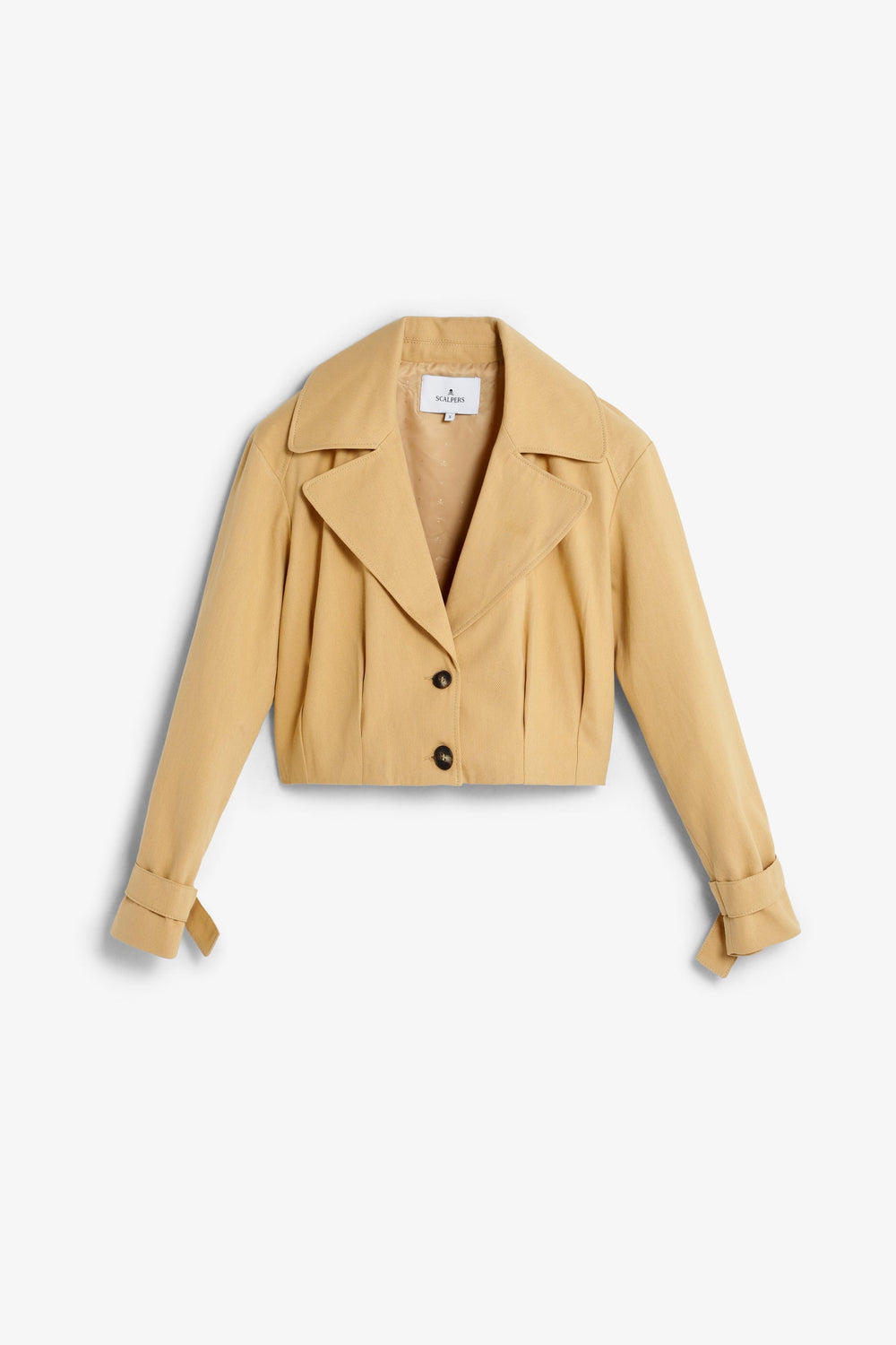 Short lightweight jacket in 100% cotton with notched lapel and front button fastening. Long sleeves with buttoned cuffs.