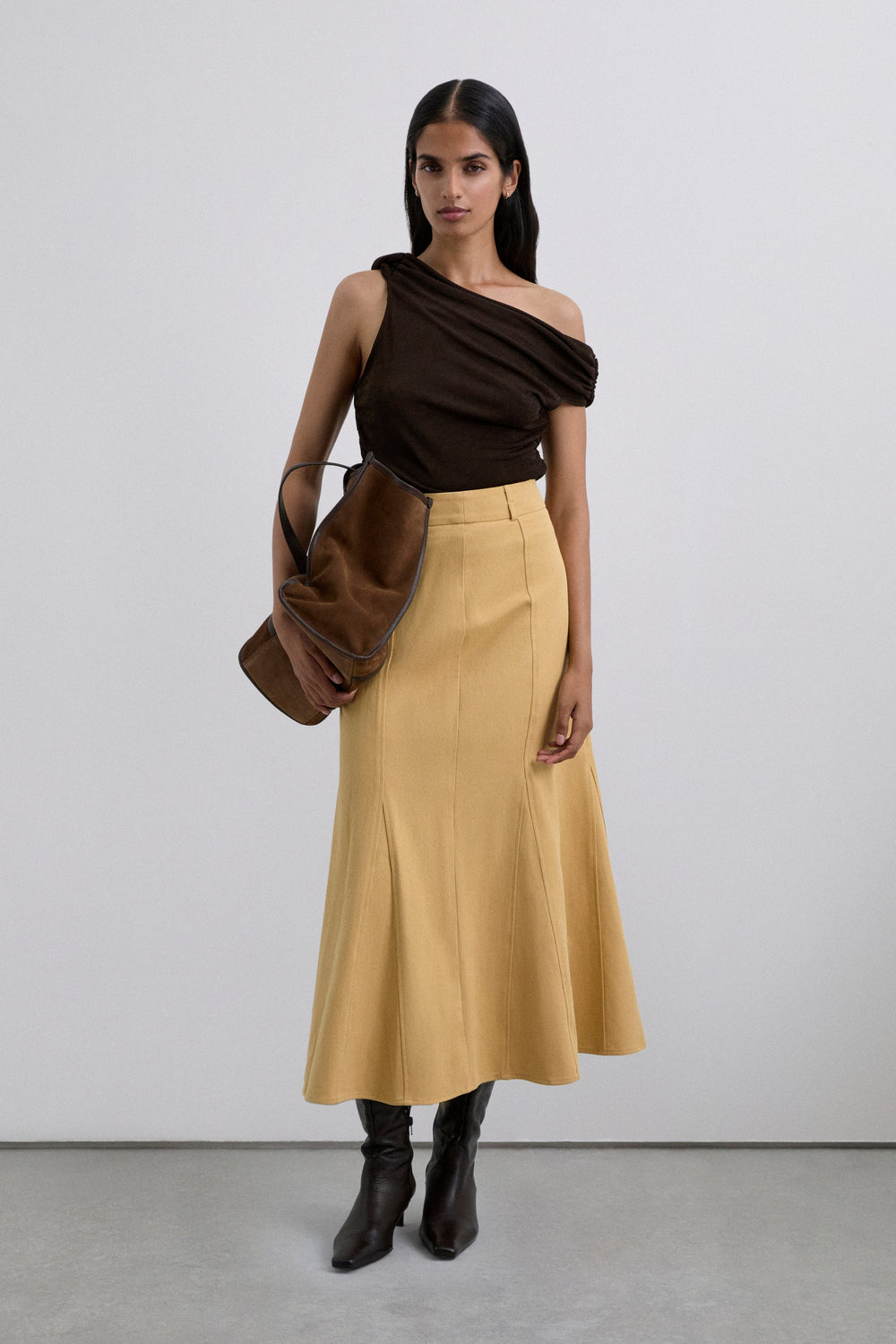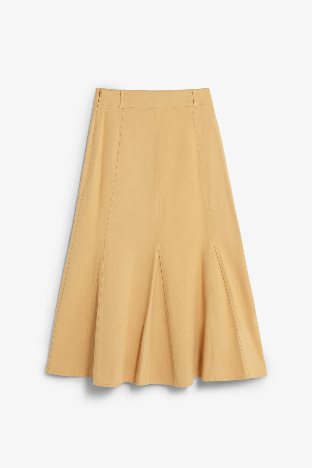 100% cotton skirt with belt loops, elasticated waist and pleats. Matching lining. Side fastening with concealed zip.