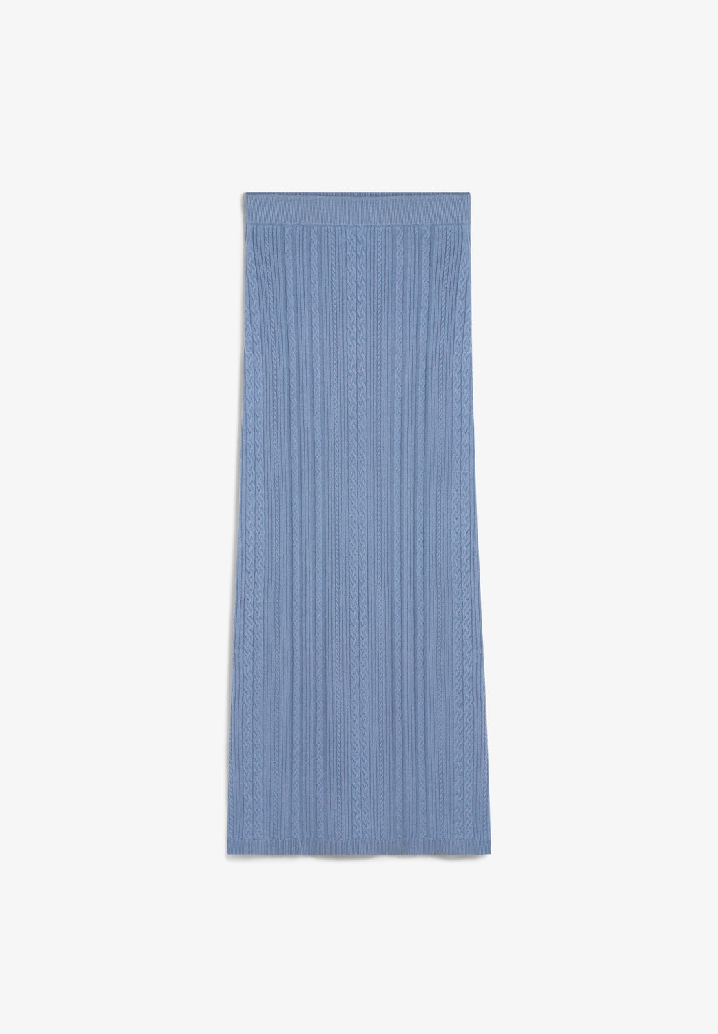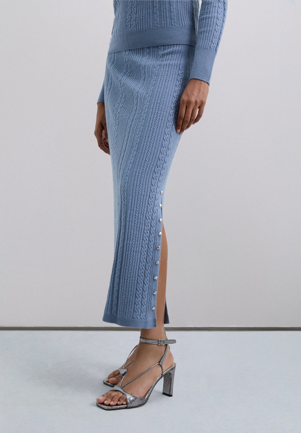 Midi skirt made of a wool blend. Elastic waistband. Slit on the side. Button detail.