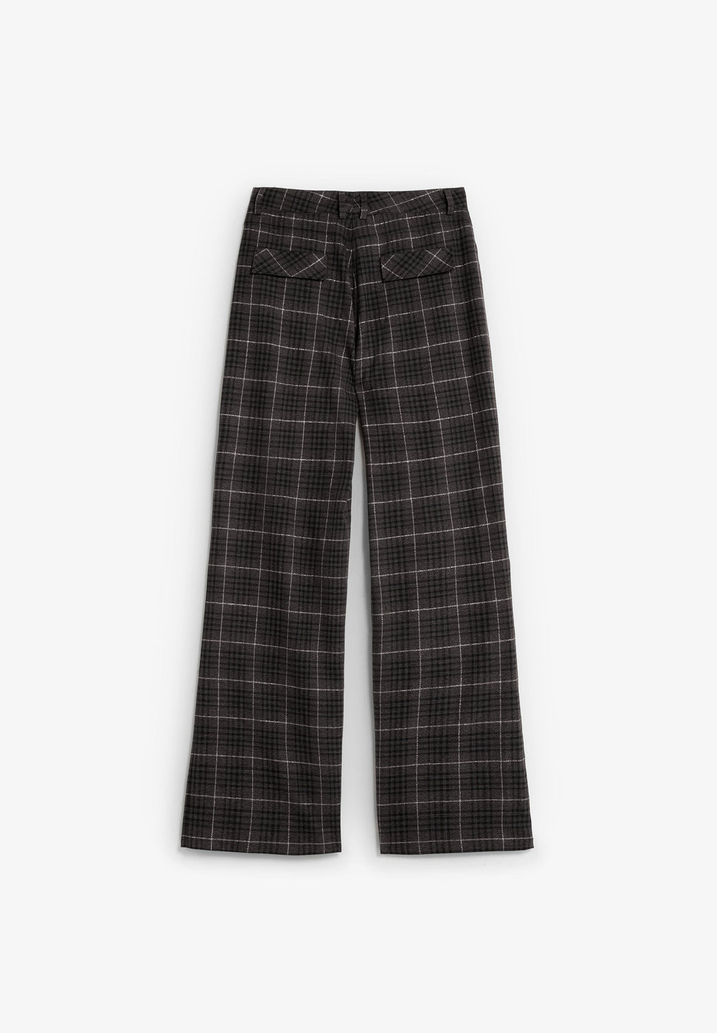 Straight jeans. Front zip and button fastening. Two flap pockets at the back. Belt loops at the waist. Check print.