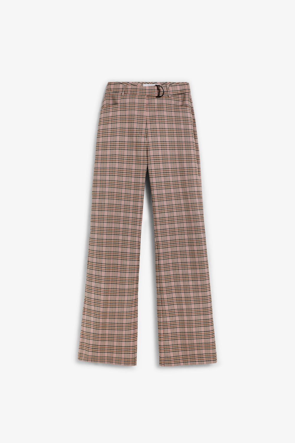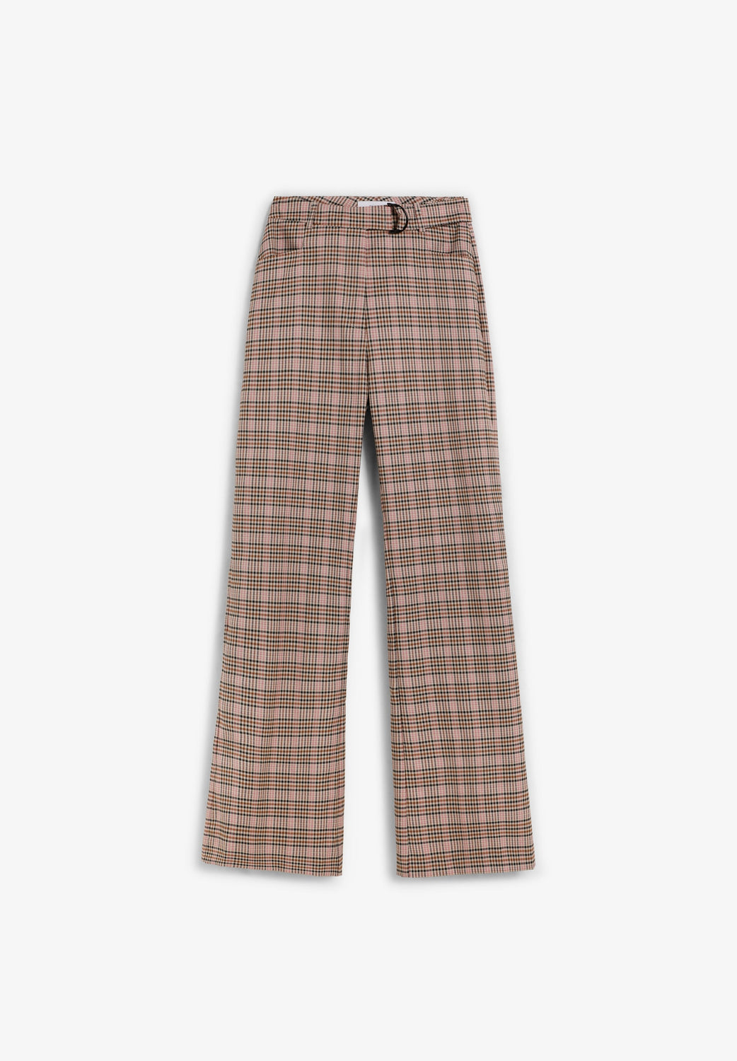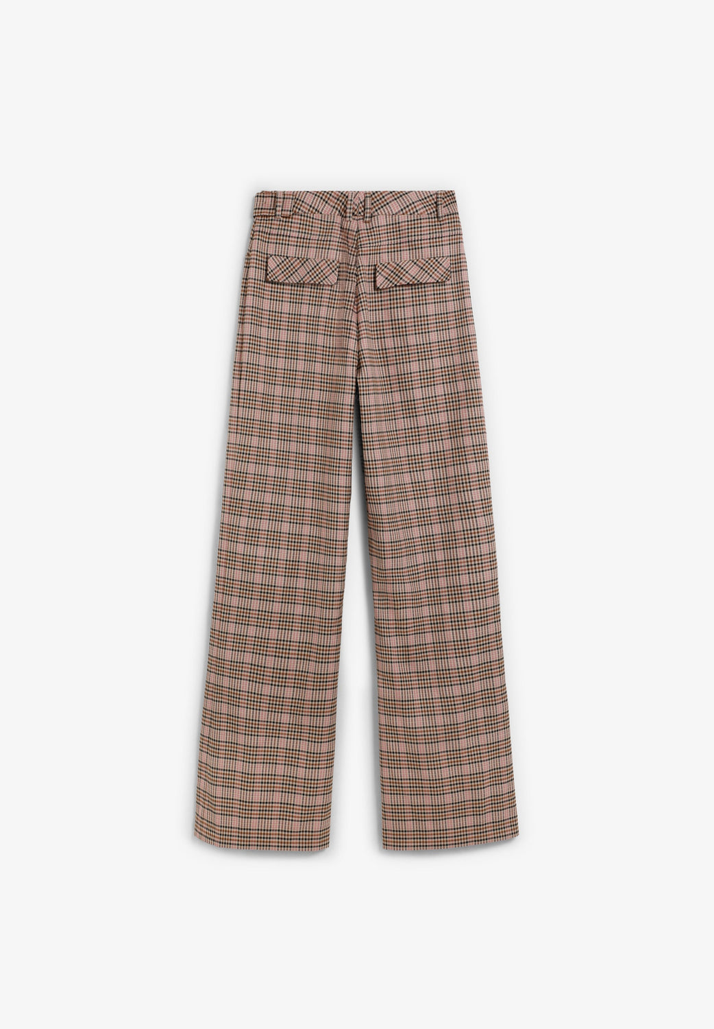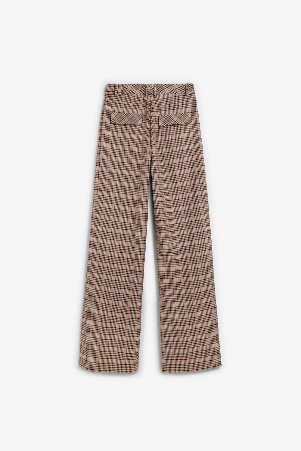 Flared trousers. Front pockets. Flap pocket at the back. Belt loops at the waist. Check print.