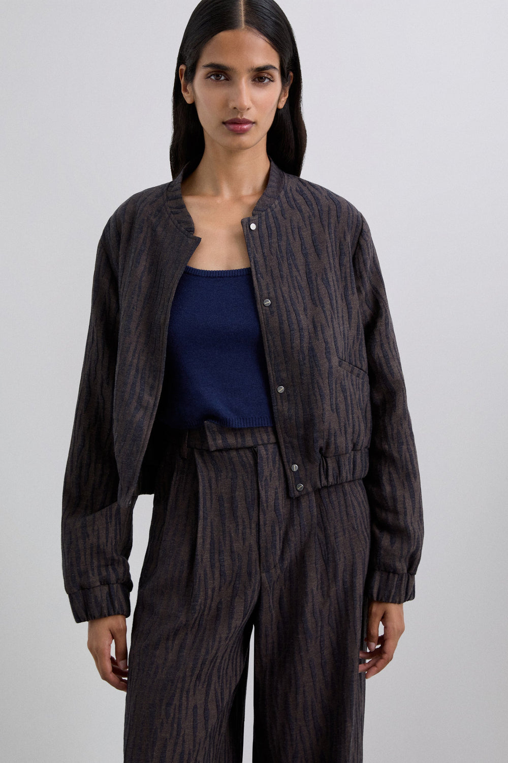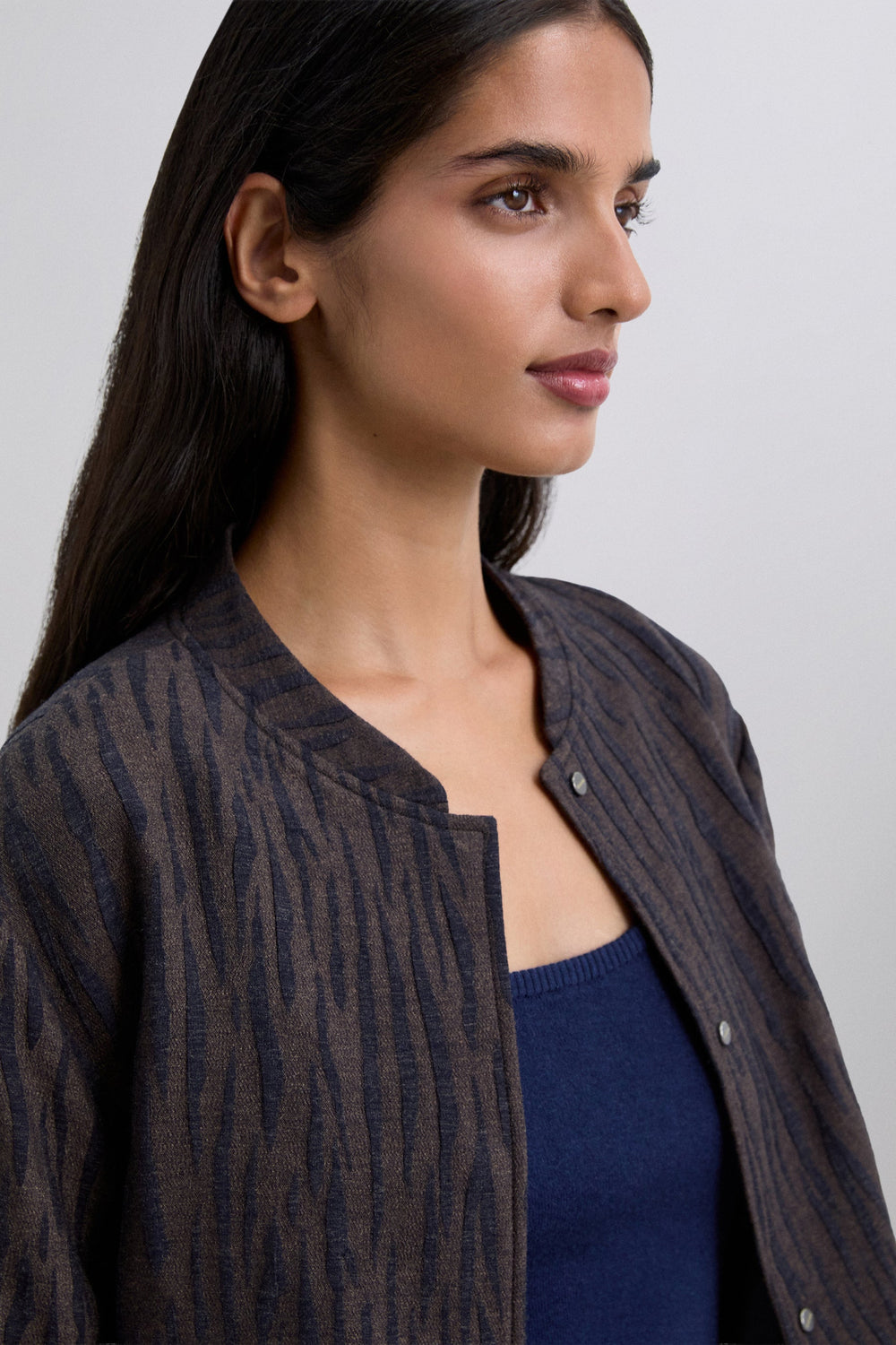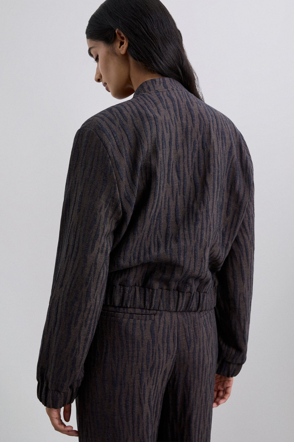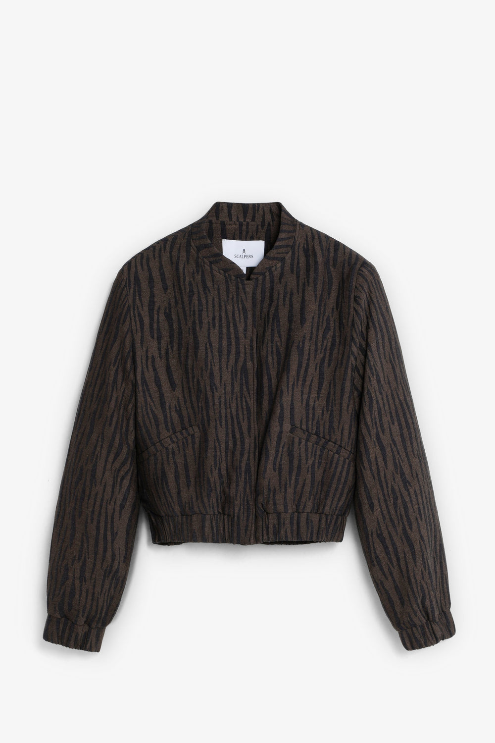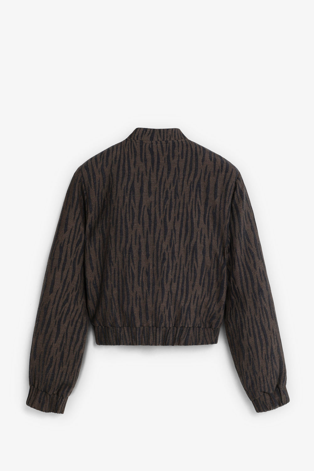Animal print bomber jacket. Long sleeves. Slightly elasticated cuffs and waistband. Front button fastening. Front pockets.