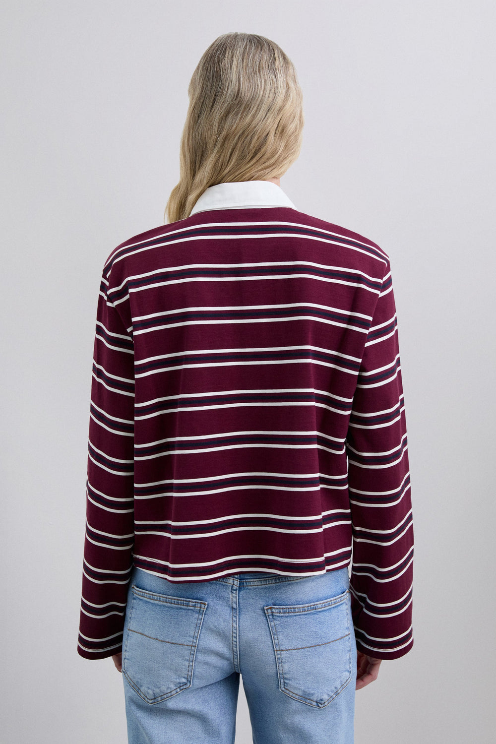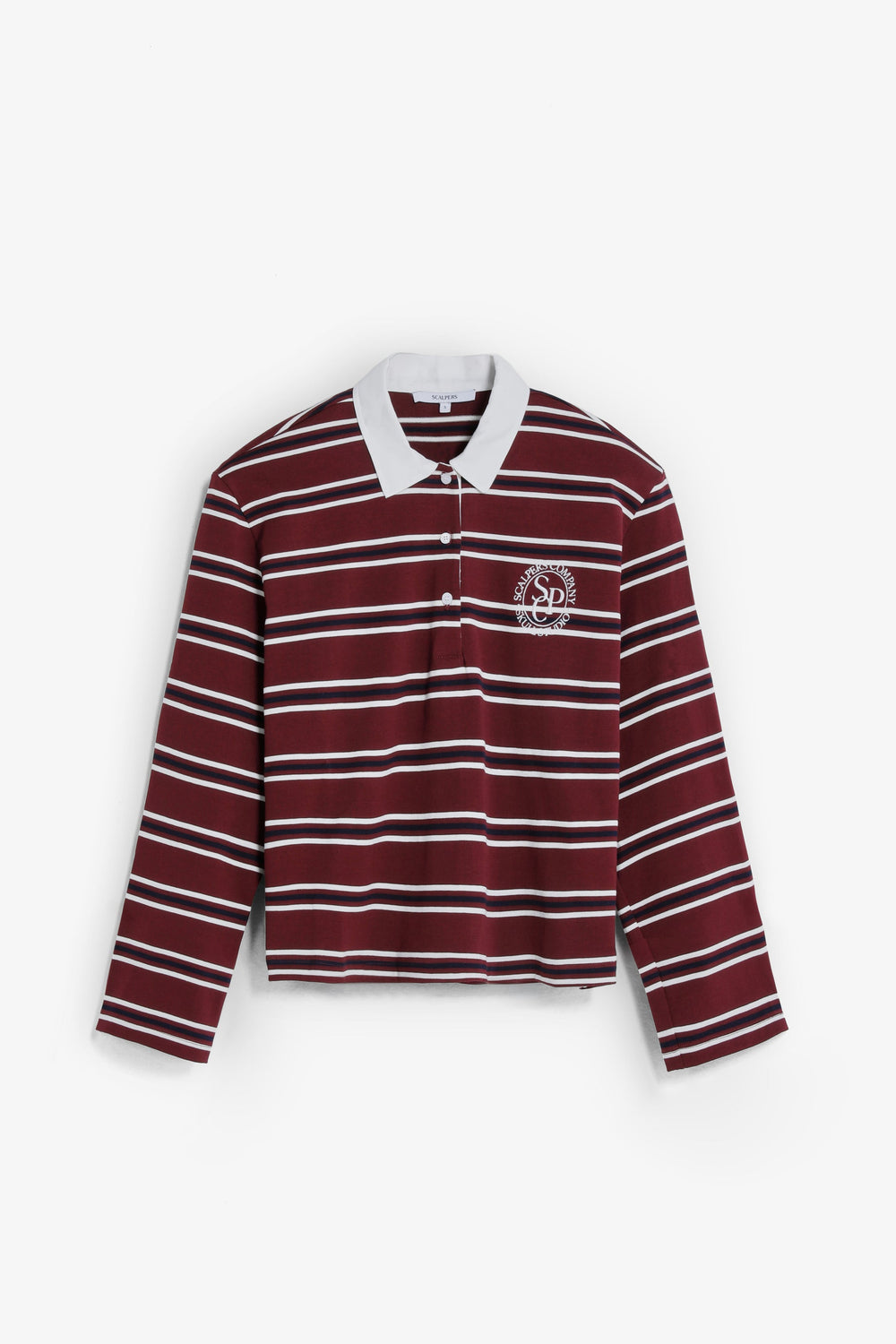 Polo shirt in 100% BCI cotton. Stripe print. Long sleeves. Contrasting collar. Button fastening. Embroidered contrast logo on the chest.