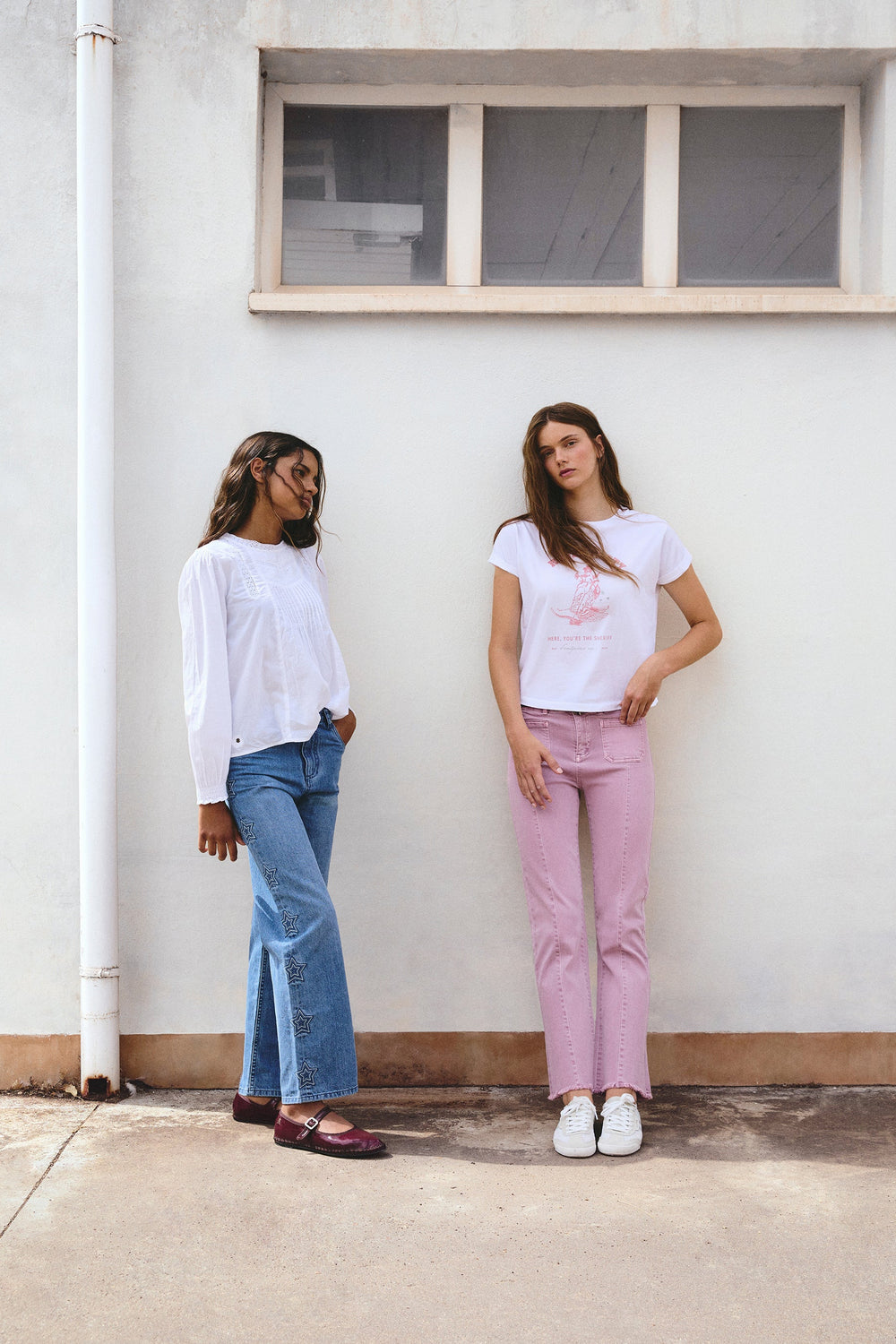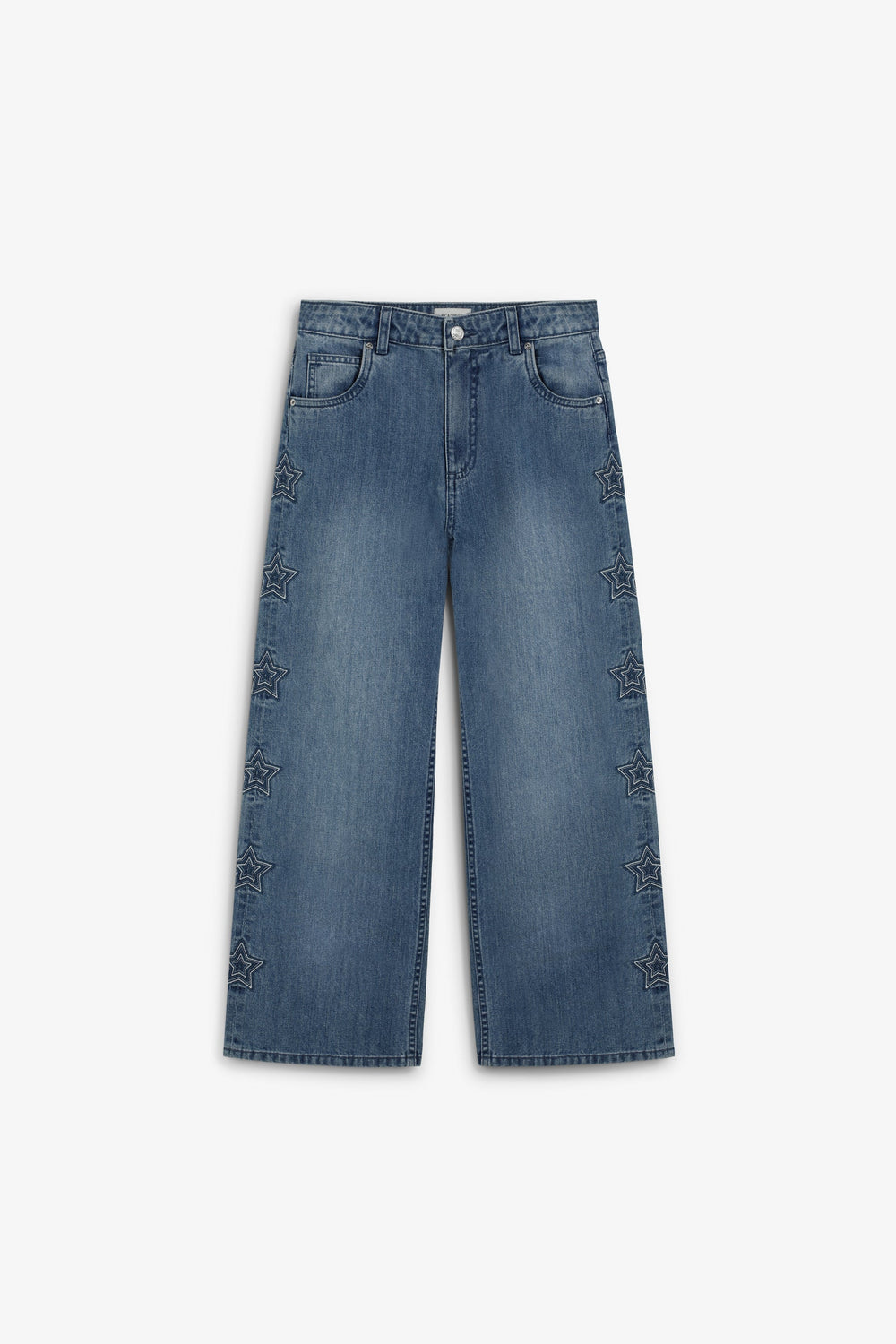 Wide led trousers made of 100% organic cotton. Button and zip fastening. Belt loops at the waist. Two front pockets and back pockets. Embroidered star detailing on the sides.