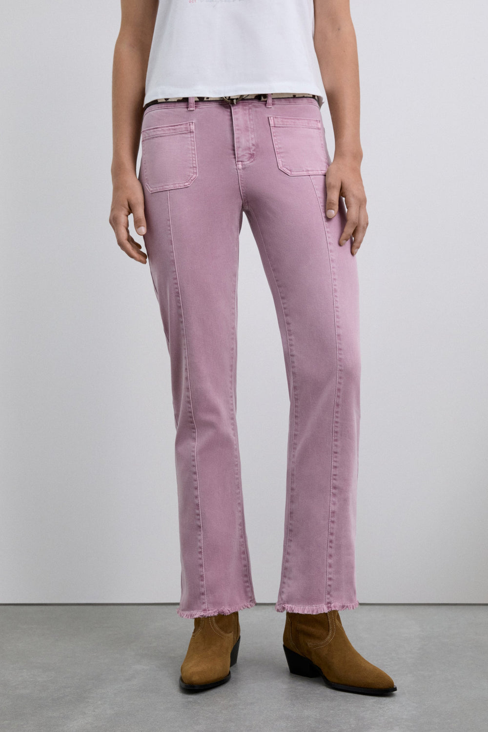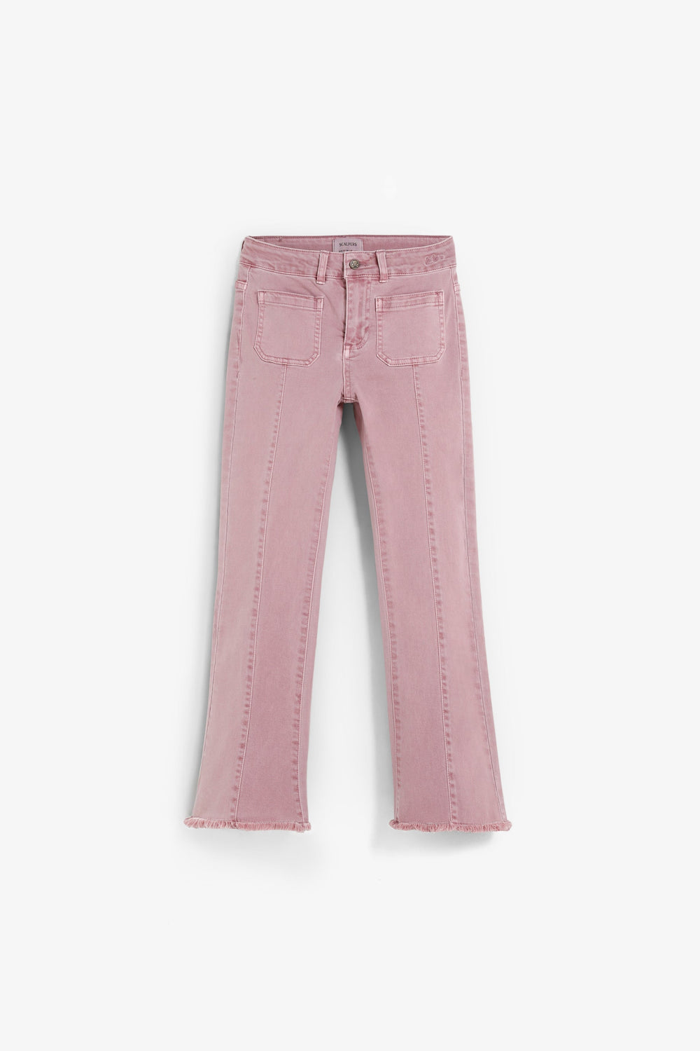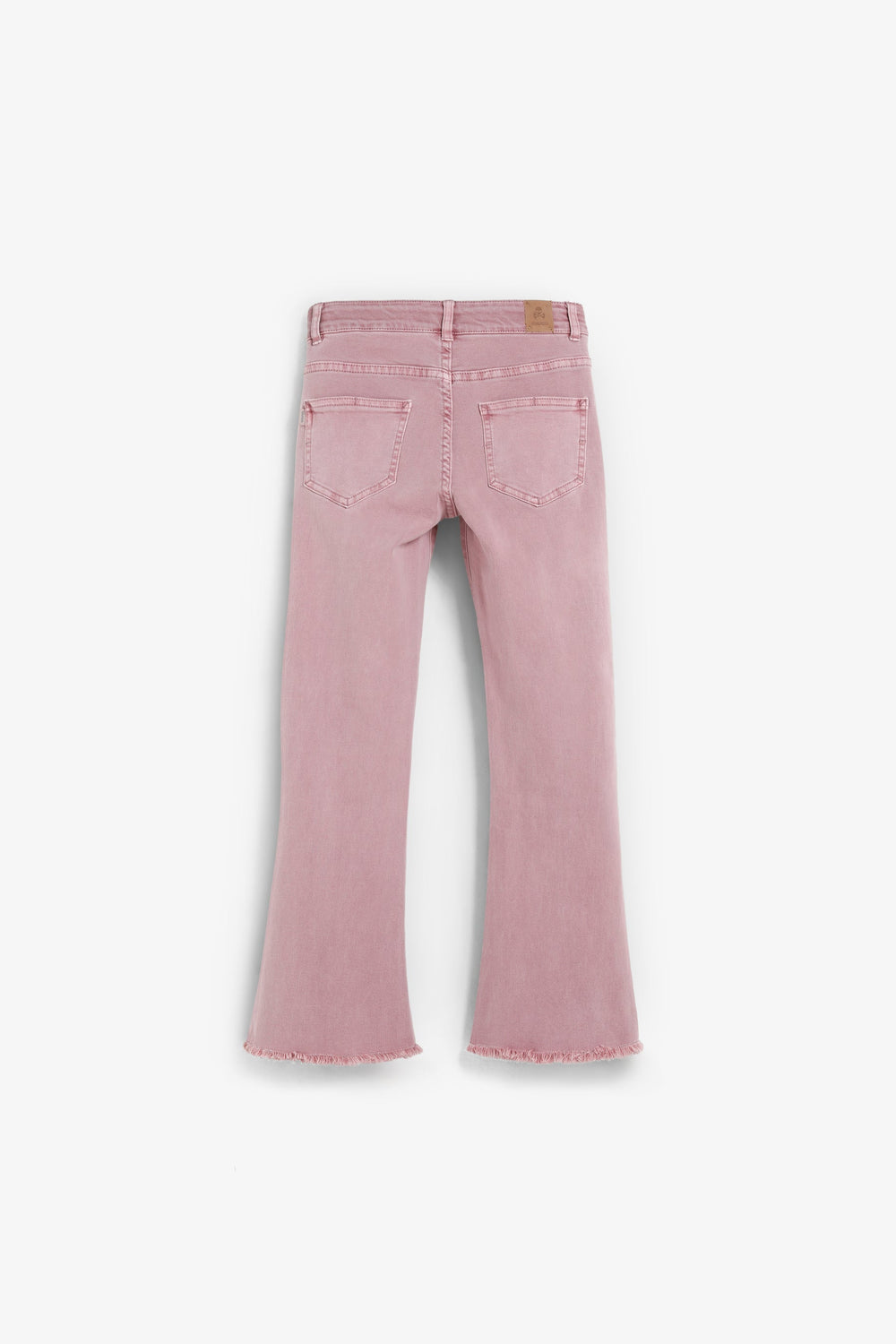 Pantalón flare confeccionado en algodón BCI. Cierre mediante botón y cremallera. Trabillas en cintura. Bolsillos delanteros y traseros. Detalle de costura en parte frontal. Apertura lateral y remates desflecados en bajos.