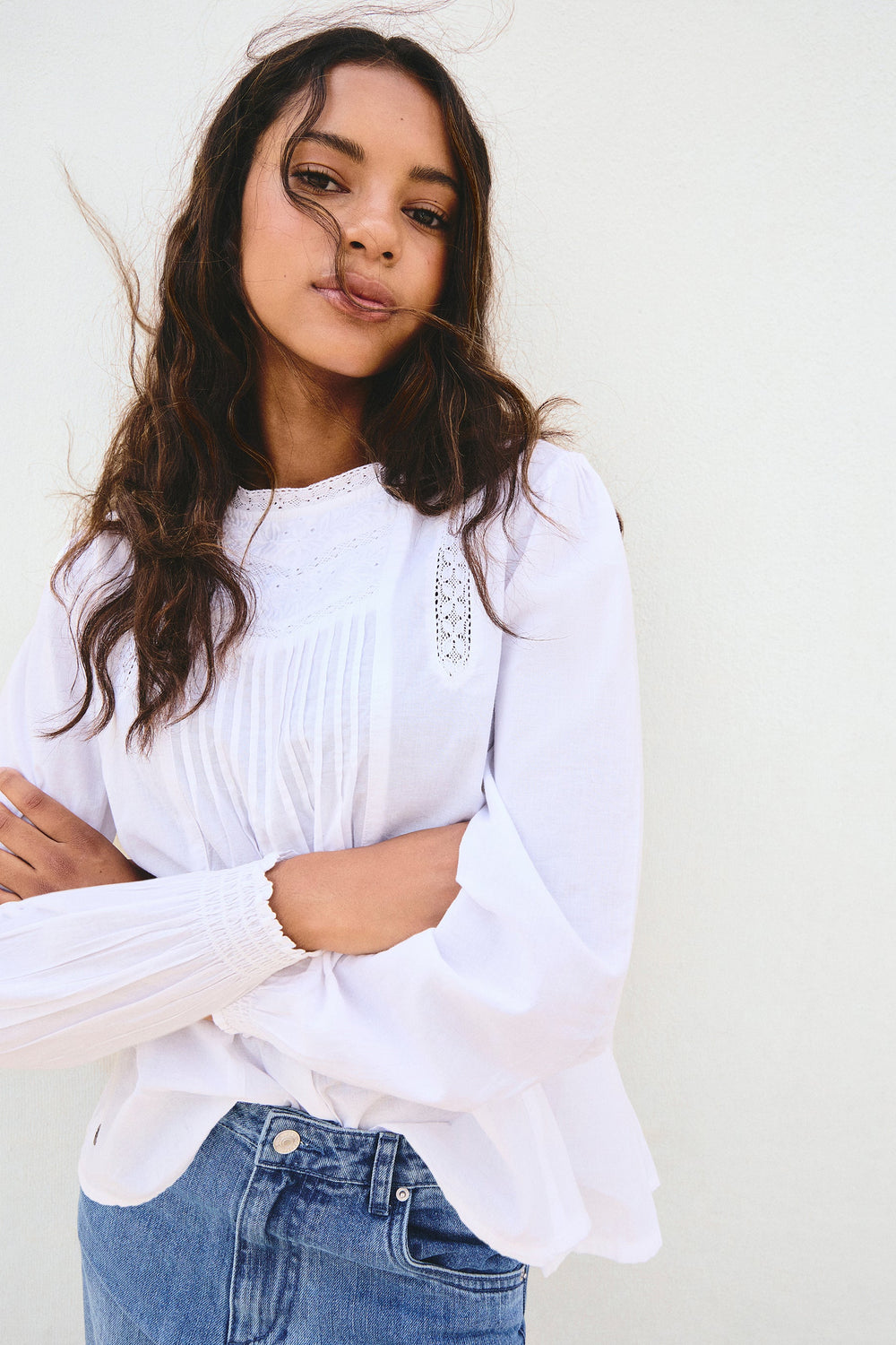 Blusa confeccionada en 100% algodón BCI. Regular fit. Cuello redondo. Manga larga abullonada terminada en elástico. Detalle metálico de calavera en cintura. Detalles bordados en cuello y frontal. Cierre trasero con botón.