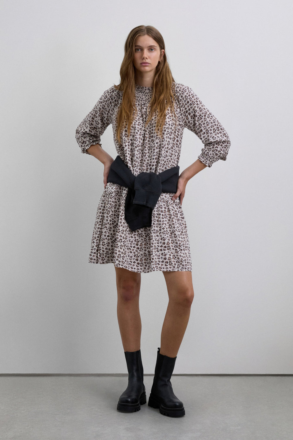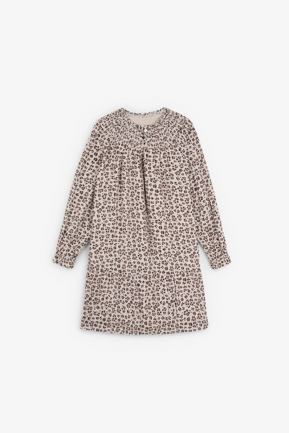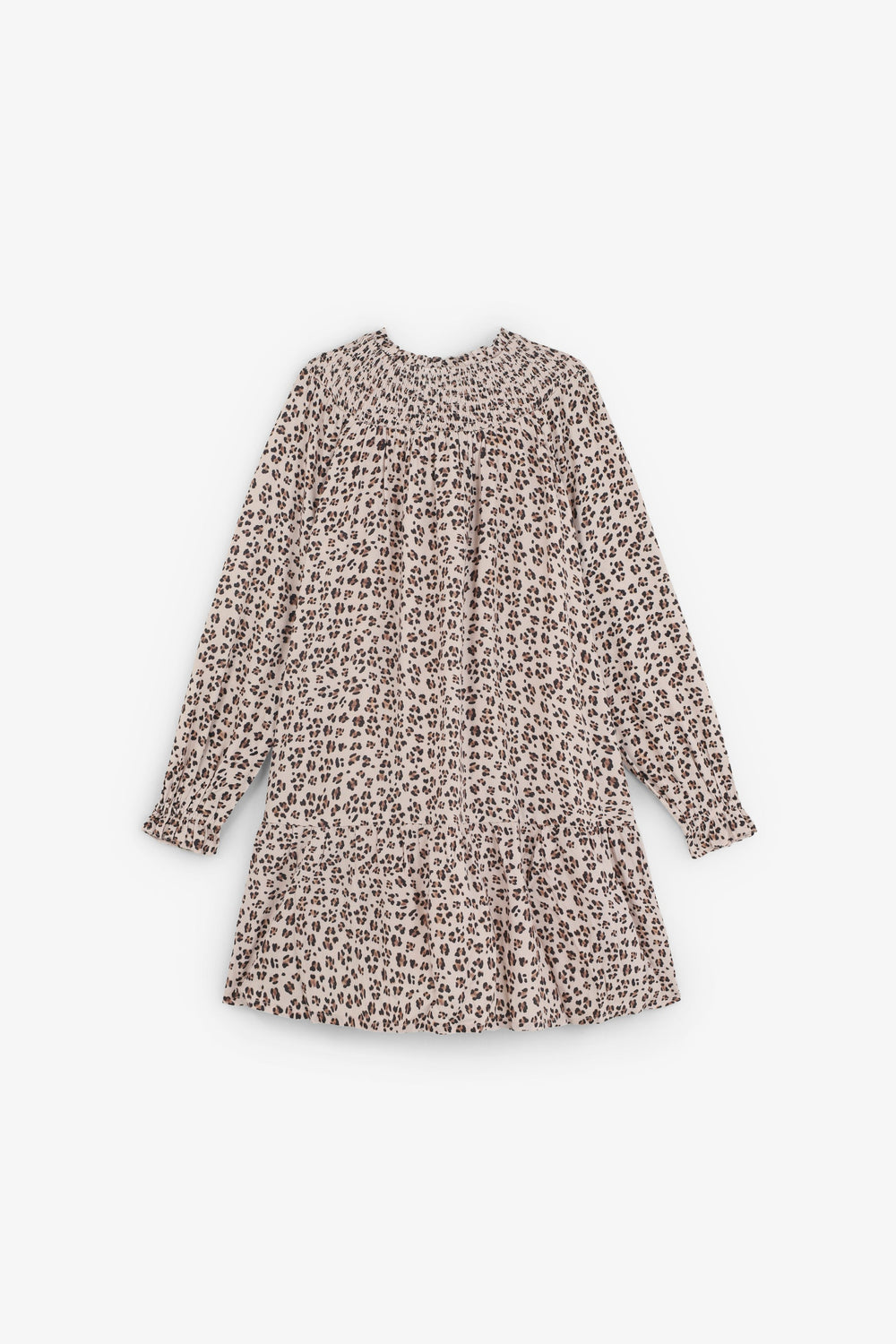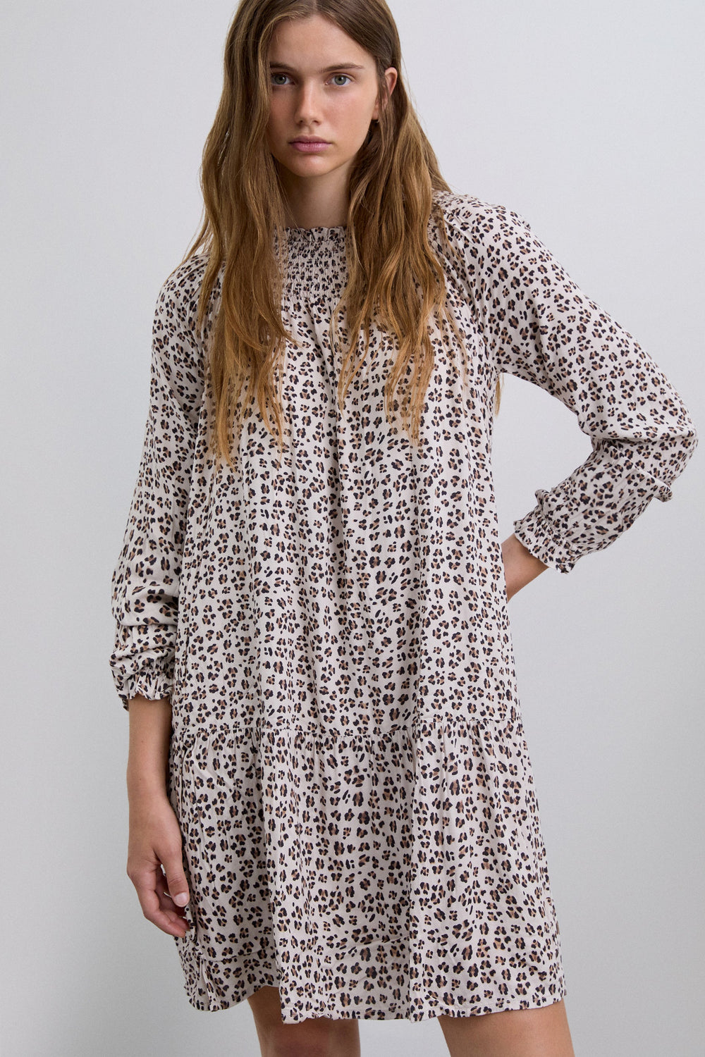 Animal print dress. Slightly puffed long sleeves. Smocking collar and button fastening.