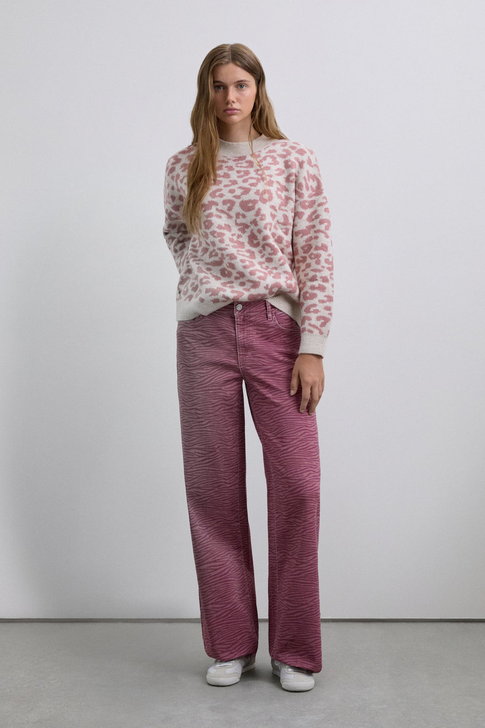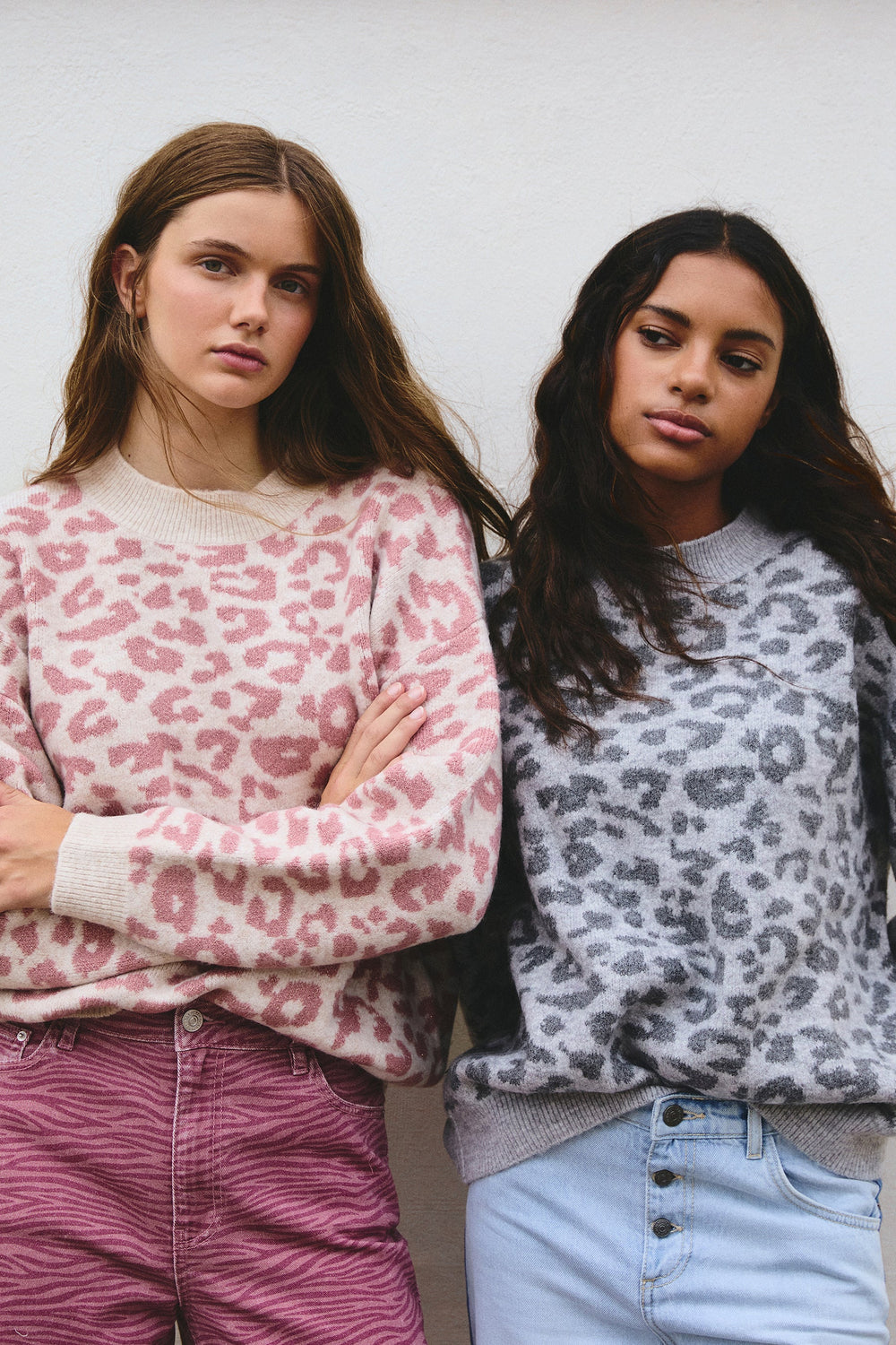 Jersey de punto. Manga larga. Cuello redondo. Estampado animal print. Acabados en rib a contraste.