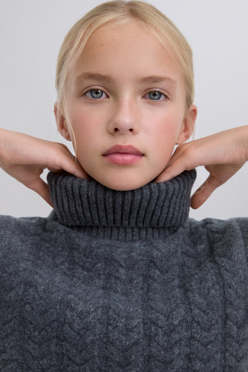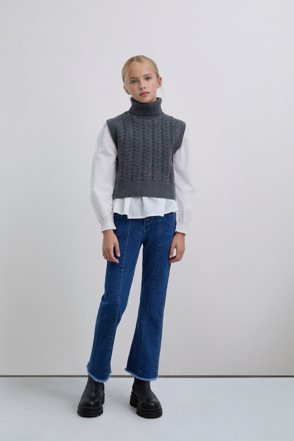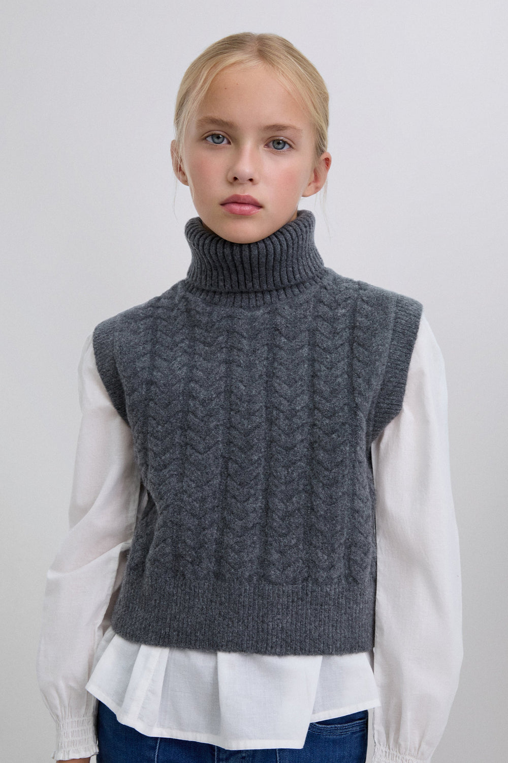 Knit vest. Roll neck. Ribbed trim. Metal skull tag detail.