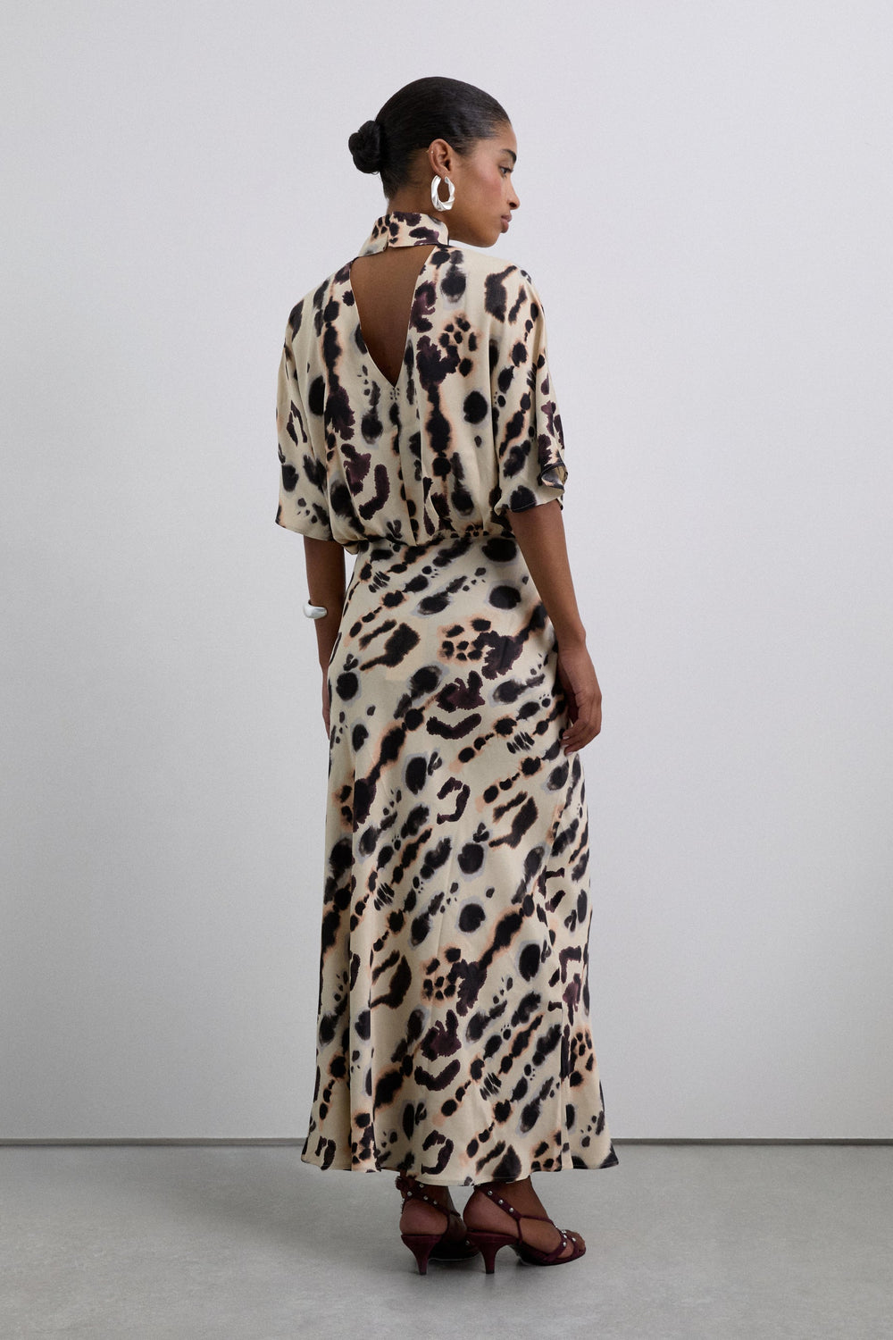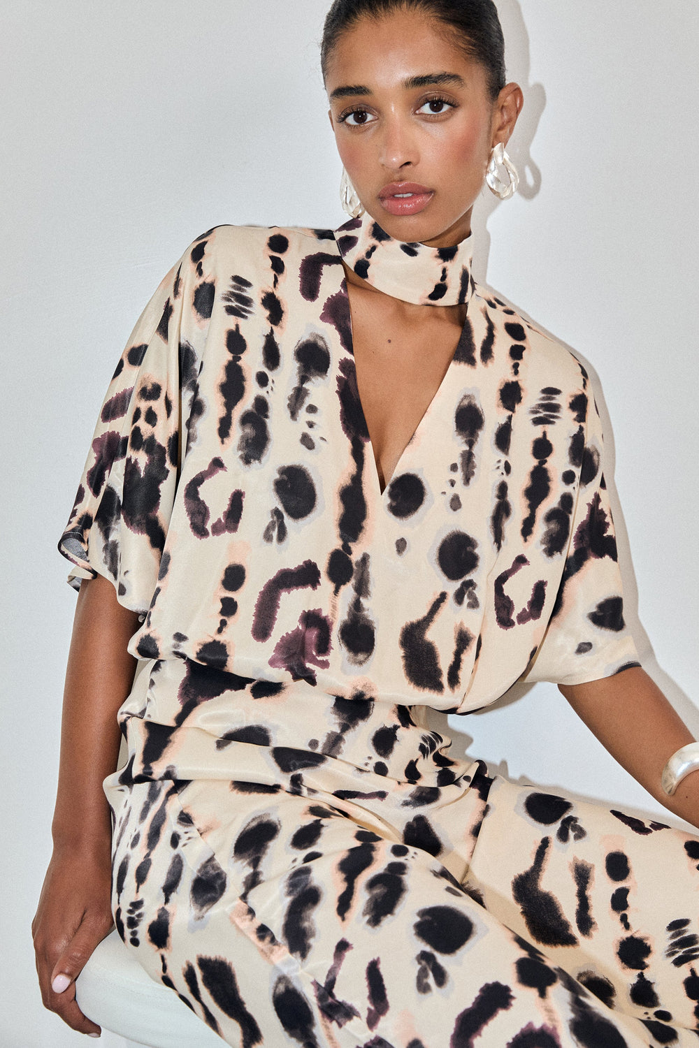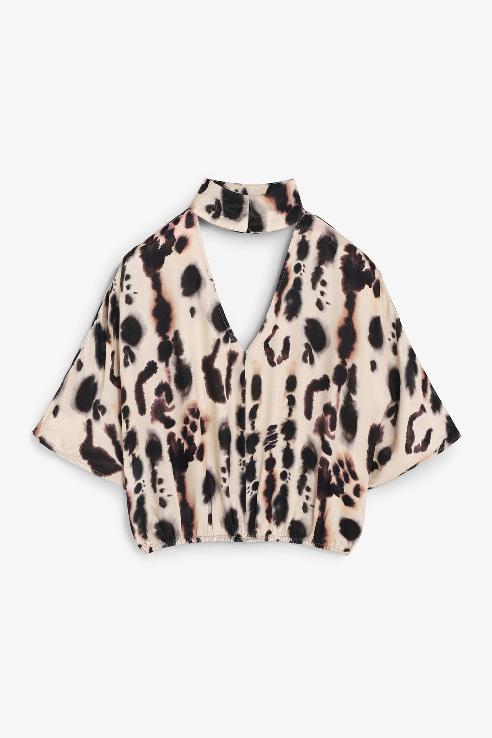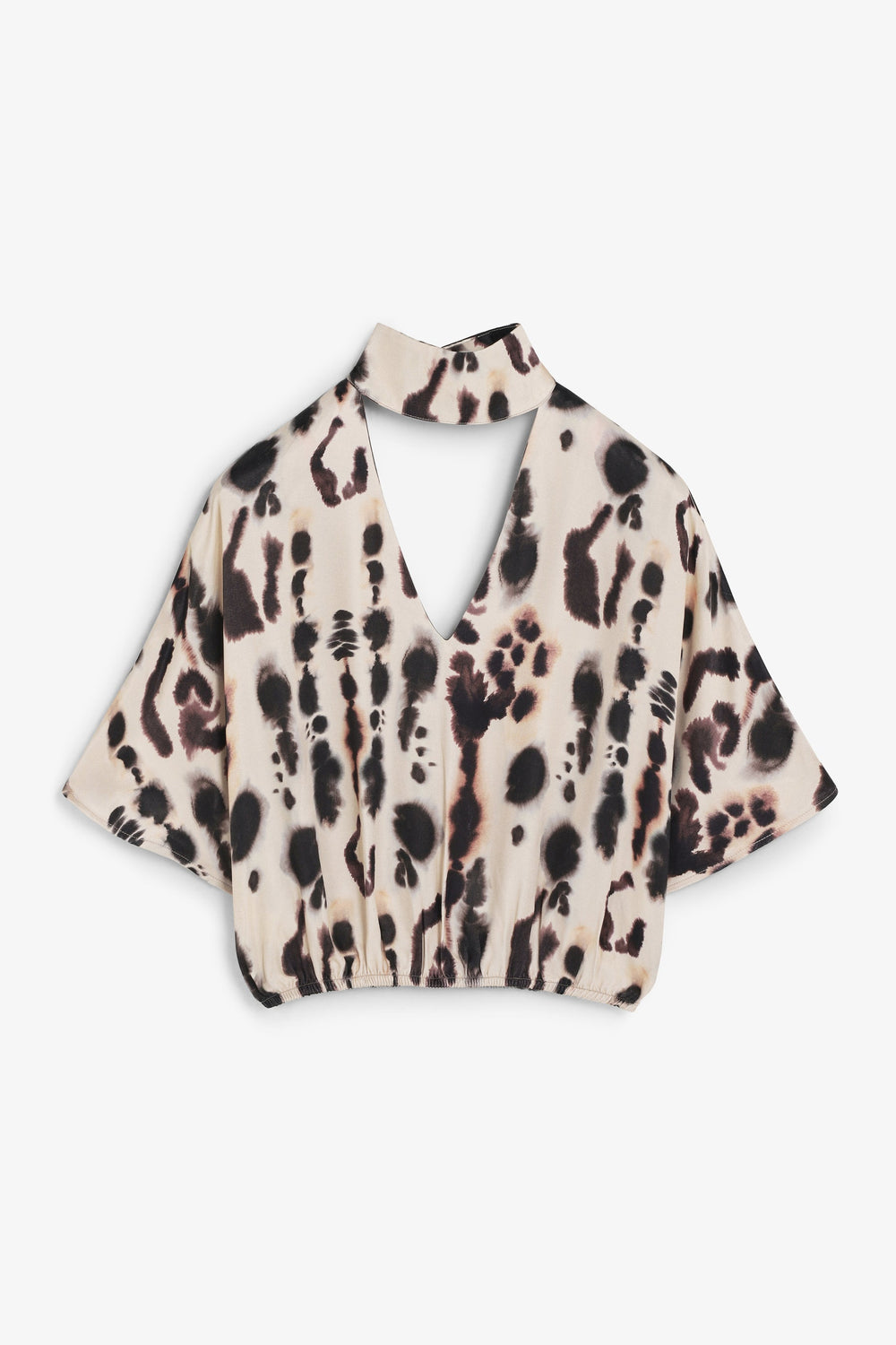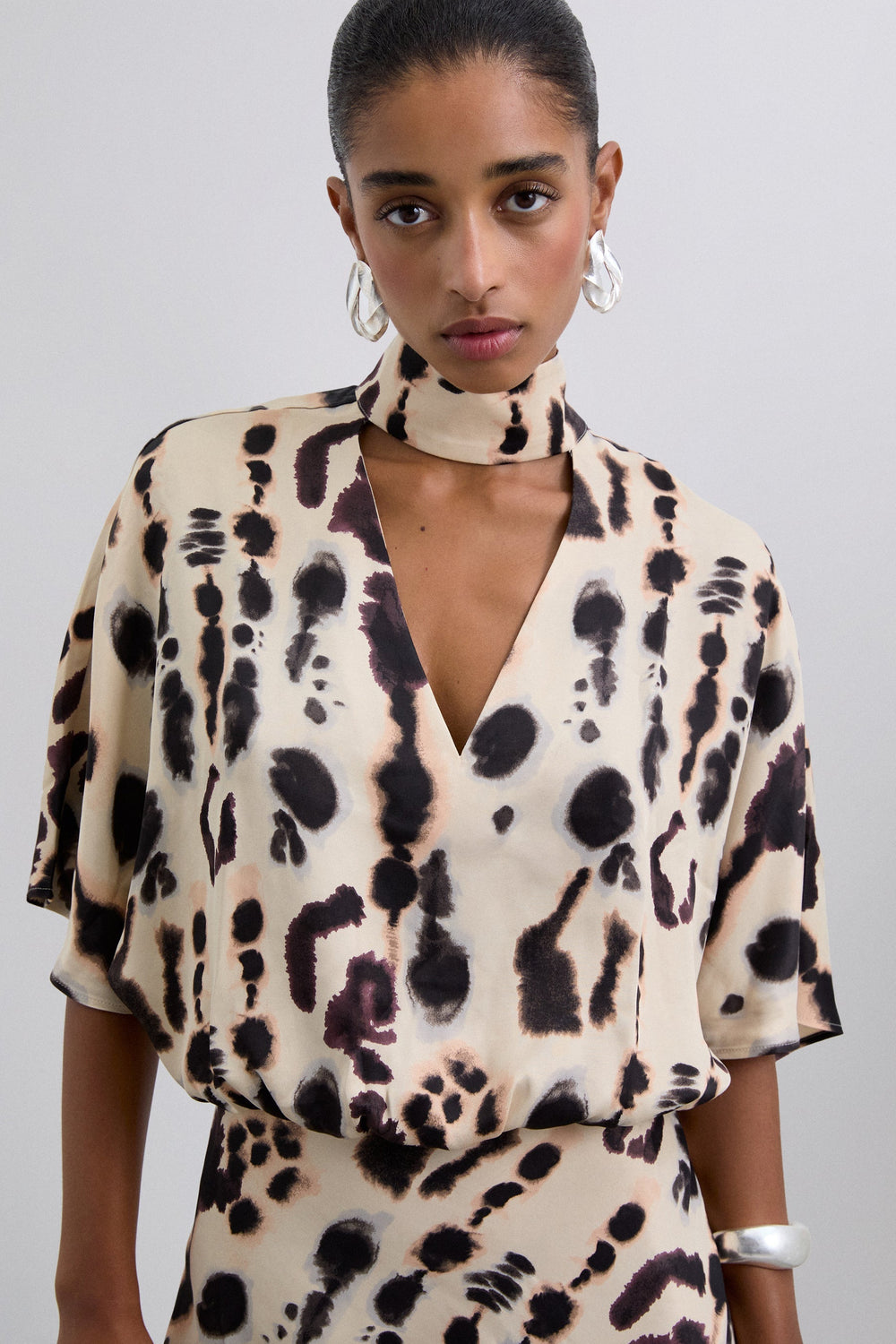 Satin shirt with short sleeves and collar detail. V-neck with choker. Flowing printed shirt.