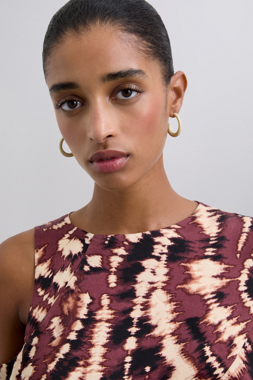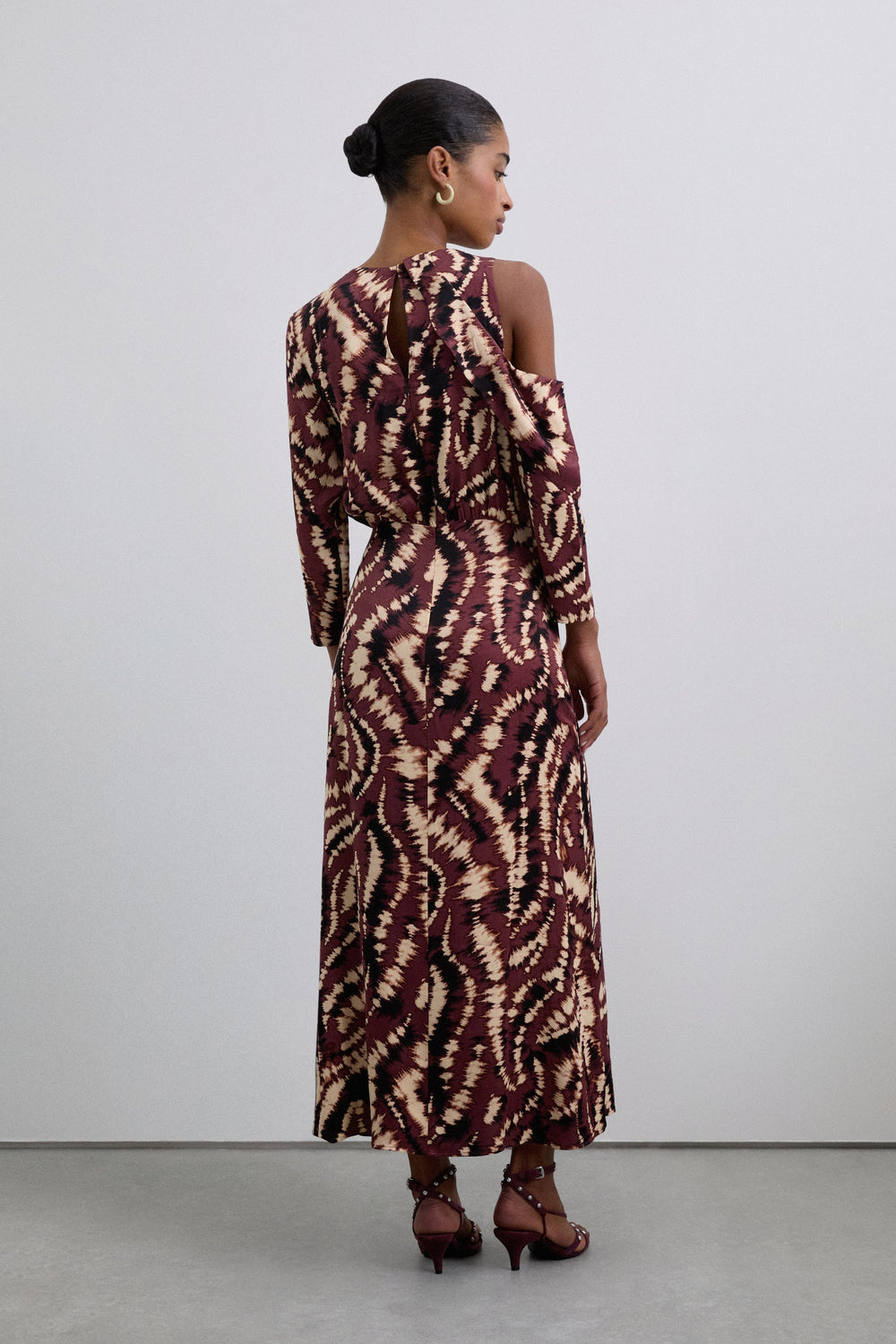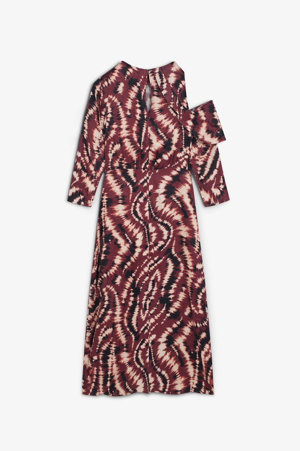 Asymmetric dress made of 100% viscose. Midi length. Round asymmetric neckline. Long sleeve with ruffle on the shoulder. Back button fastening.
