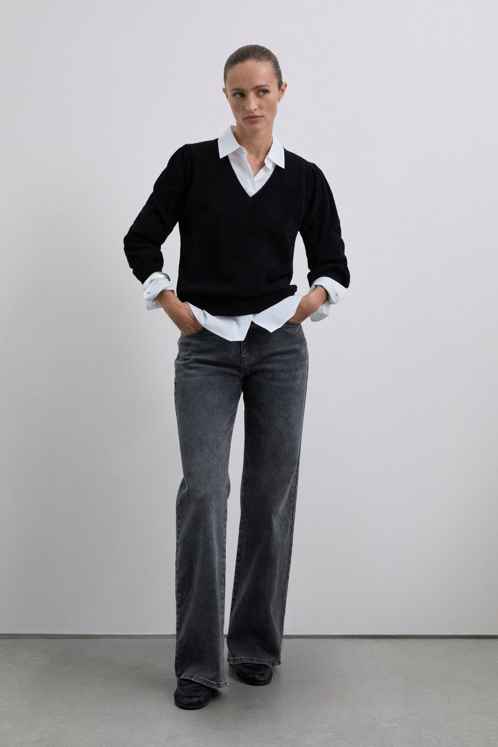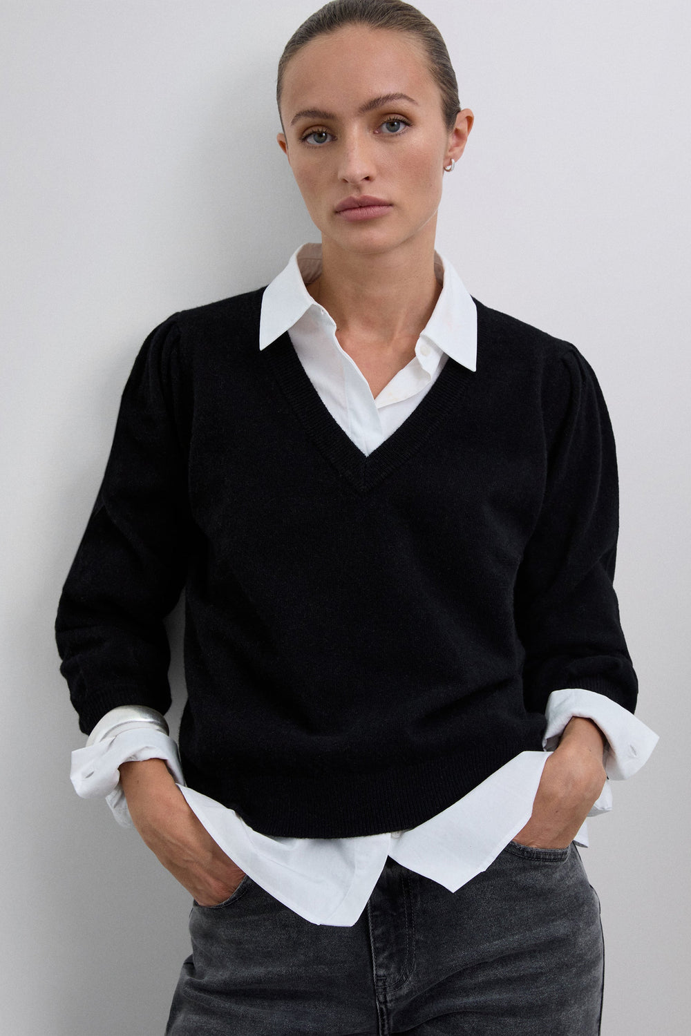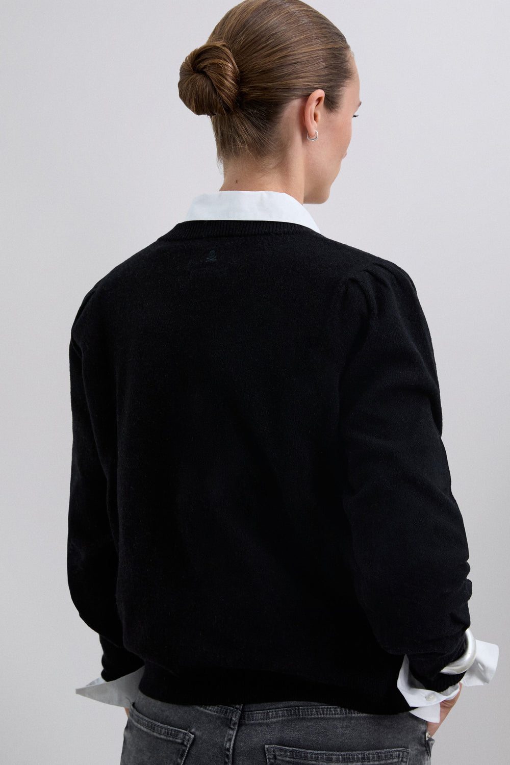 Sweater made of a wool blend with V-neck. Regular fit. Long, slightly puffed sleeves with ribbed cuffs. Matching embroidered skull detail on the back.