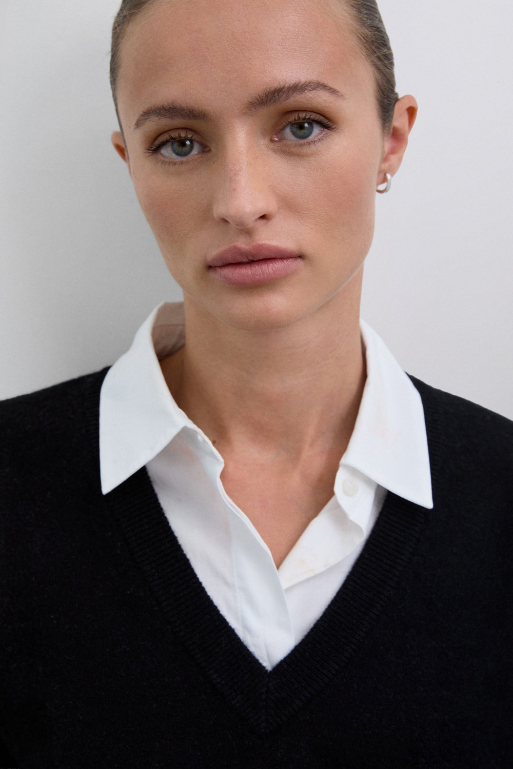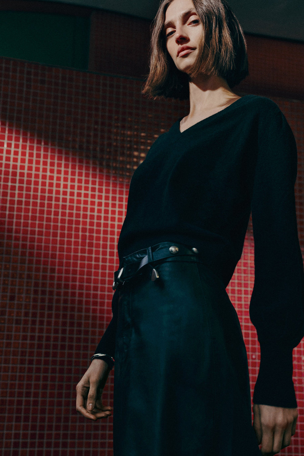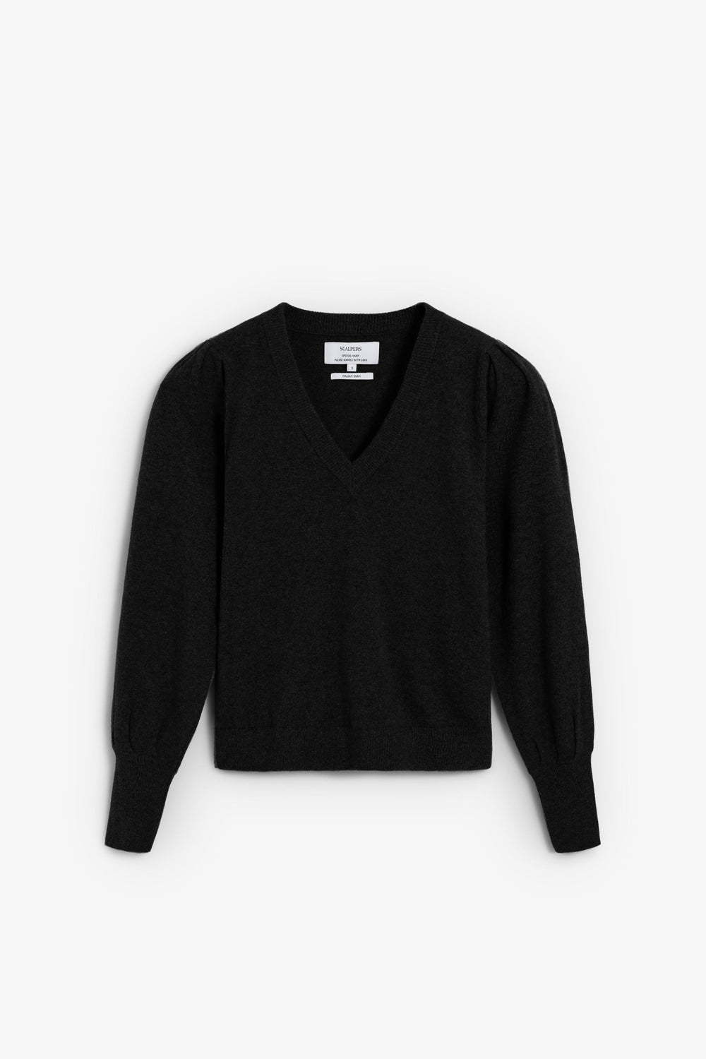 Sweater made of a wool blend with V-neck. Regular fit. Long, slightly puffed sleeves with ribbed cuffs. Matching embroidered skull detail on the back.