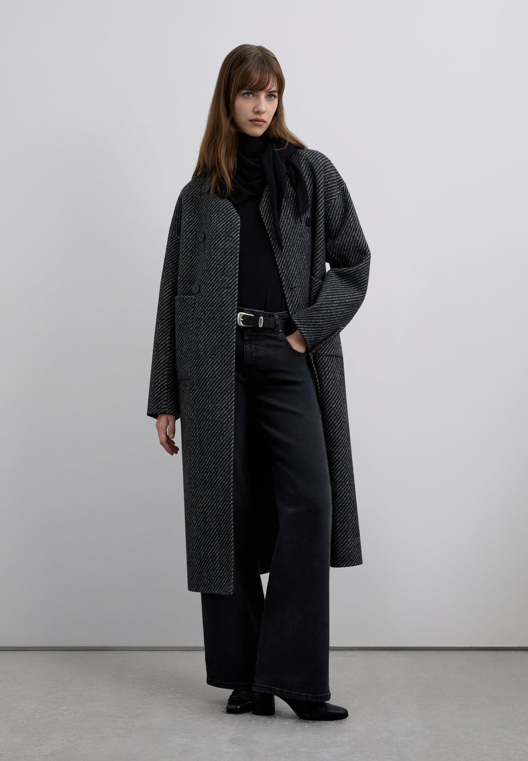 Long coat made of a reversible wool blend. Regular fit. Round collar with no lapels. Grey herringbone print and plain brown options. Patch pockets on the herringbone option and slanted pockets on the plain reverse side.