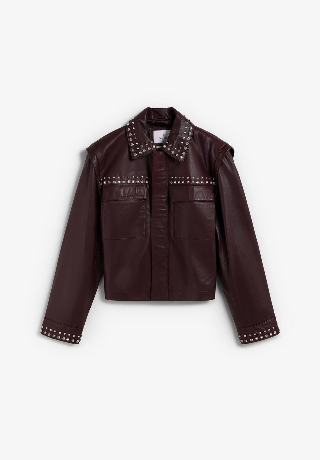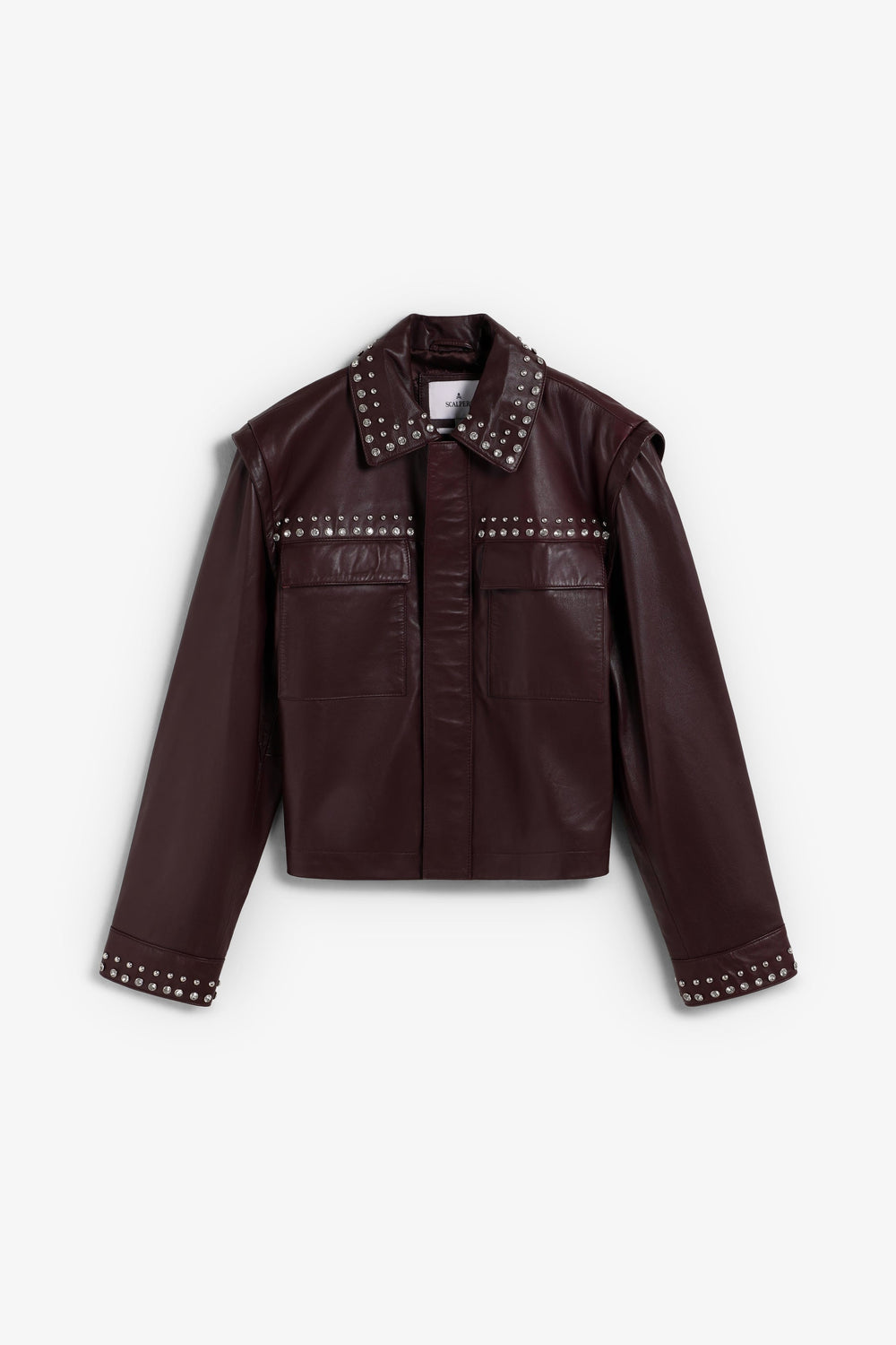 Jacket made of 100% leather. Regular fit. Classic collar. Embroidered details with studs and rhinestones. Front zip and press stud fastening. Front patch pockets. Long straight sleeves with buttoned cuffs.