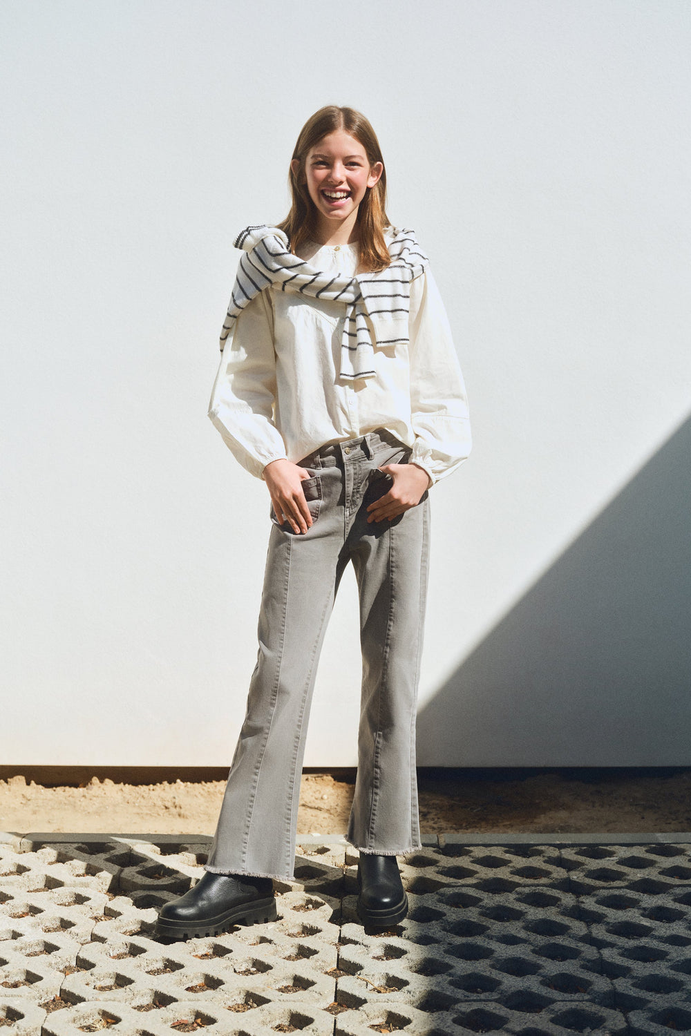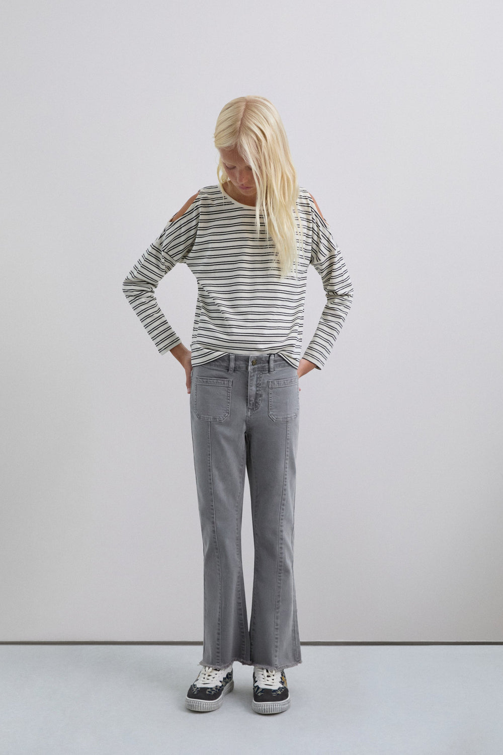 Flared trousers made of BCI cotton. Button and zip fastening. Belt loops at the waist. Front and back pockets. Seam detail on the front. Side slit and frayed hems.