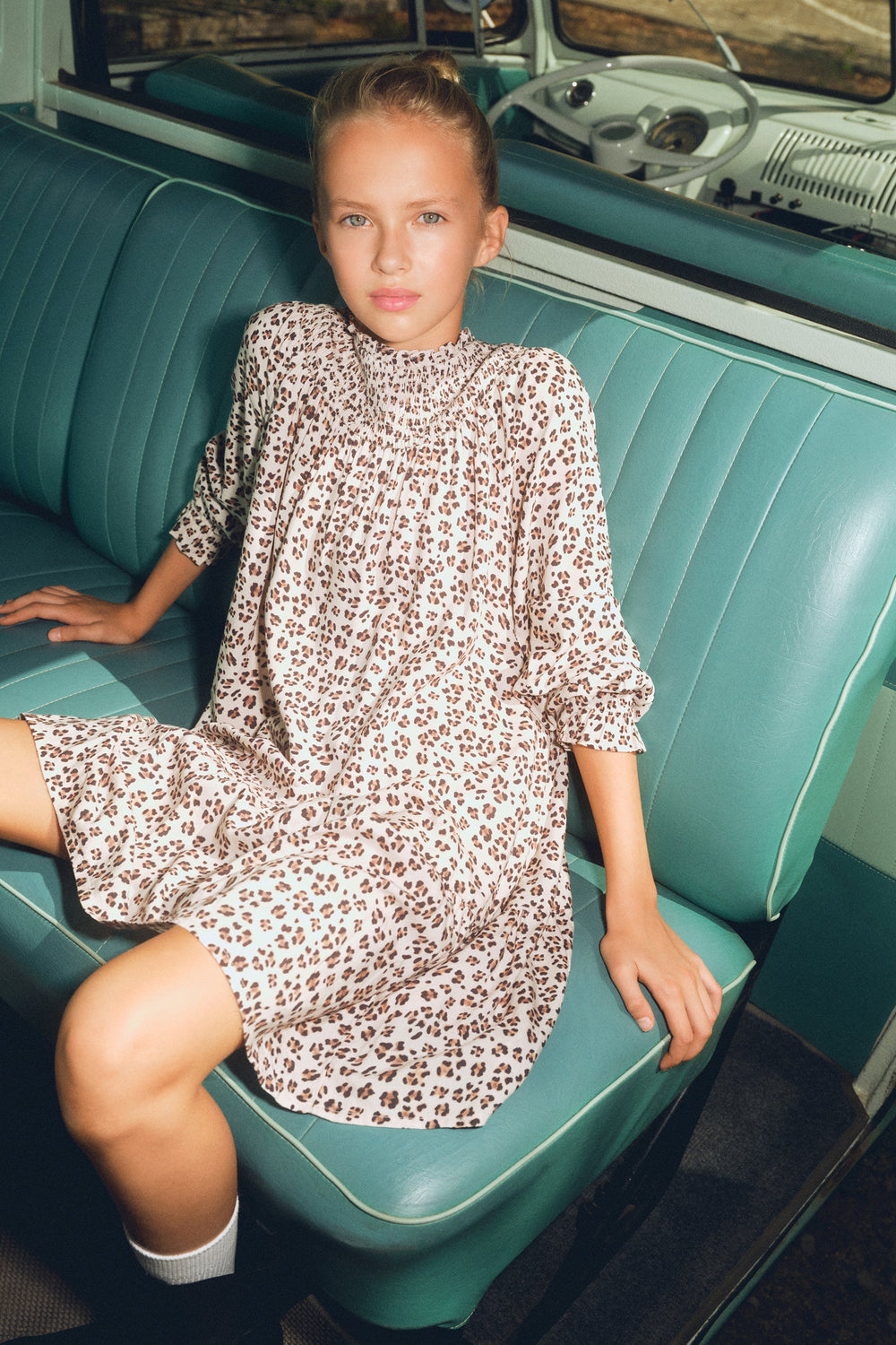 Animal print dress. Slightly puffed long sleeves. Smocking collar and button fastening.