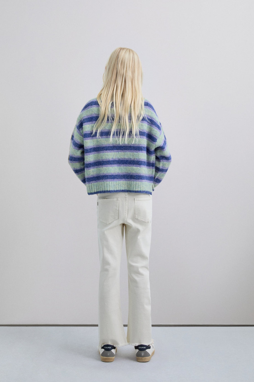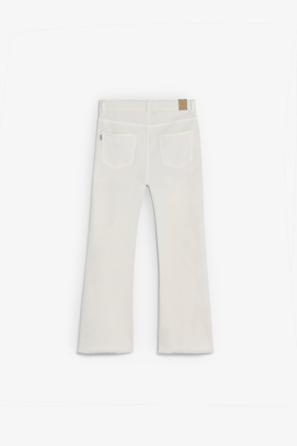 Trousers made of slightly stretchy cotton. Flared. Button fastening with skull logo details. Front pockets and back patch pockets Finished with fringing and front stitching.
