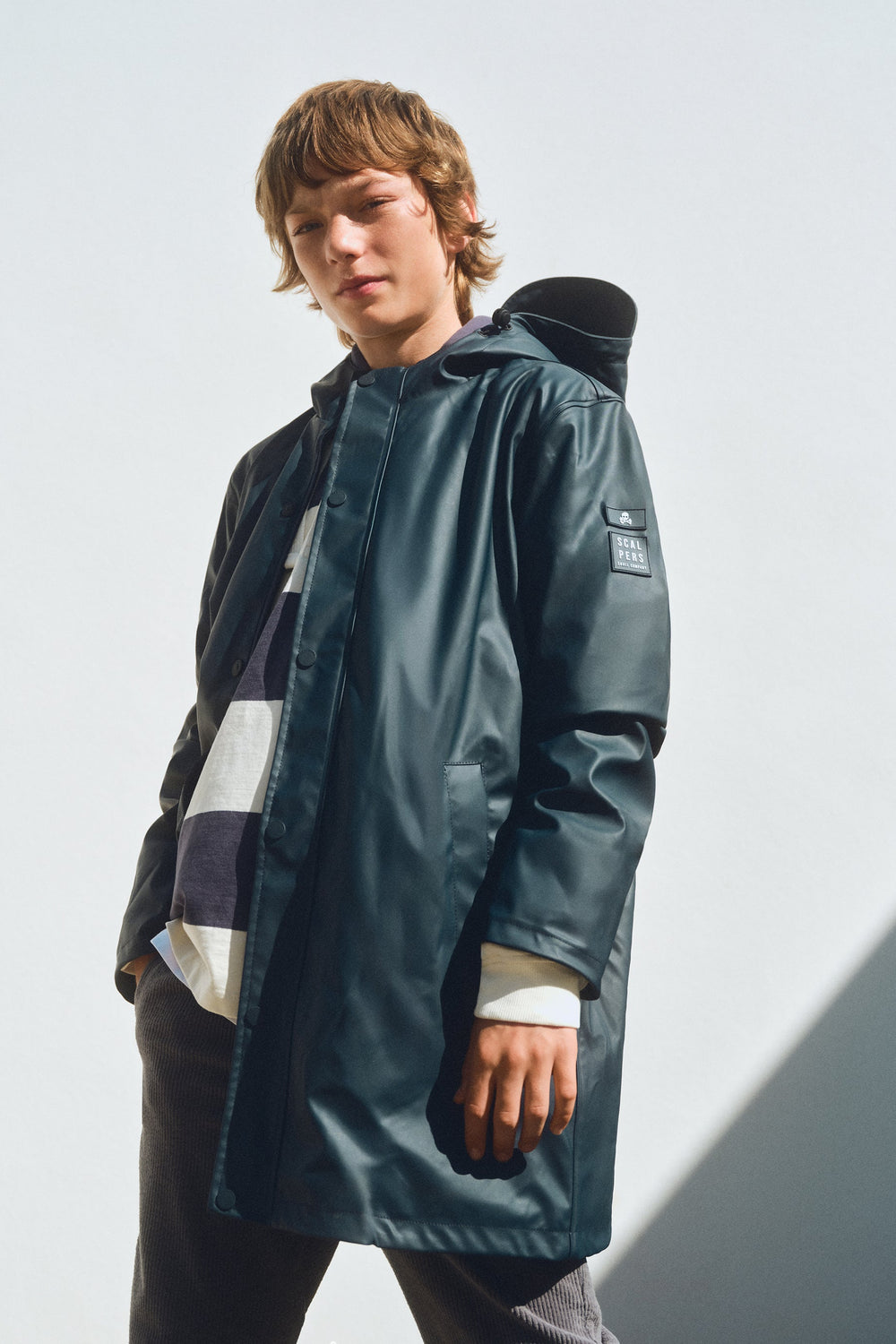 Waterproof parka with adjustable hood. Side pockets with placket and snap button. Synthetic lining. Rubber logo patch detail and skull. Button fastening. Long sleeves.