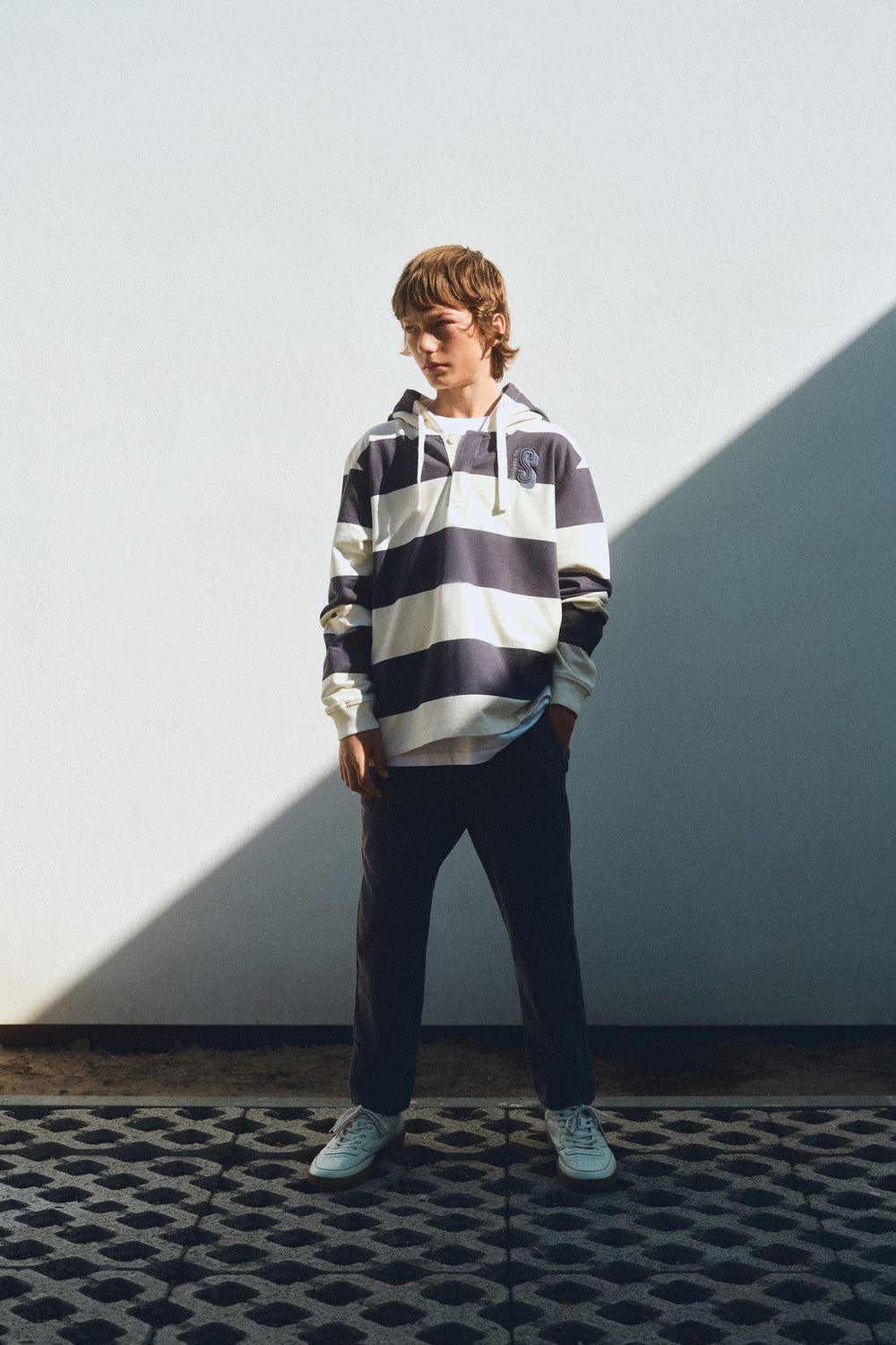 Straight corduroy trousers made of a slightly stretch cotton blend fabric Button closure. Front and back slanted pockets. Back label detail with logo.
