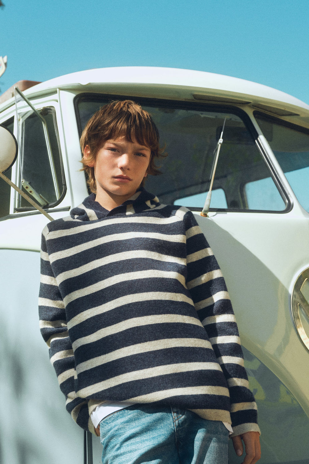 Hooded knit sweater made of a wool blend. Stripe print. Long sleeves. Contrast embroidered skull on the hem.