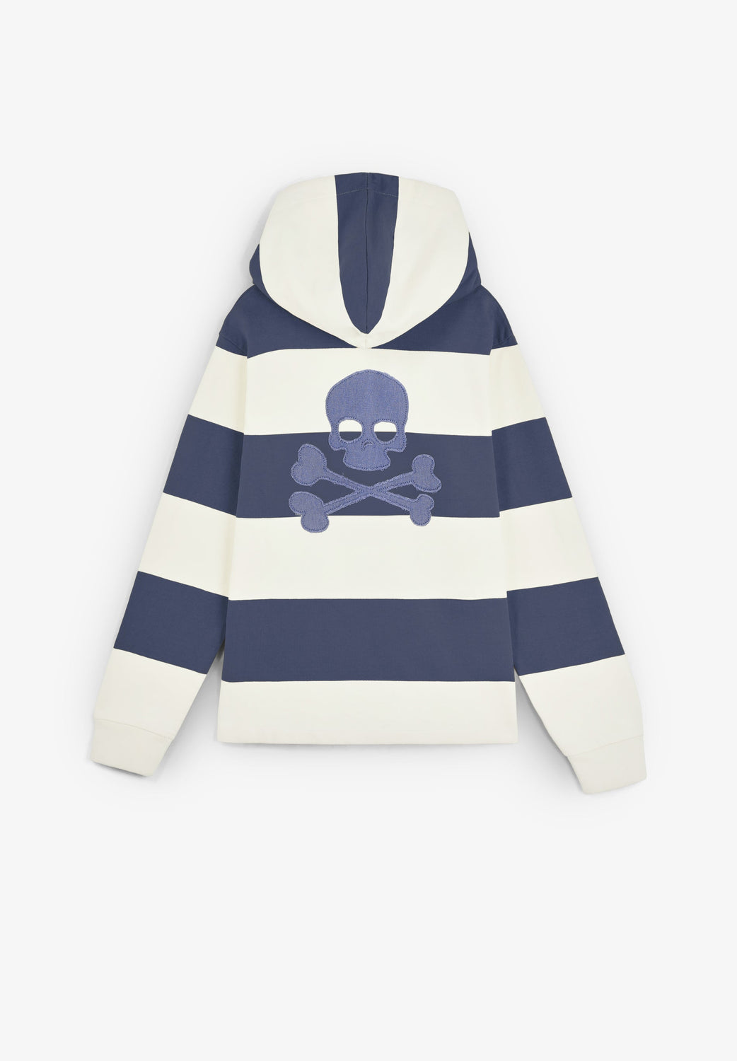 Sweatshirt with adjustable drawstring hood, made of 100% BCI cotton. Stripe print. Embroidered motif on chest and skull on back. Half neck with front button.