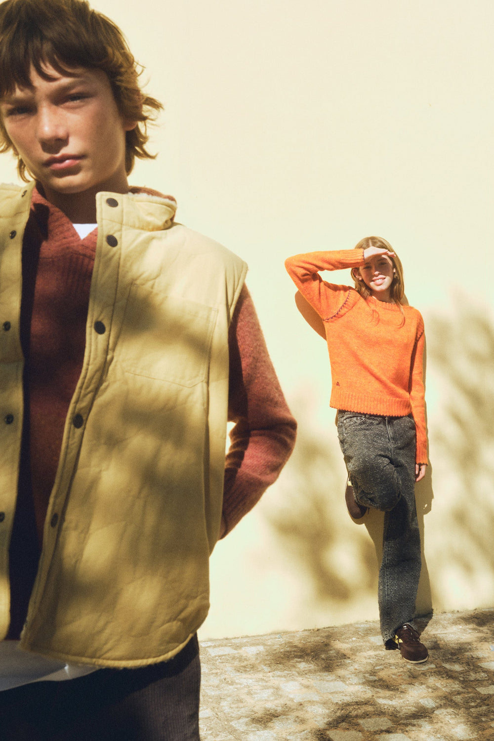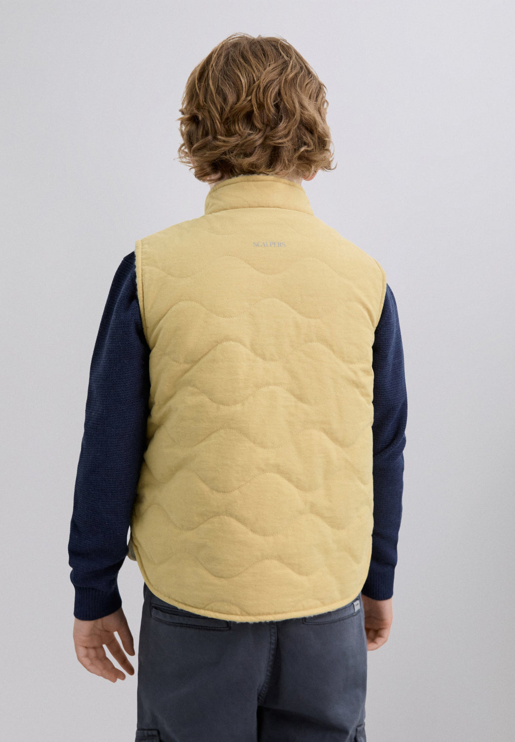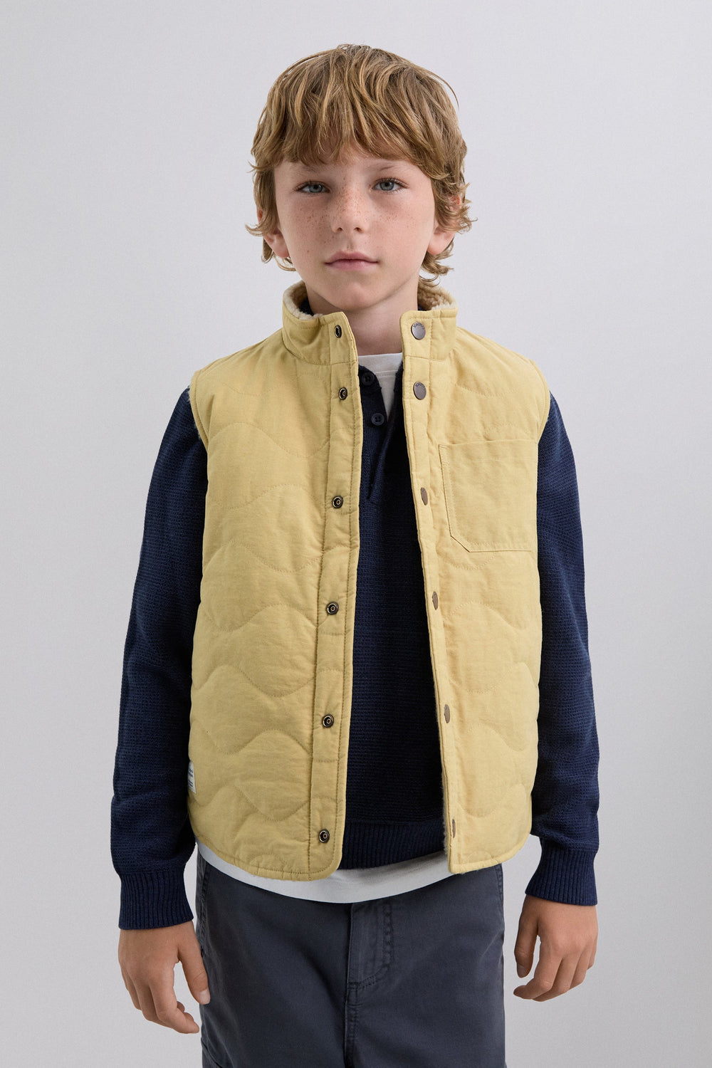 Puffer gilet made of cotton and nylon blend with outer pocket. Shearling lining made from recycled material. High collar. Regular fit. Button fastening.