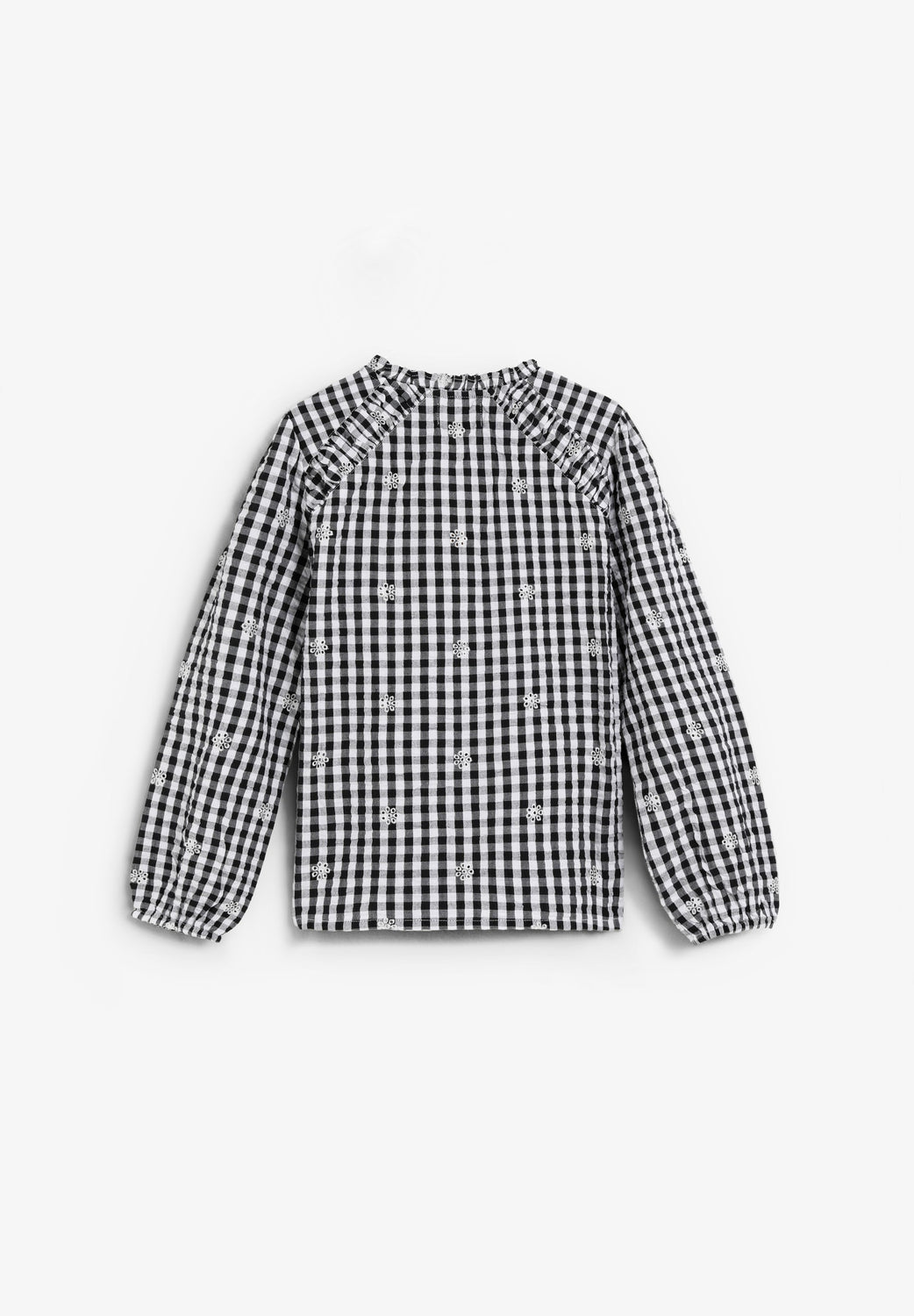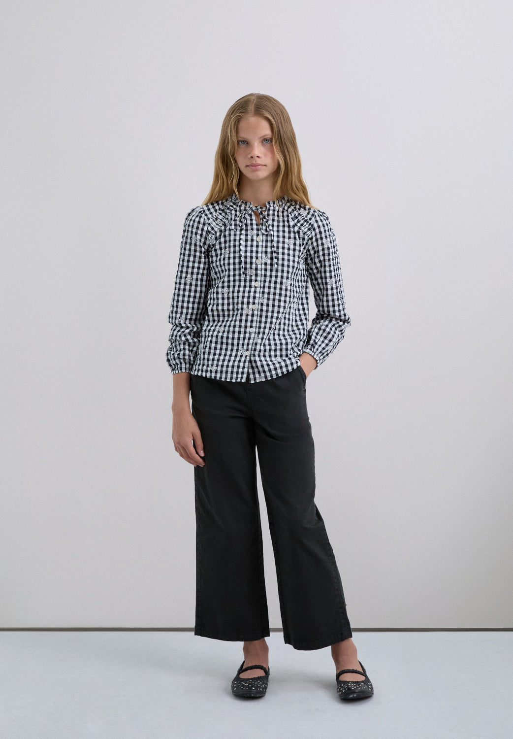 Shirt made of 100% BCI cotton. Long sleeves. Adjustable front tie and button fastening. Embroidered details.