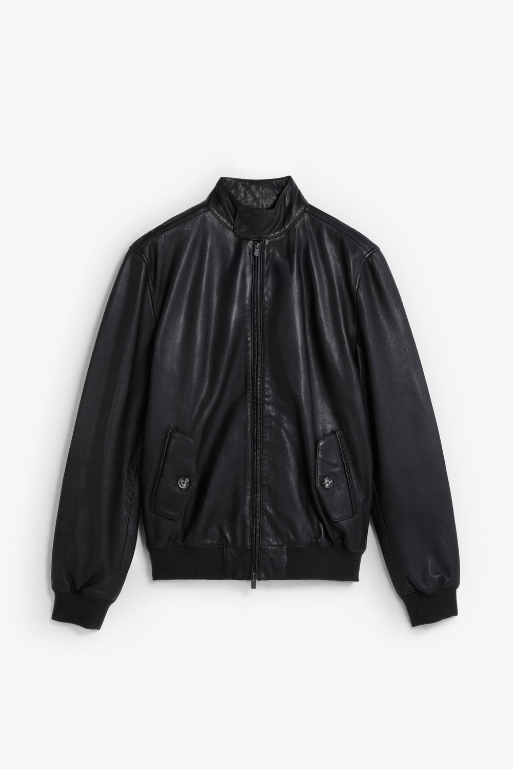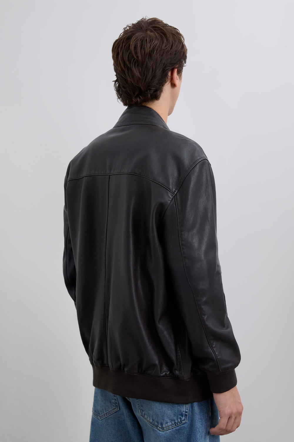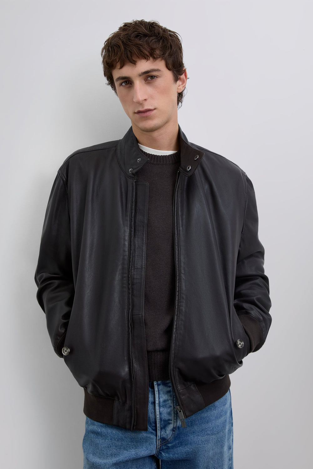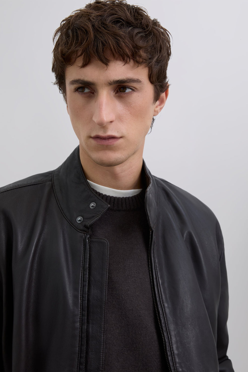 Jacket made of 100% leather. Long sleeves. Front double slider zip fastening. Raised collar with double clasp fastening. Two front pockets with flap and button. Ribbed cuffs and hem.