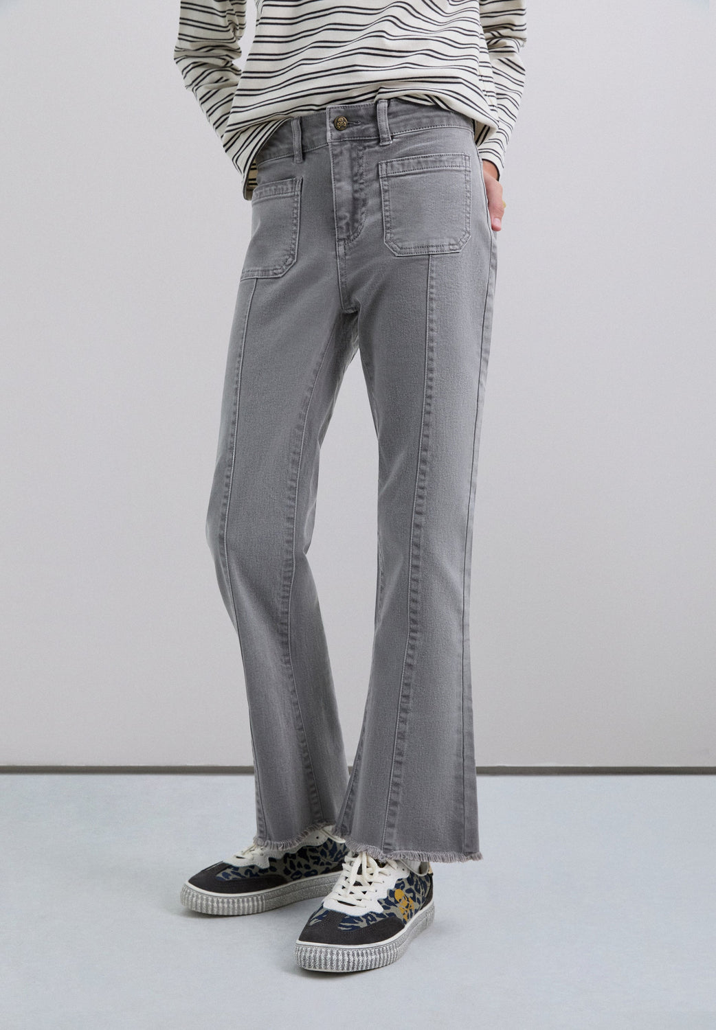 Flared trousers made of BCI cotton. Button and zip fastening. Belt loops at the waist. Front and back pockets. Seam detail on the front. Side slit and frayed hems.