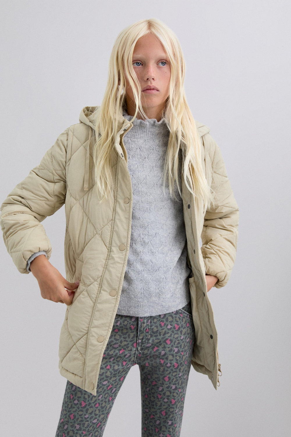 Padded coat. Detachable hood and sleeves. Front zip fastening concealed by placket with press stud fastening. Side pockets. Recycled fleece lining. Logo detail on the back.