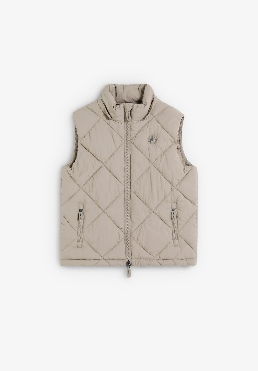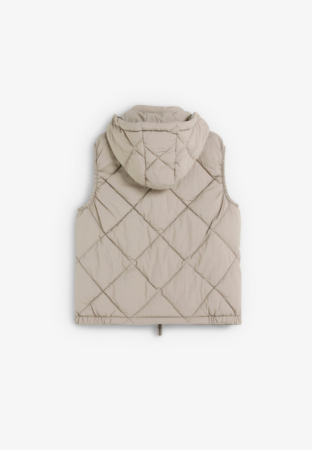 Heavy-duty padded waistcoat with adjustable hood. Double slider zip fastening. Rubberised skull detail on chest. Zip pockets and an inner pocket