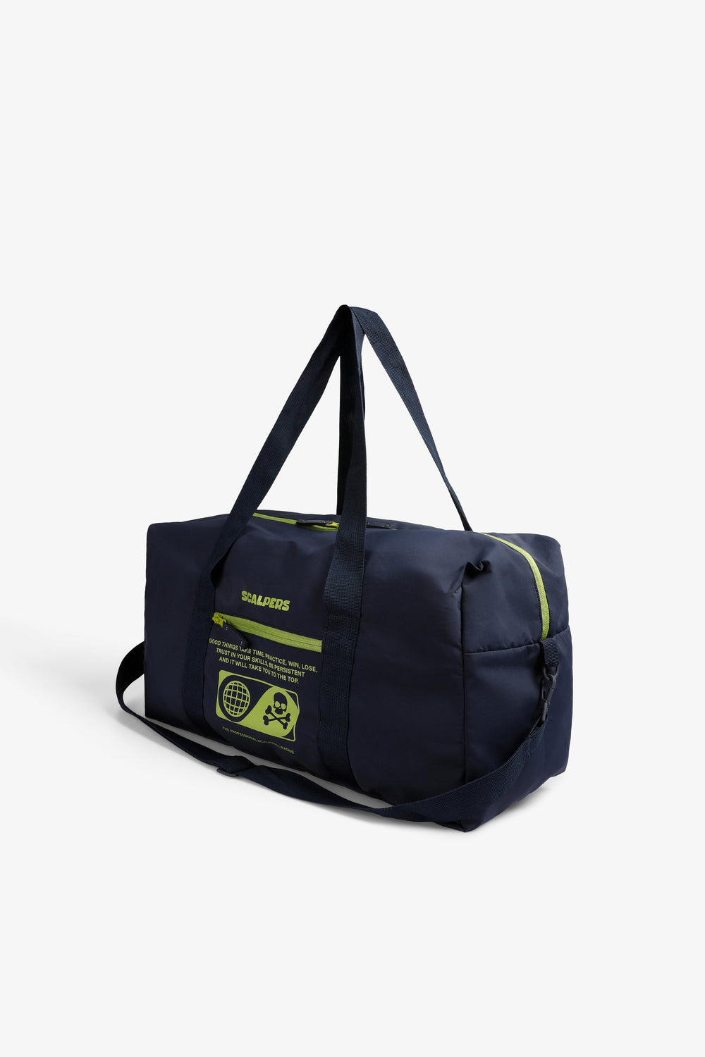 Bag made of a technical fabric. Main and side compartments with zip closure. Zip fastening, short handles and long detachable strap. Front logo and skull print.