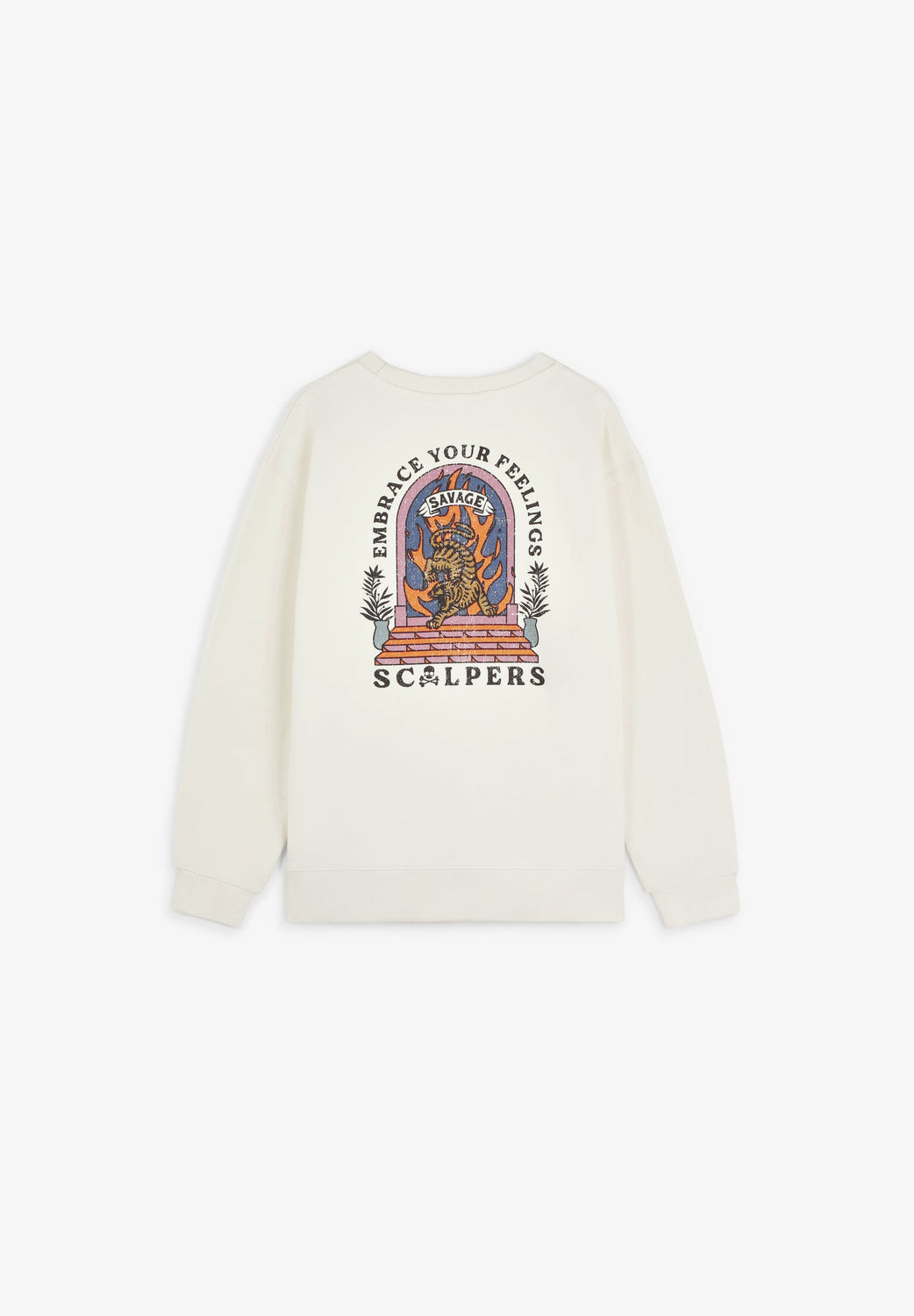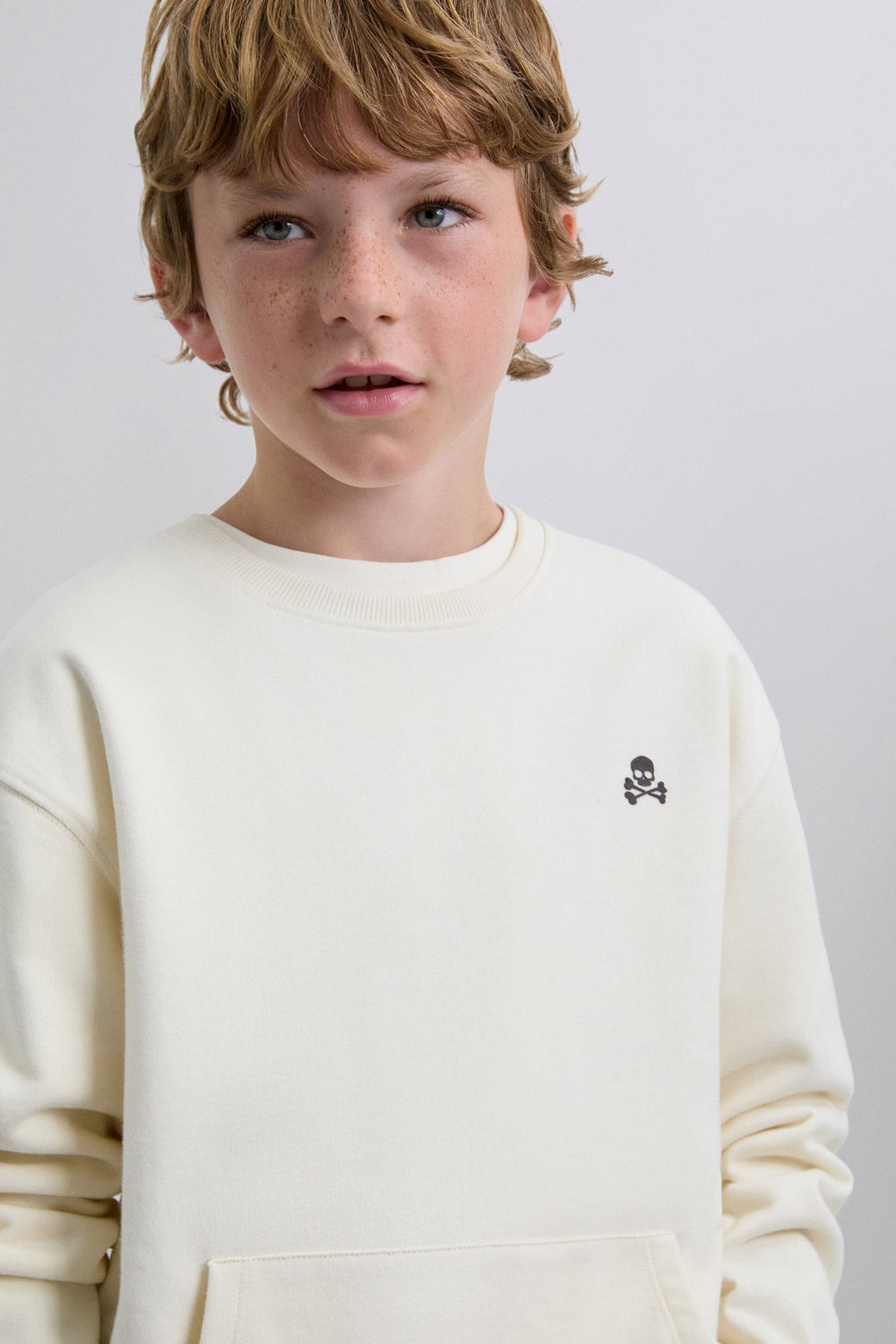Sweatshirt made of 100% BCI cotton. Back print and skull detail on chest. Round neck. Long sleeves with cuffs and front pouch pockets.