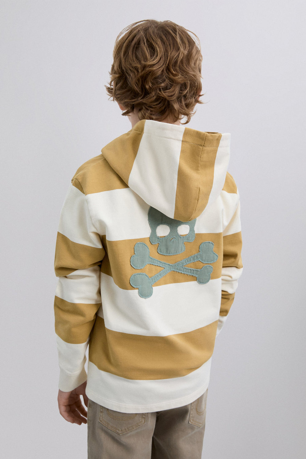 Sudadera con capucha ajustable mediante cordón confeccionada en 100% algodón BCI. Estampado de rayas. Print con logo en pecho y calavera bordada en espalda. Abertura media parte frontal.