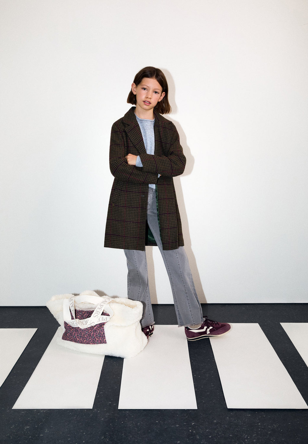 Checked cloth coat. Lapel collar. Button fastening. Long sleeves. Jetted flap pockets.