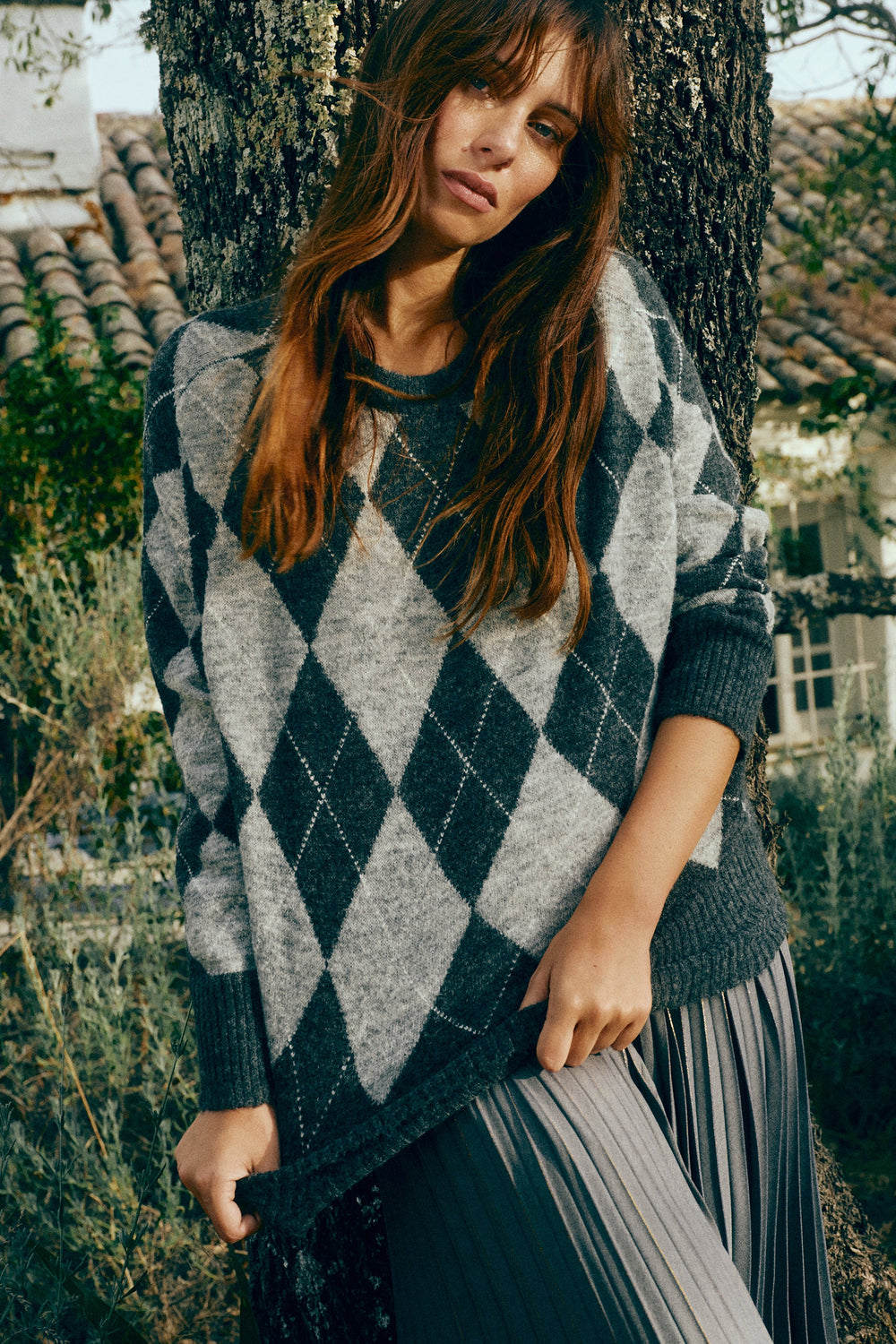 Diamond pattern sweater in a wool blend. Regular fit. Round neck and long sleeves with ribbed trim.