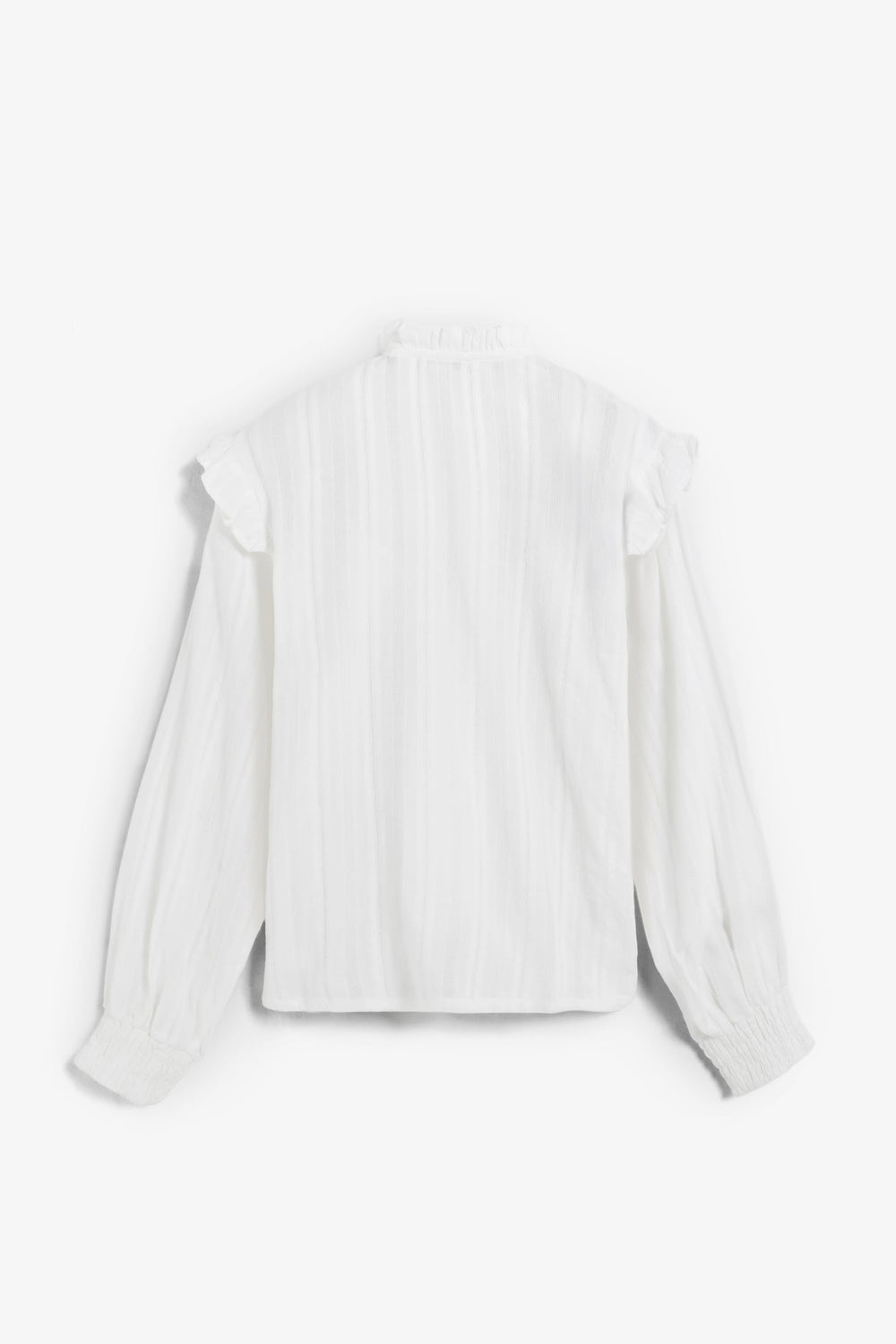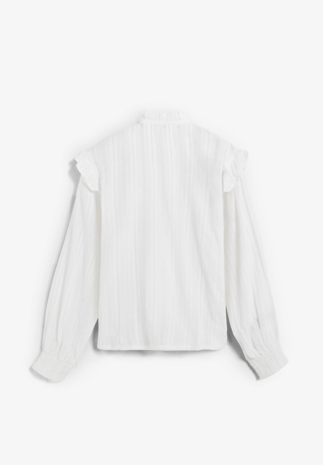 Long sleeve blouse made of 100% cotton. Classic collar and ruffle in smocked fabric. Mother-of-pearl buttons.