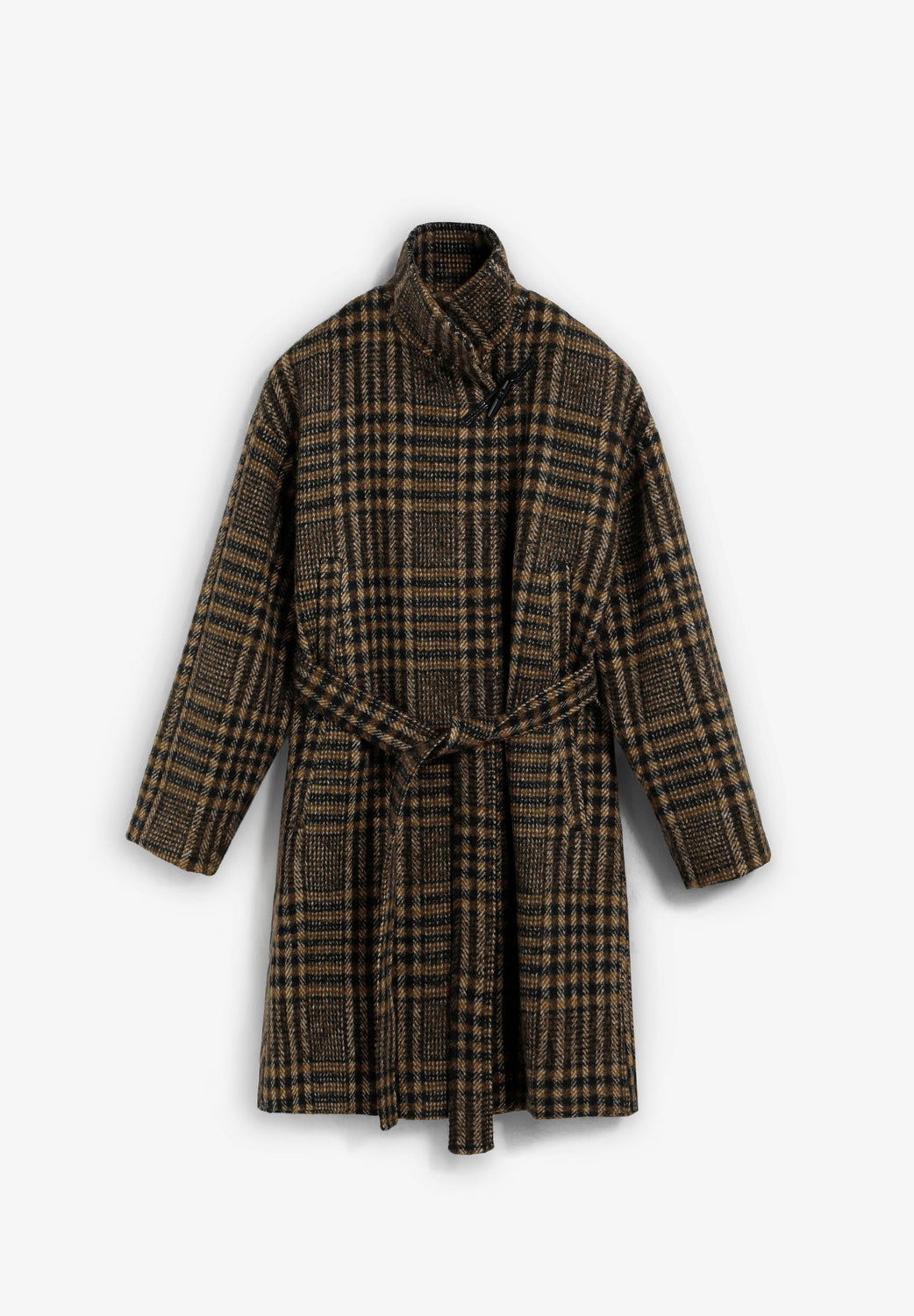 Shirt check print coat made of wool. High collar. Toggle style button at the top. Inner fastening with 2 buttons and outer fastening with adjustable belt. Long sleeves with turn-back cuffs.