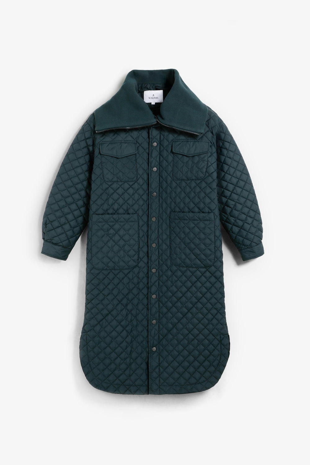 Long quilted waterproof puffer coat with small diamond-shaped stitching. Long sleeves. Detachable high collar. Four front pockets: two lower and two upper flap pockets.