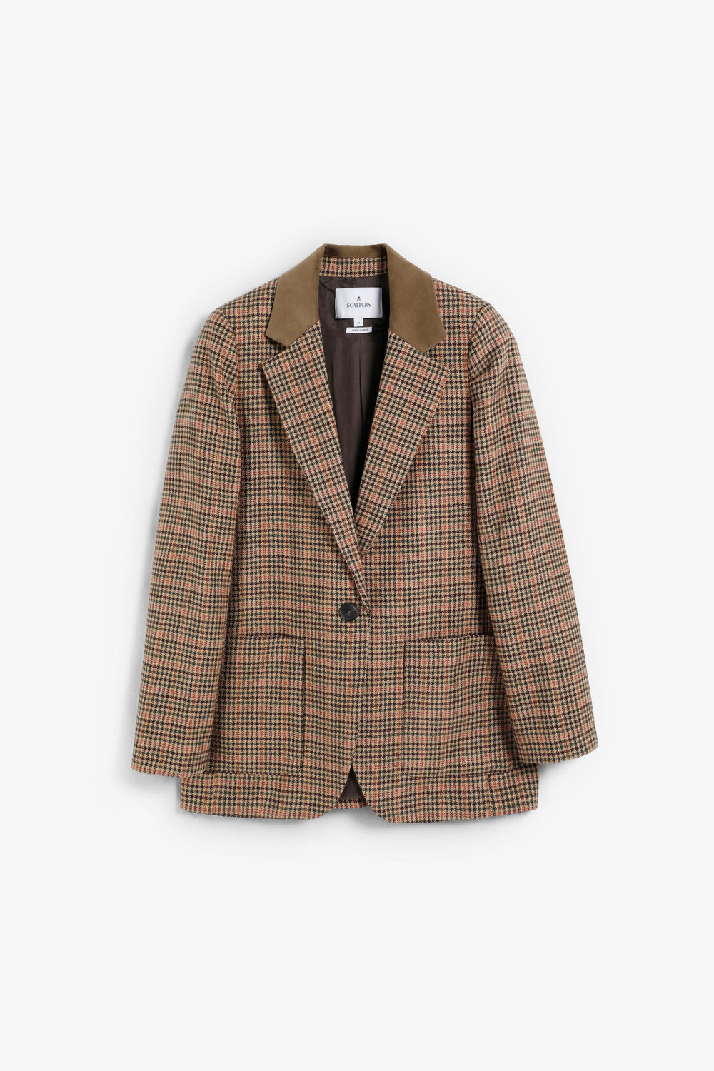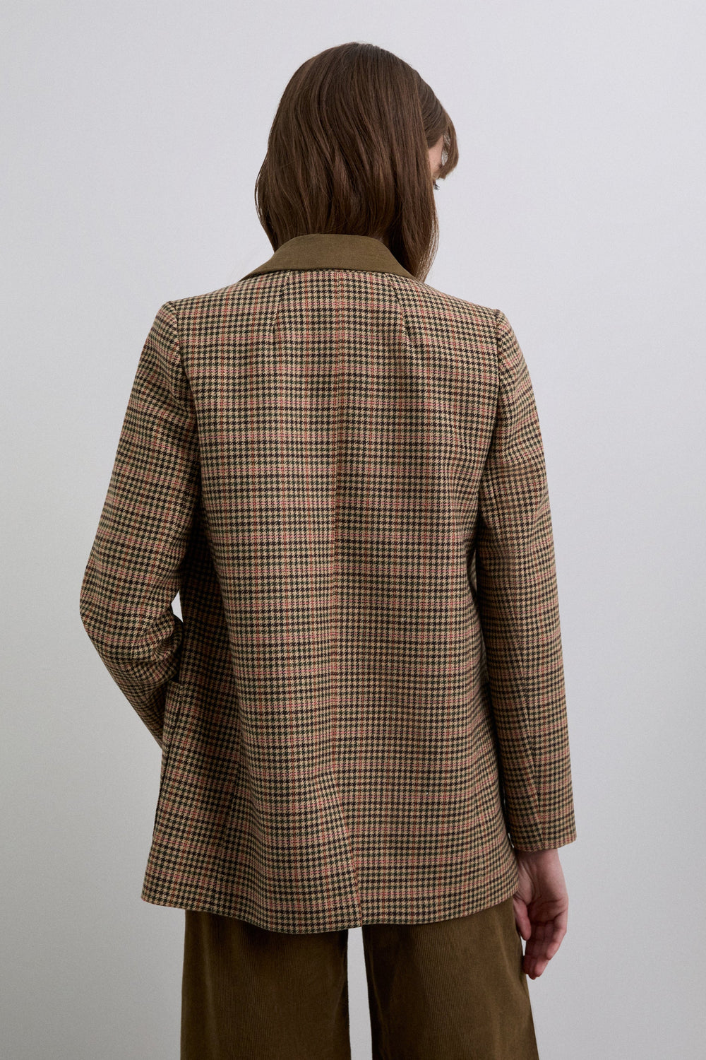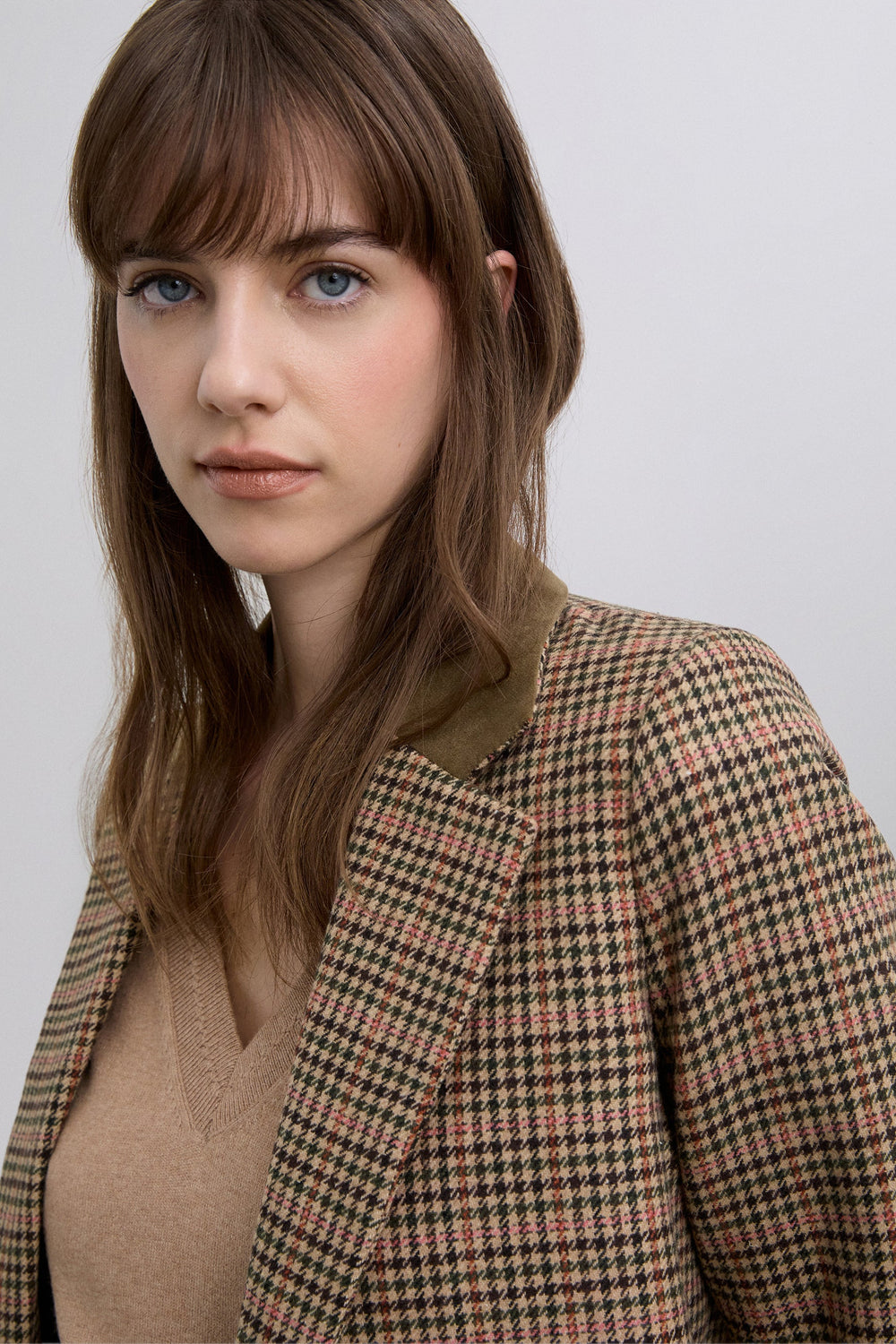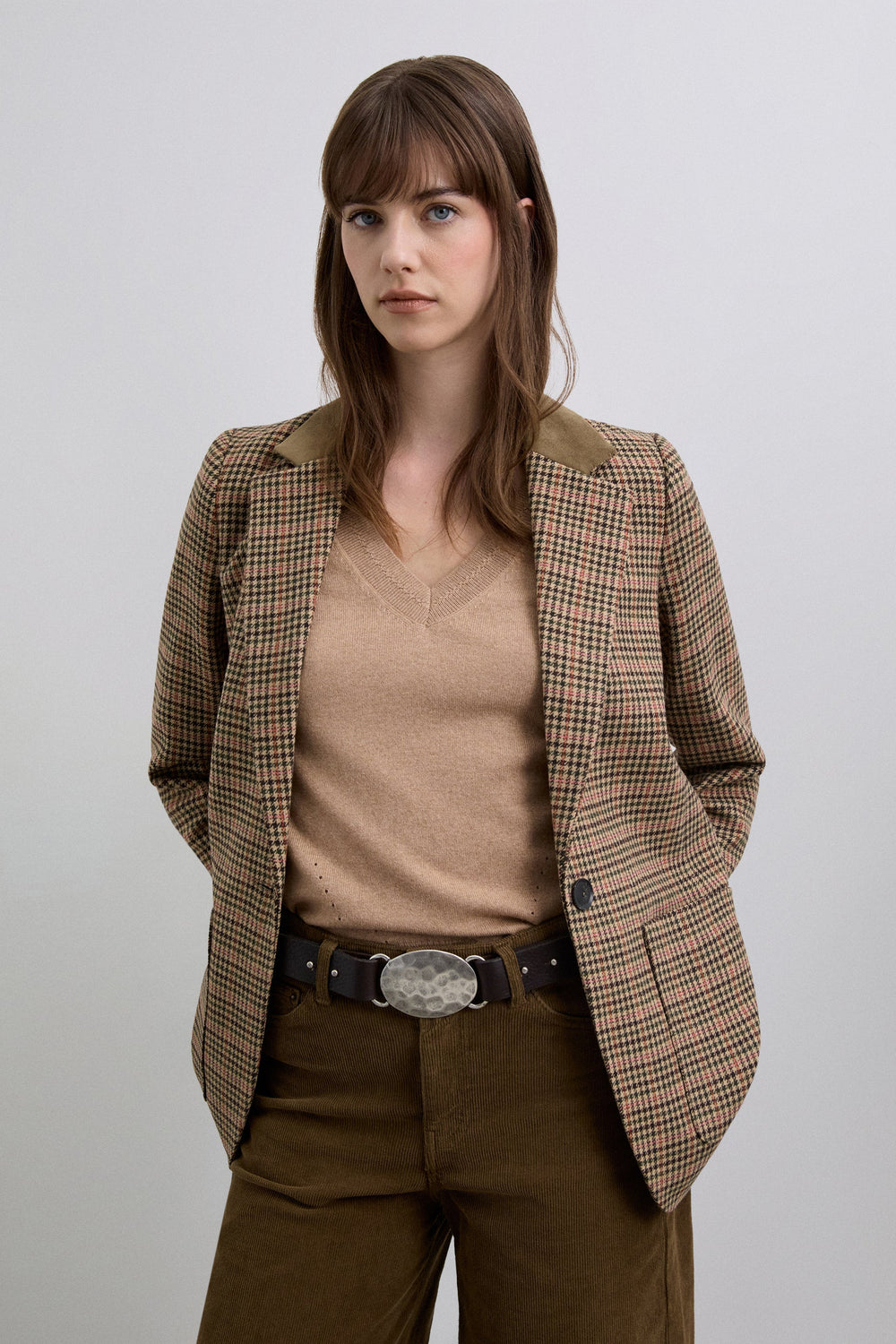 Blazer with contrast lapel detailing. Prince of Wales check print. Made of a wool blend. Regular fit. Lapel collar. Button fastening. Long sleeves. Patch pockets.