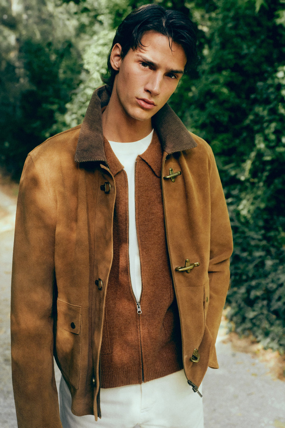 Jacket made of 100% leather. Long sleeves. Corduroy collar. Metal toggle and zip fastening at front. Two buttoned patch pockets.