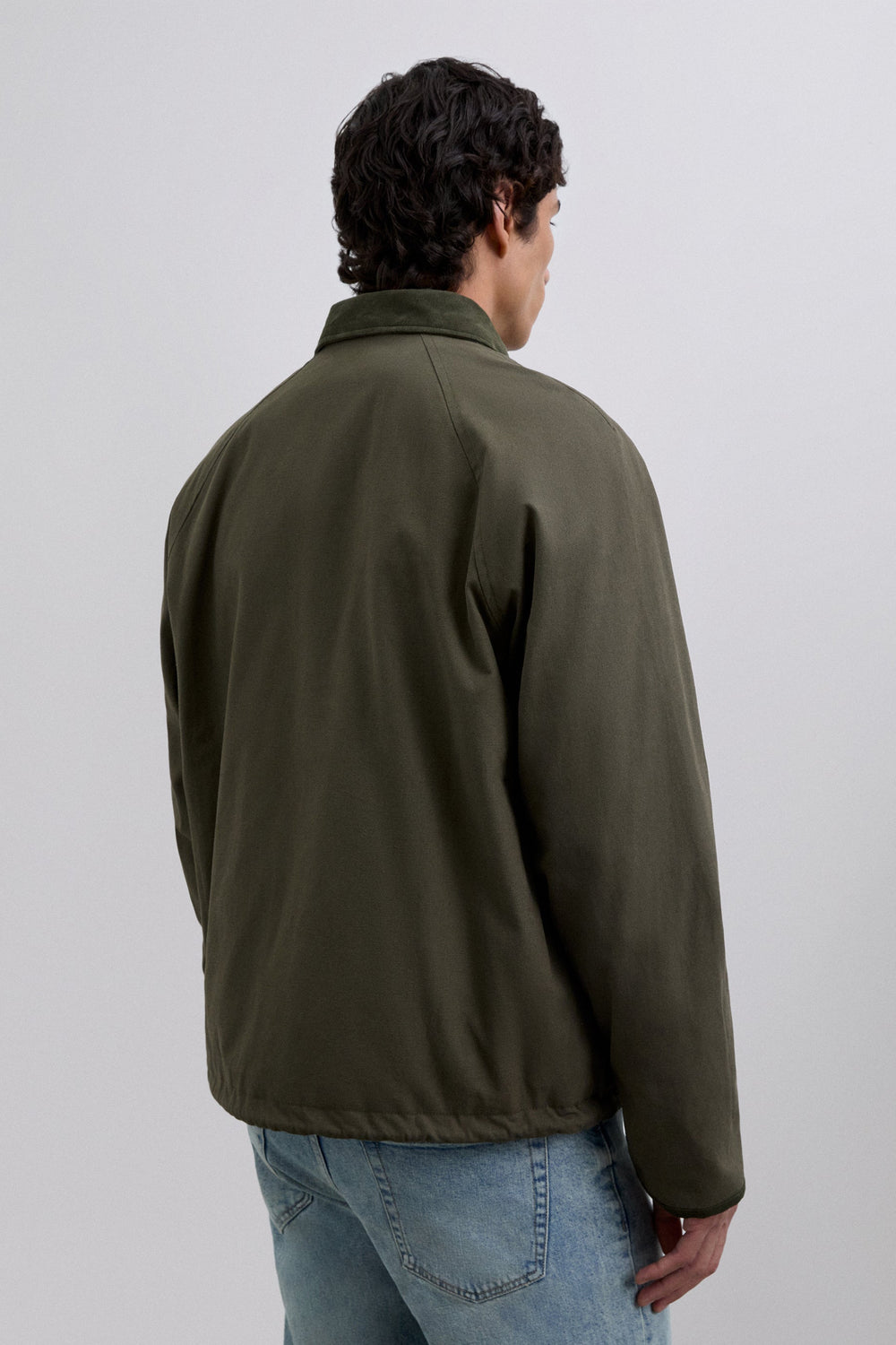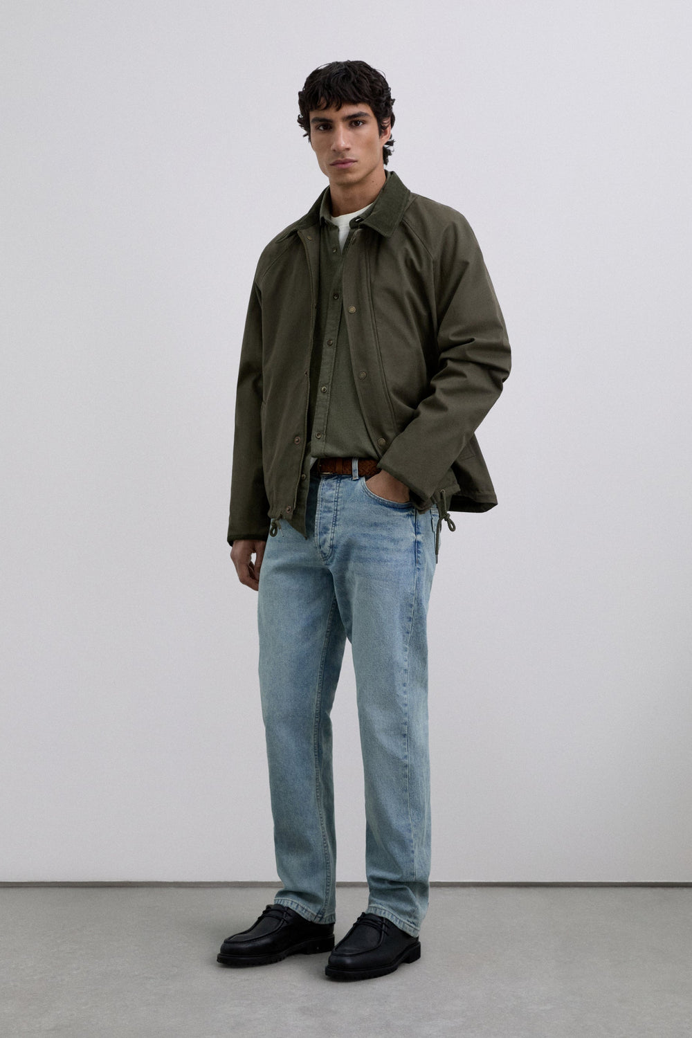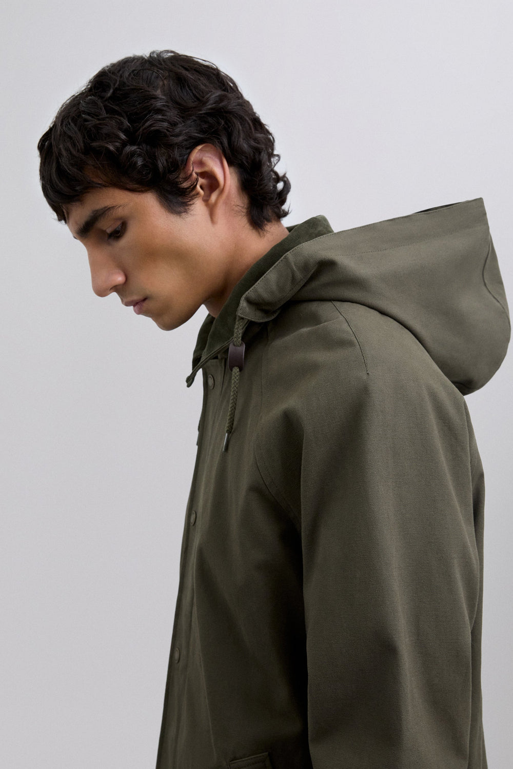 Jacket made of 100% BCI cotton. Adjustable and detachable hood. Zip and button fastening. Ribbed inner cuffs. The piped seam of the sleeve and collar are made of corduroy. Raglan sleeves. Two front pockets. Logo details on zip.