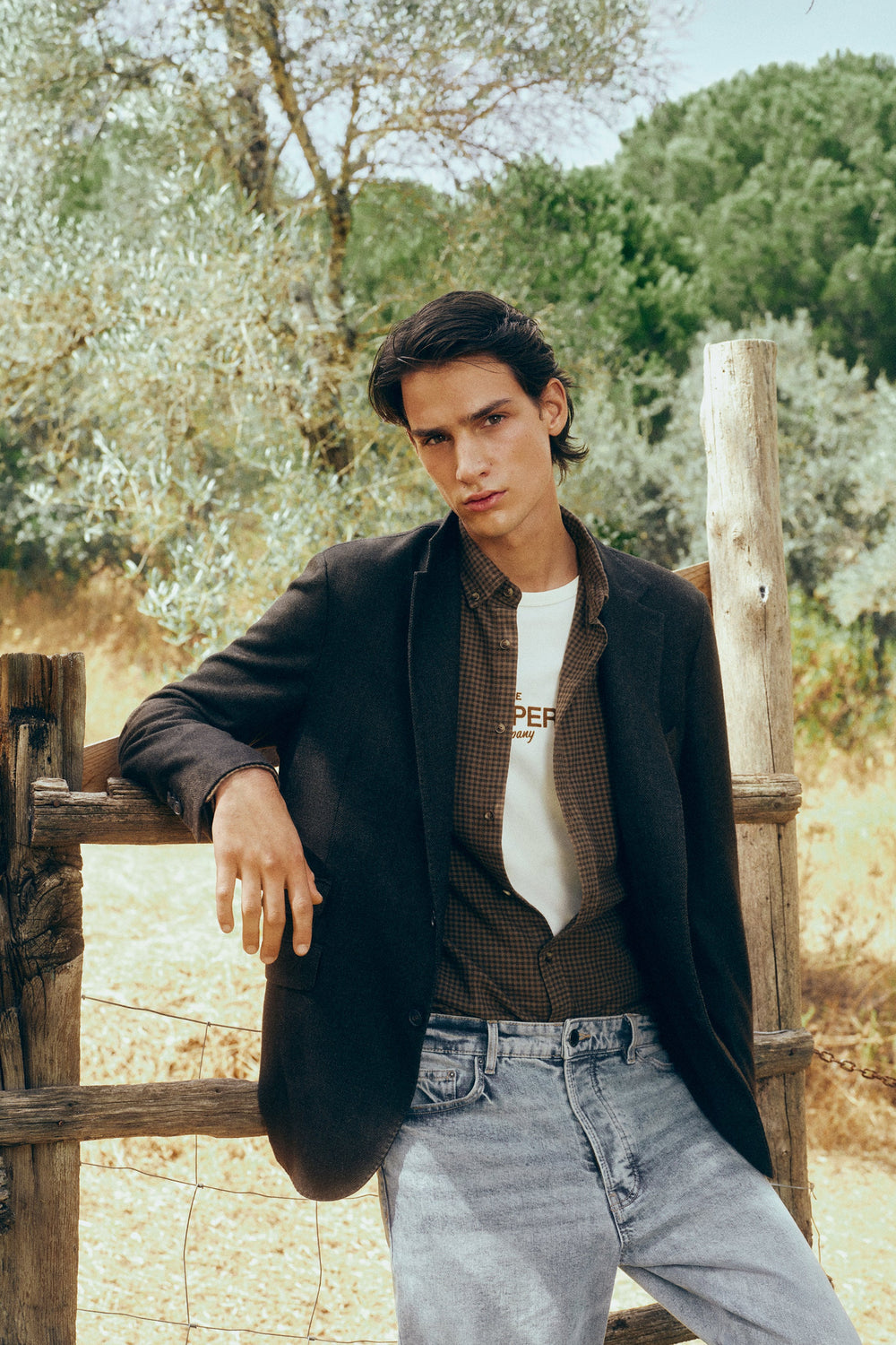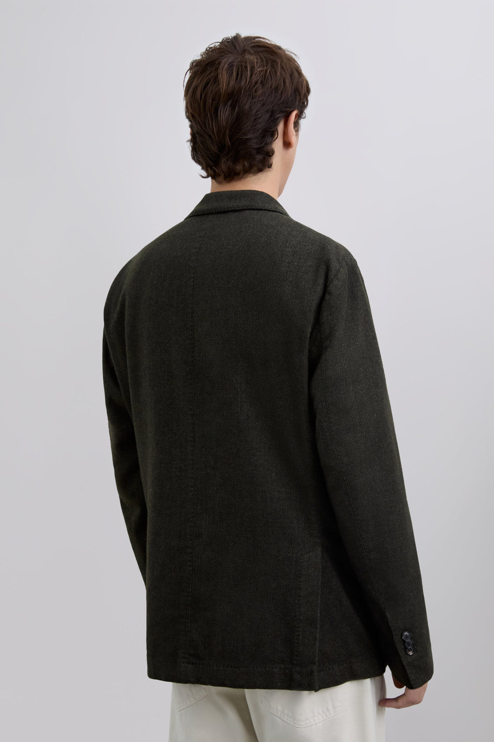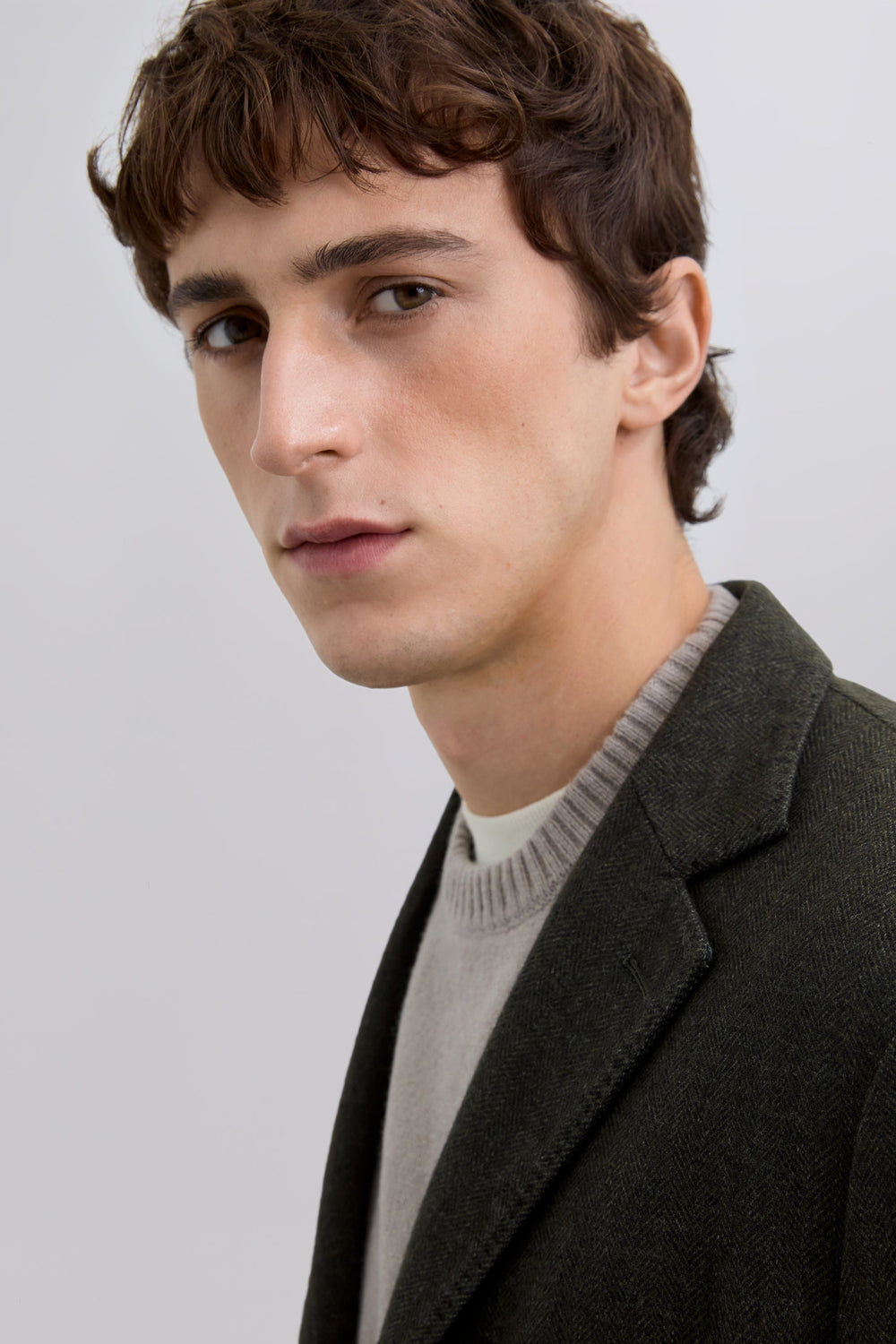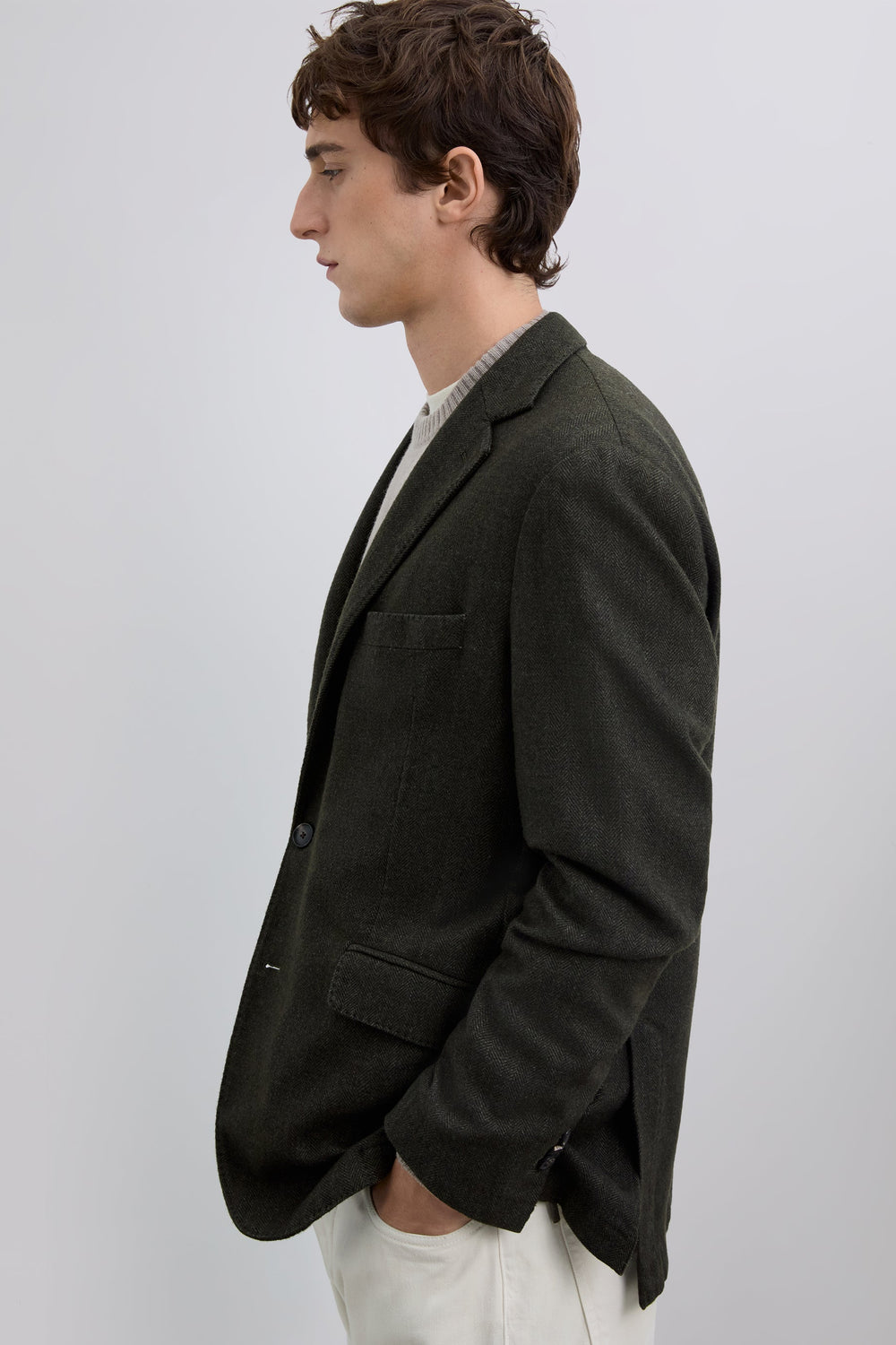 Blazer made of wool. Herringbone design. Three flap pockets. Two button fastening. Chest pocket with piping. Long sleeves.