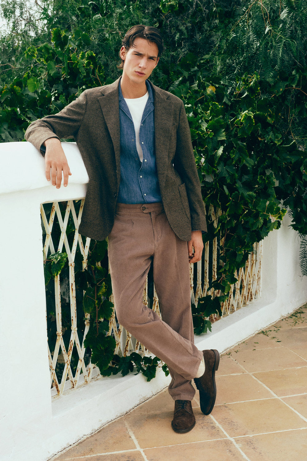 Darted corduroy trousers made of BCI cotton. Slim fit. Metal adjusters on the sides of the waistband; button and zip fastening. Two front pockets and two buttoned back pockets.