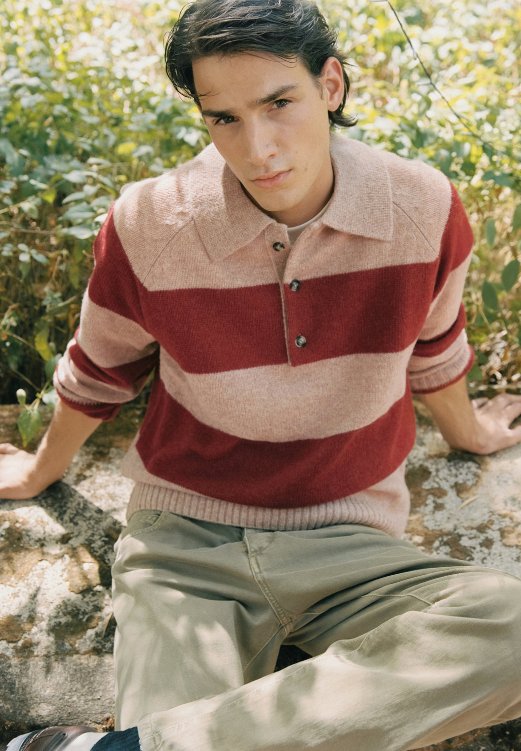 Sweater made of 100% wool. Polo shirt collar with buttons. Stripe print. Long sleeves. Regular fit.