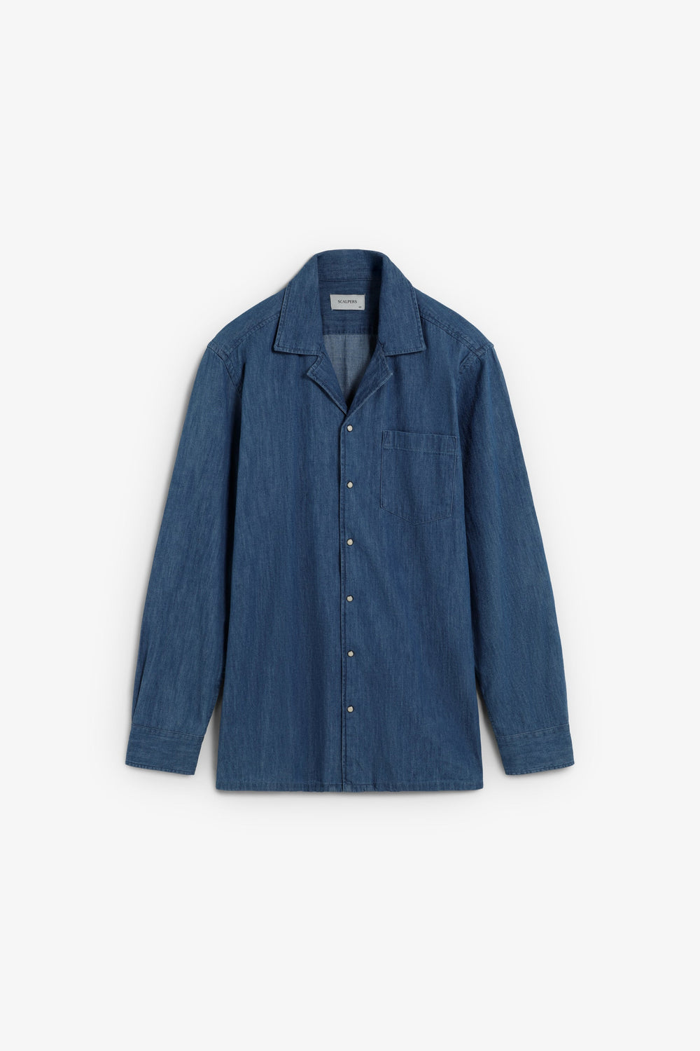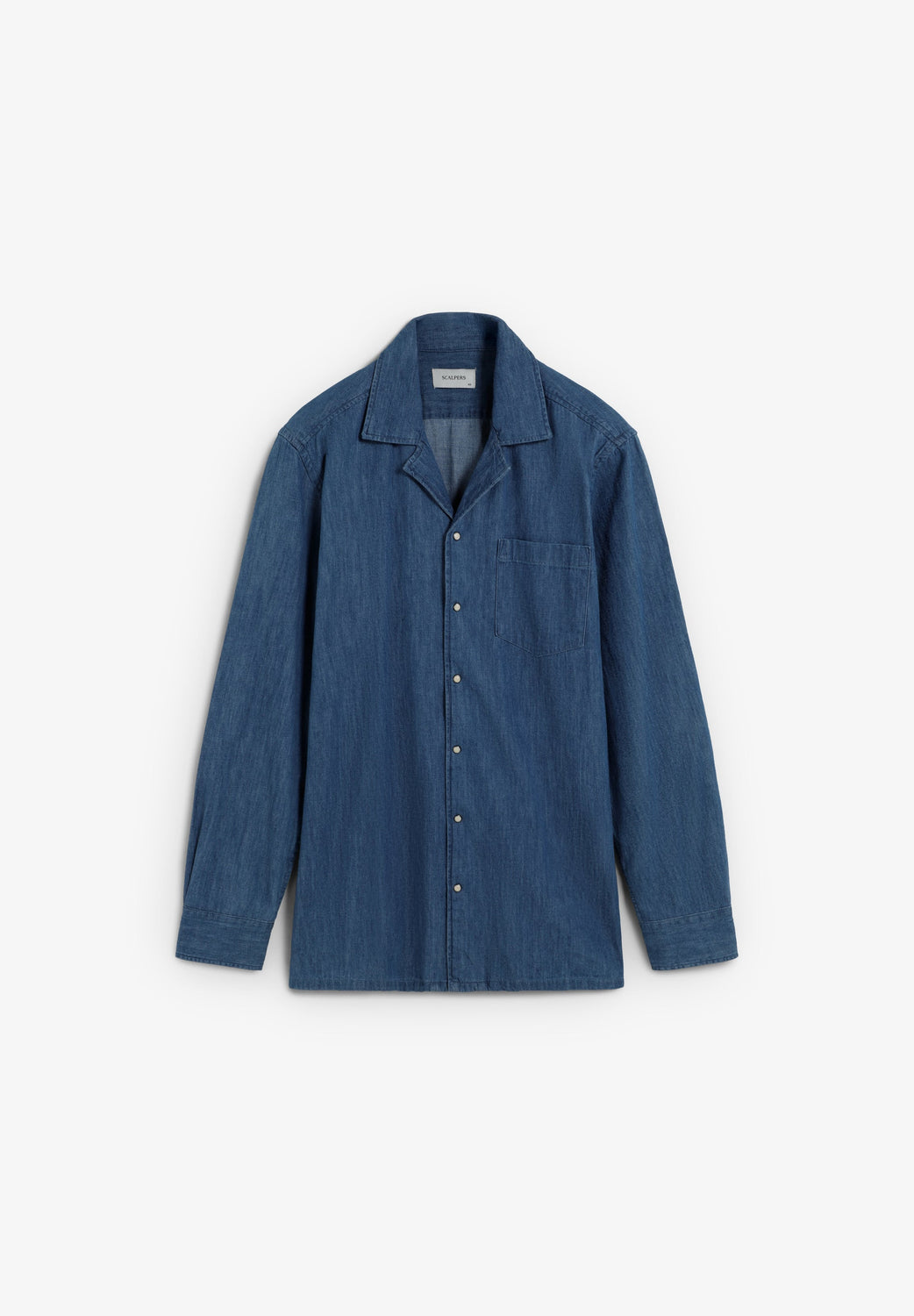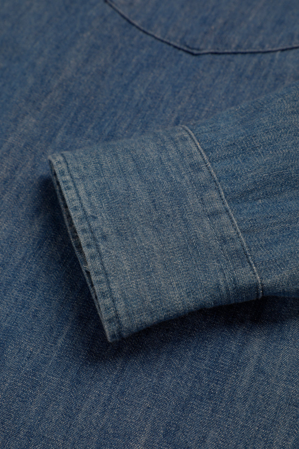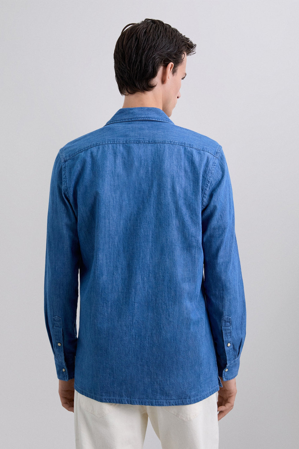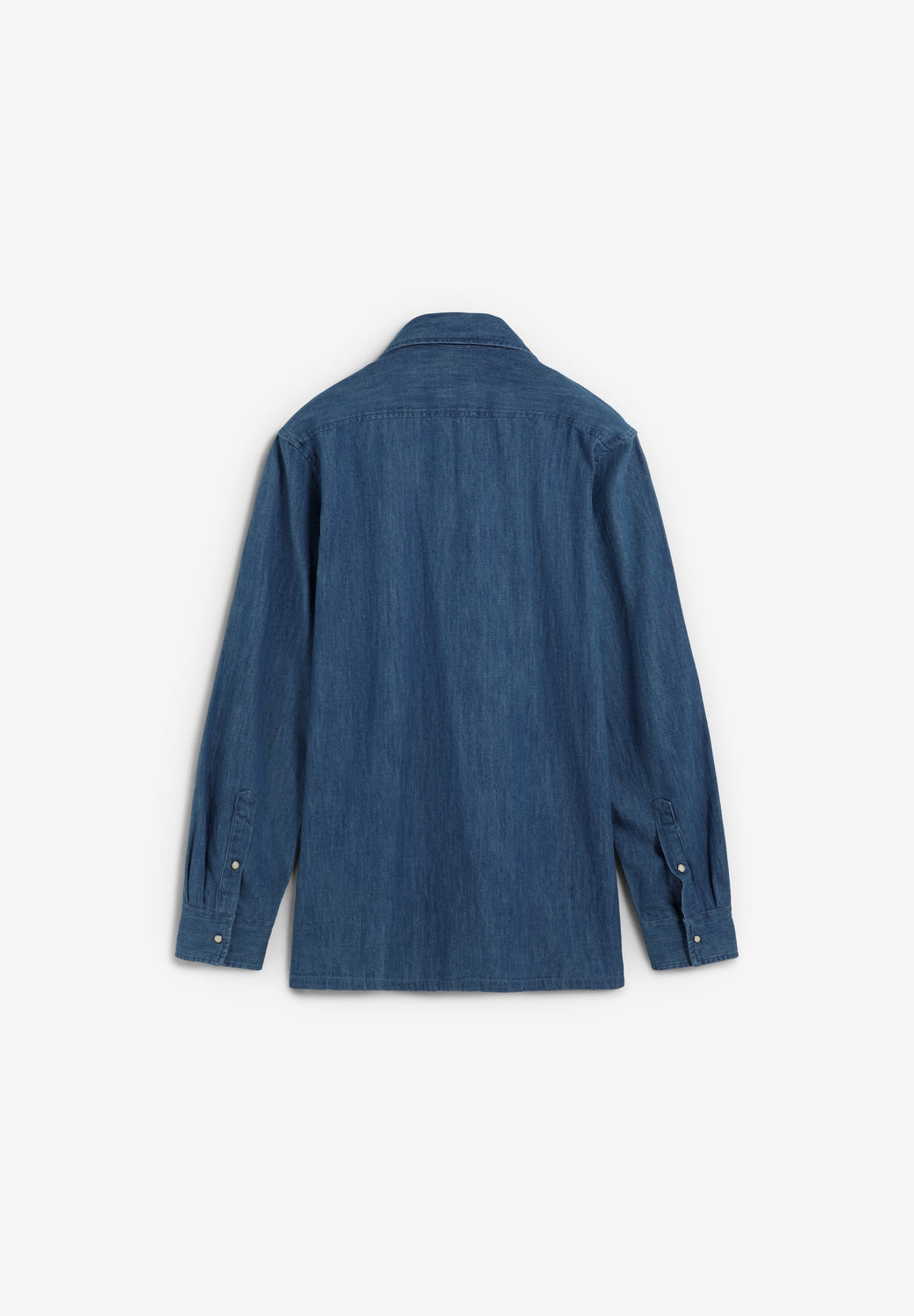 Denim shirt made of 100% BCI cotton. Regular fit. Shirt collar. Button-up front. Long sleeves. Buttoned cuffs. Chest pocket. Embroidered logo detail on the placket.
